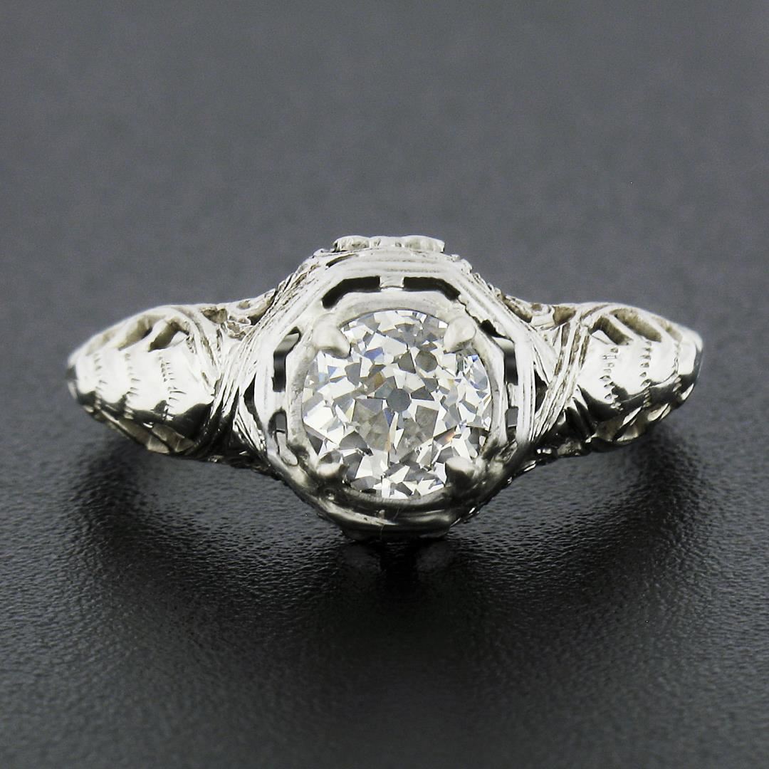 An antique solid 18k white gold engagement ring, with 1 GIA graded old european cut natural diamond (J - VS2 ; 0.94ct). The ring is size 6.0, weighs a total of 3.06 grams, and measures 9.70mm wide. Comes with all original relevant certifications.