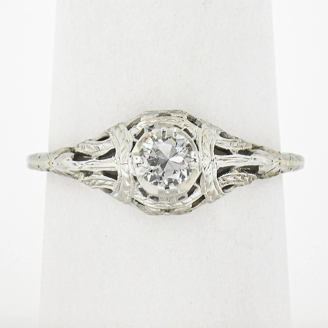 An antique solid 18k white gold solitaire ring, with 1 old european cut natural diamond (I - VS2 ; 0.26ct). The ring is size 7.5, weighs a total of 2.02 grams, and measures 7.7mm wide.