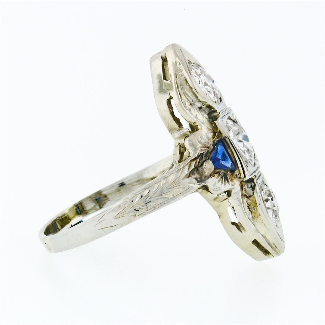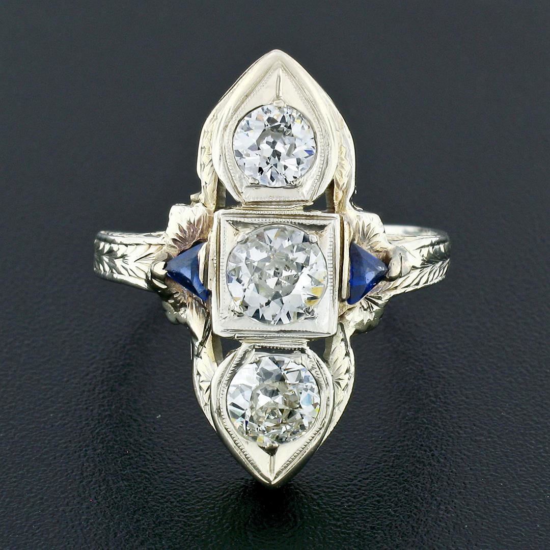 An antique art deco solid 20k white gold dinner ring, with 3 old european cut natural diamonds (G/H- VS2/SI1 ; 1.54ctw), and 2 triangular step cut synthetic sapphires.The ring is size 8, weighs a total of 4.82 grams, and measures 23.8mm wide.