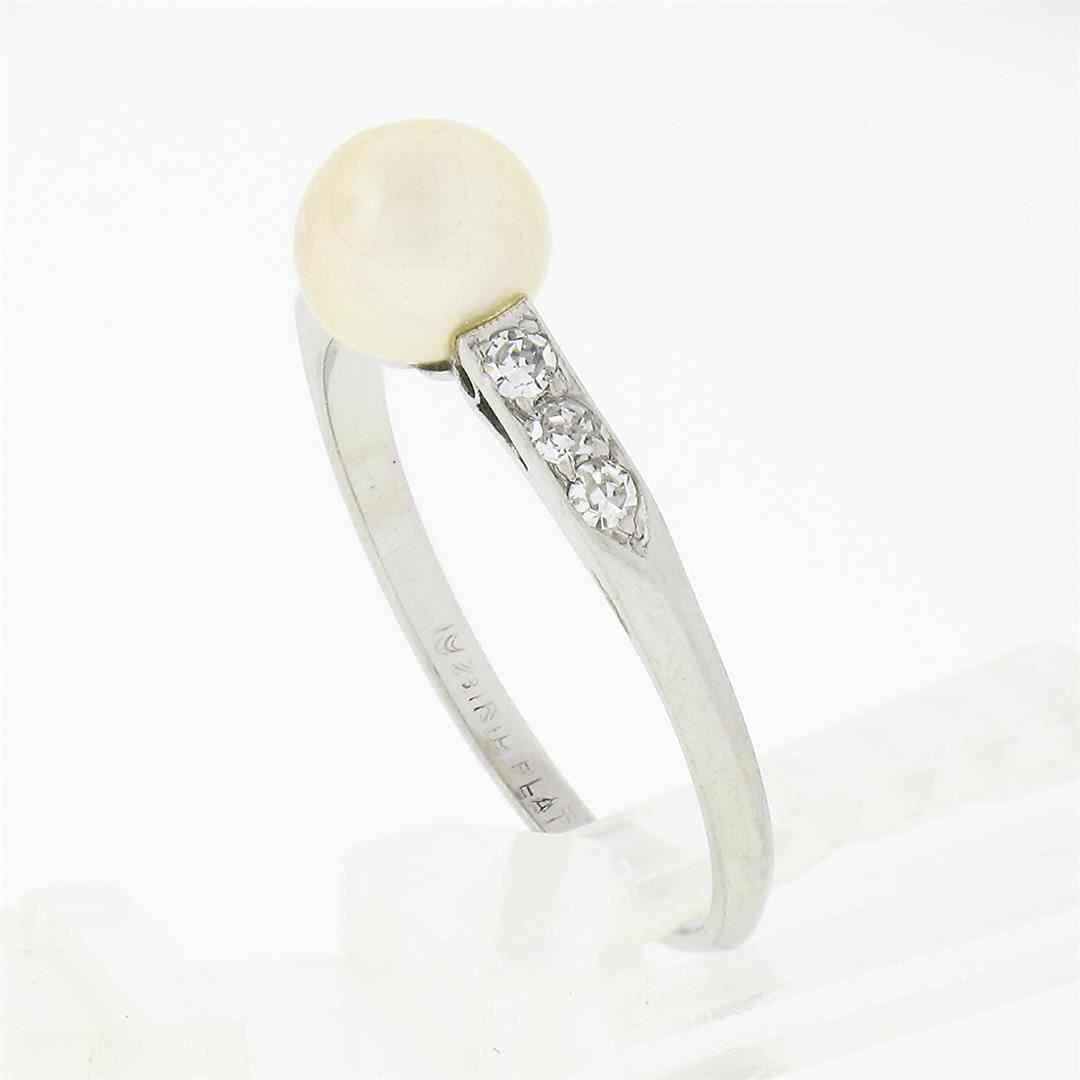 An antique art deco solid platinum solitaire ring, with 1 round shape cultured pearl (5.9mm), & 6 old single cut natural diamonds (G/H - VS1/VS2 ; 0.15ctw). The ring is size 5.5, weighs a total of 1.86 grams, and measures 5.9mm wide.