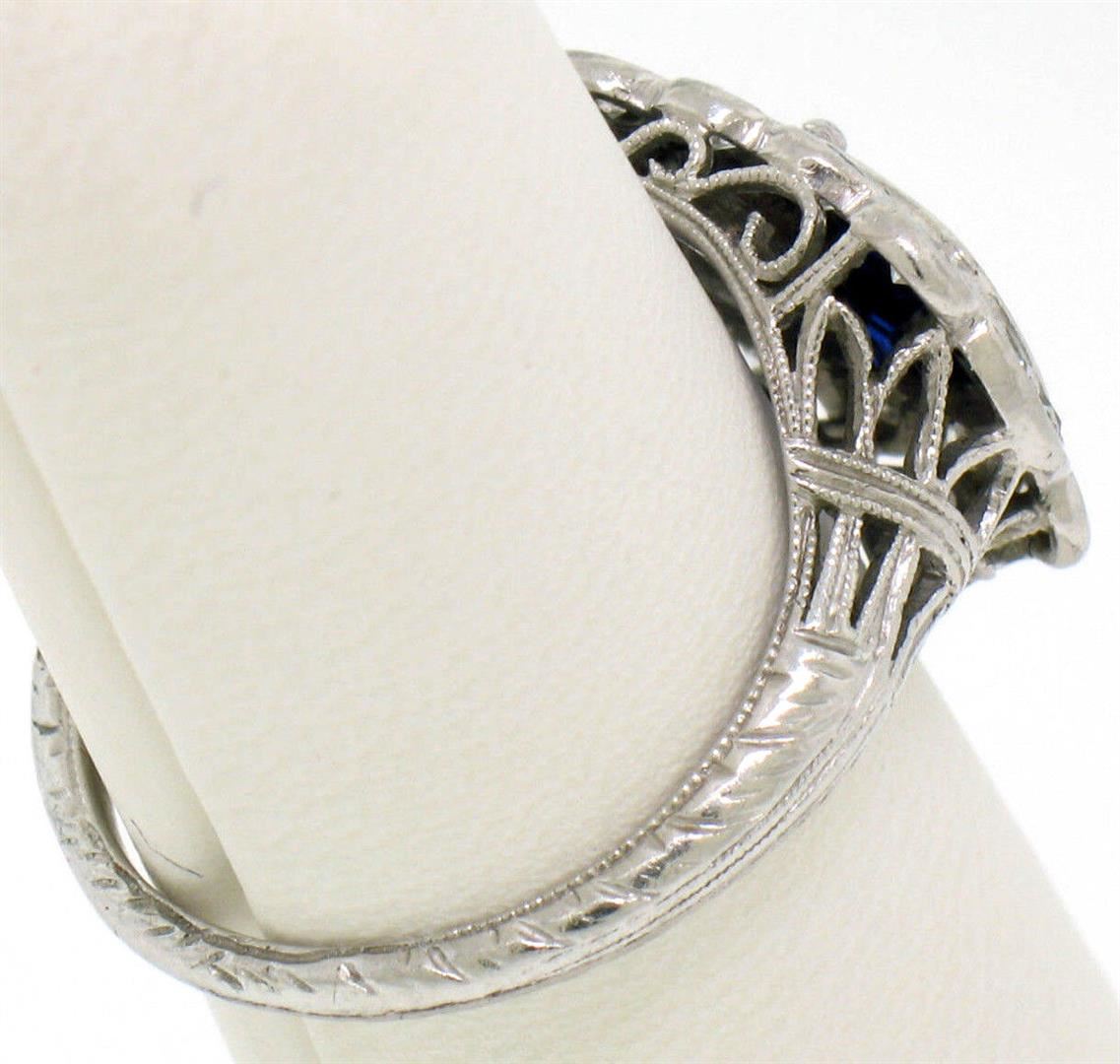 An antique solid platinum ring, with 2 square french cut natural synthetic sapphires (4.4mm), and 17 old european cut natural diamonds (G- VS1/VS2; 1.00ctw). The ring is size 6.0, weighs a total of 6.1 grams, and measures 12.0mm wide.