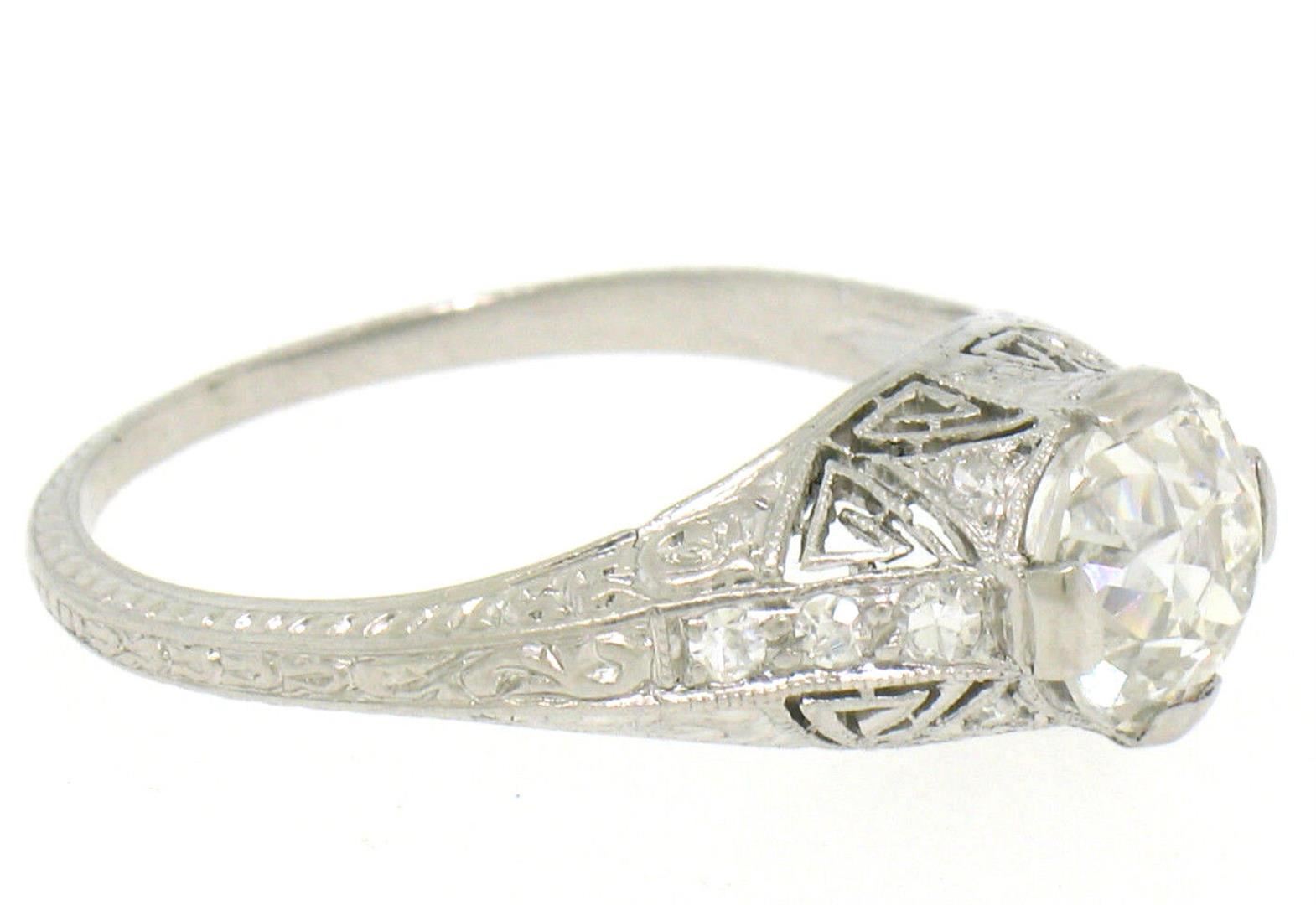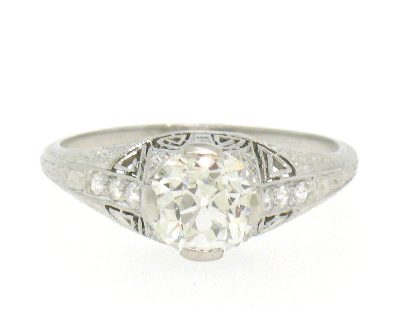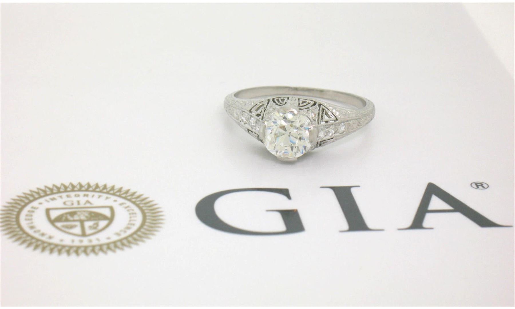 An antique art deco solid platinum solitaire ring, with 1 Gia certified old european cut natural diamond (I- VS2; 1.18ct), and 10 single cut natural diamonds (G- VS1/VS2; 0.12ctw). The ring is size 7.0, weighs a total of 3.30 grams, and measures 7mm wide. Comes with all original relevant certifications.