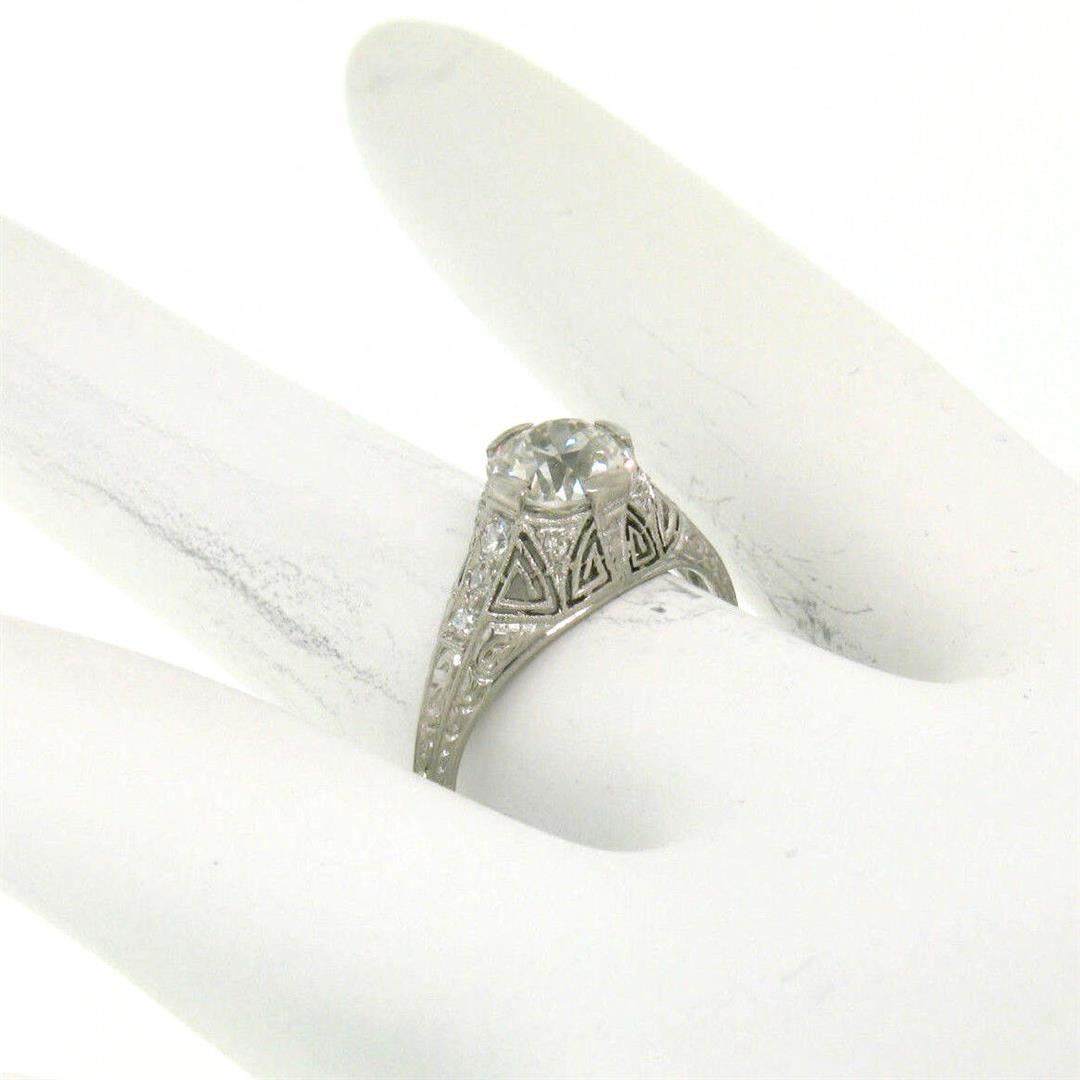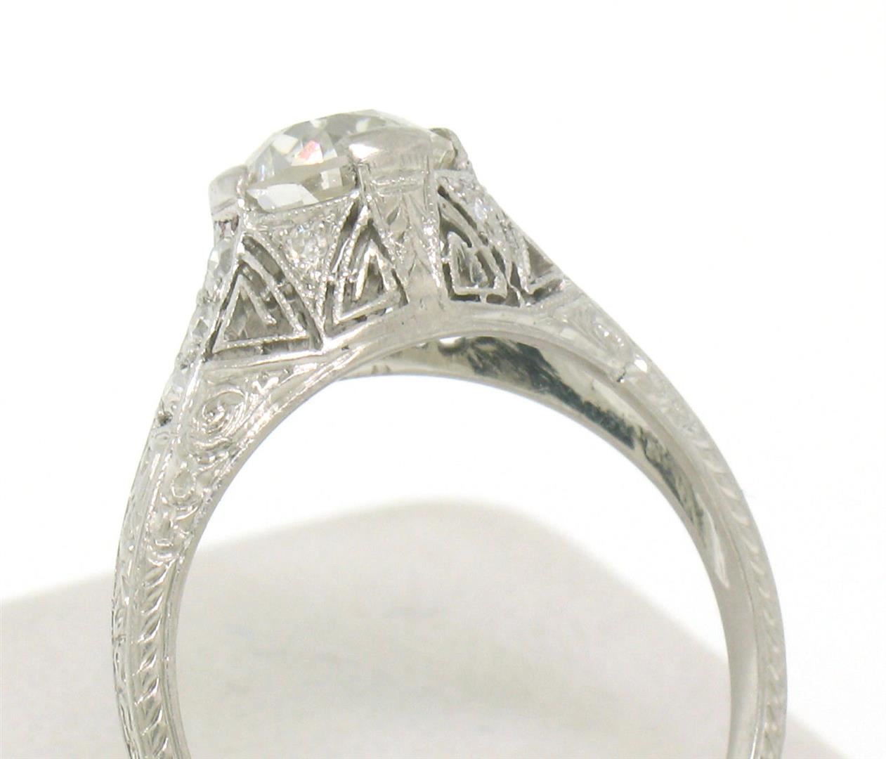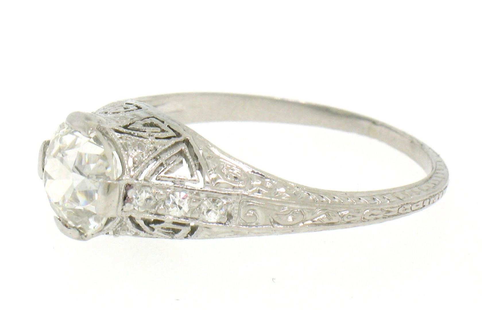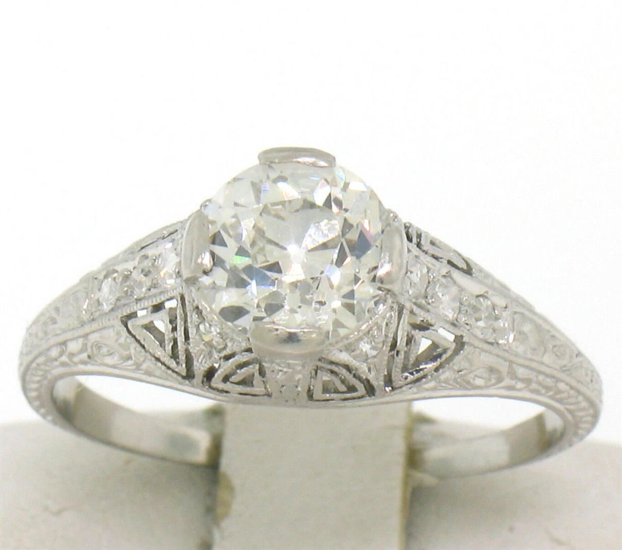 An antique art deco solid platinum solitaire ring, with 1 Gia certified old european cut natural diamond (I- VS2; 1.18ct), and 10 single cut natural diamonds (G- VS1/VS2; 0.12ctw). The ring is size 7.0, weighs a total of 3.30 grams, and measures 7mm wide. Comes with all original relevant certifications.