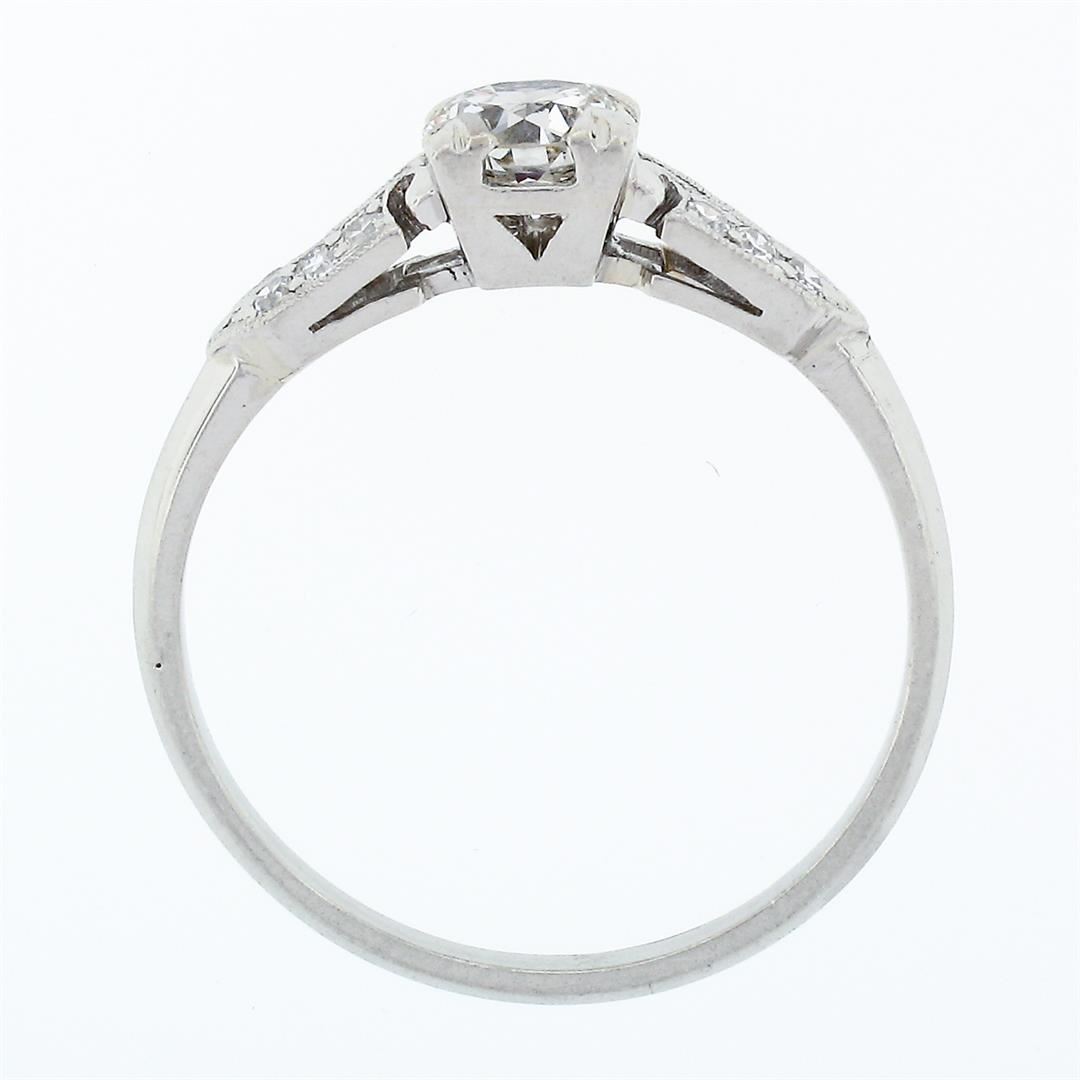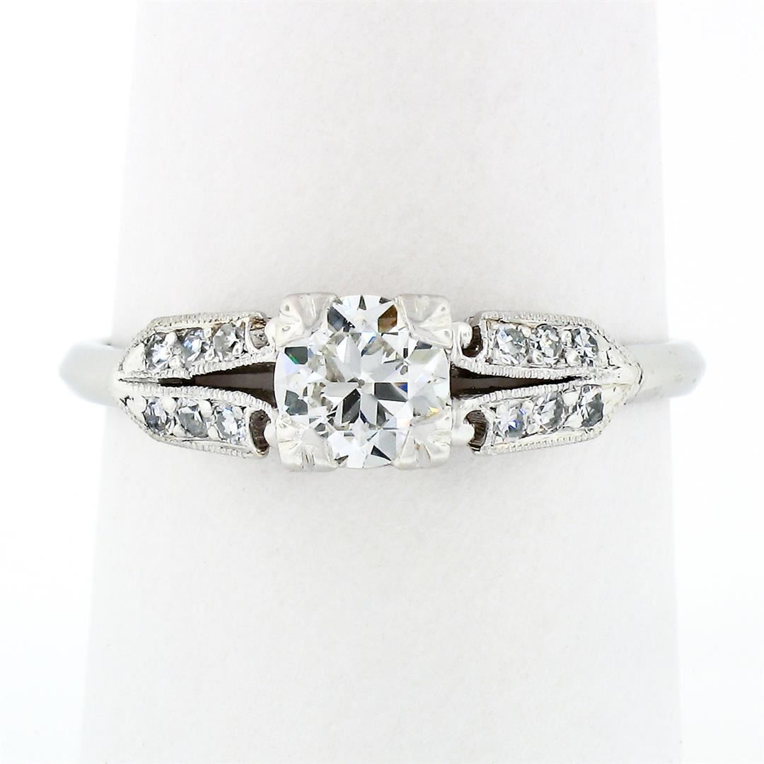 An art deco period solid platinum engagement ring, with 1 old European cut natural diamond (J - VS2; 5.26mm - 0.58ct), and 12 round single cut natural diamonds (H/I - VS1/VS2; 0.18ctw). The ring is size 7.5, weighs a total of 3.44 grams, and measures 5.4mm wide.
