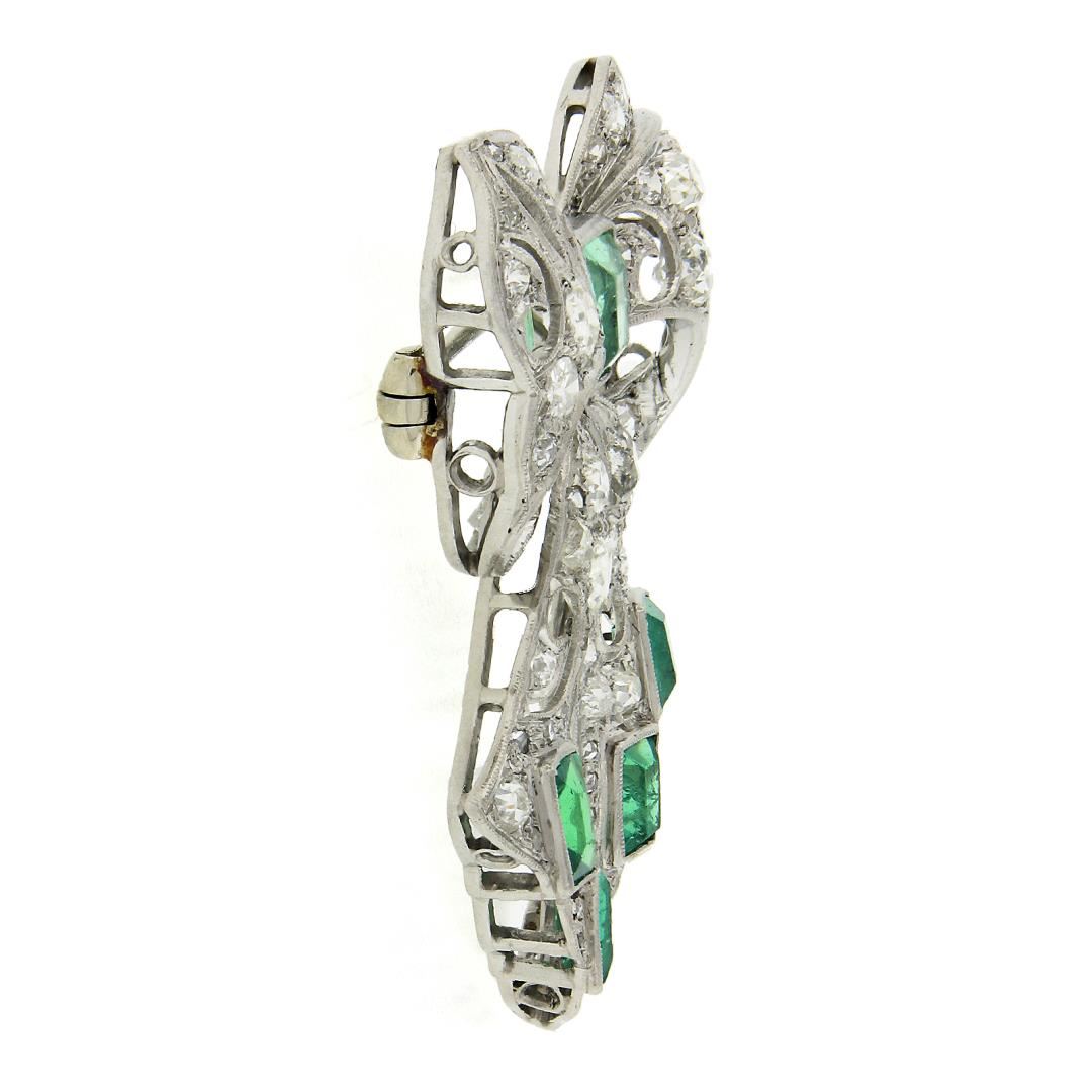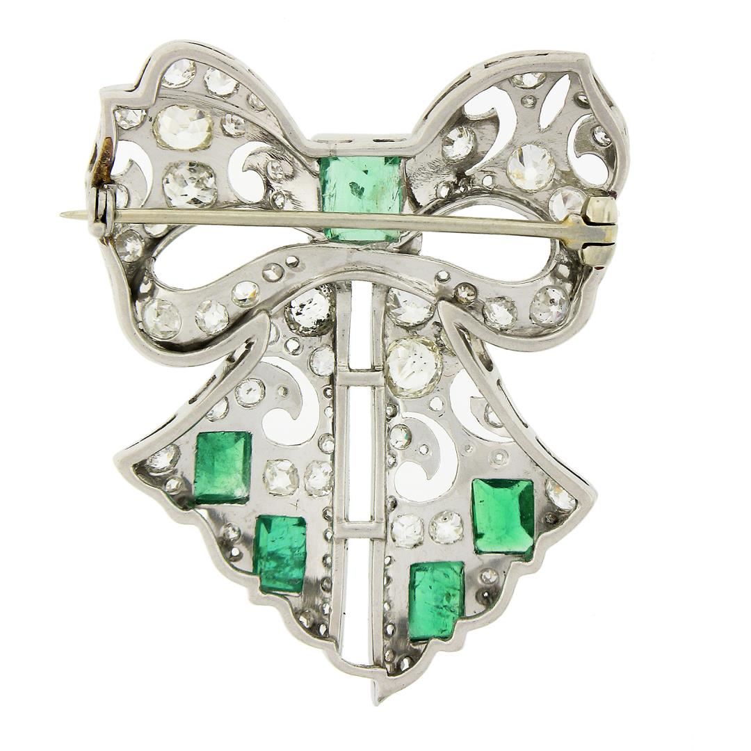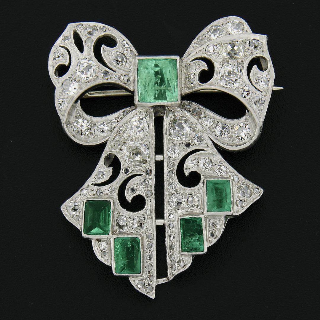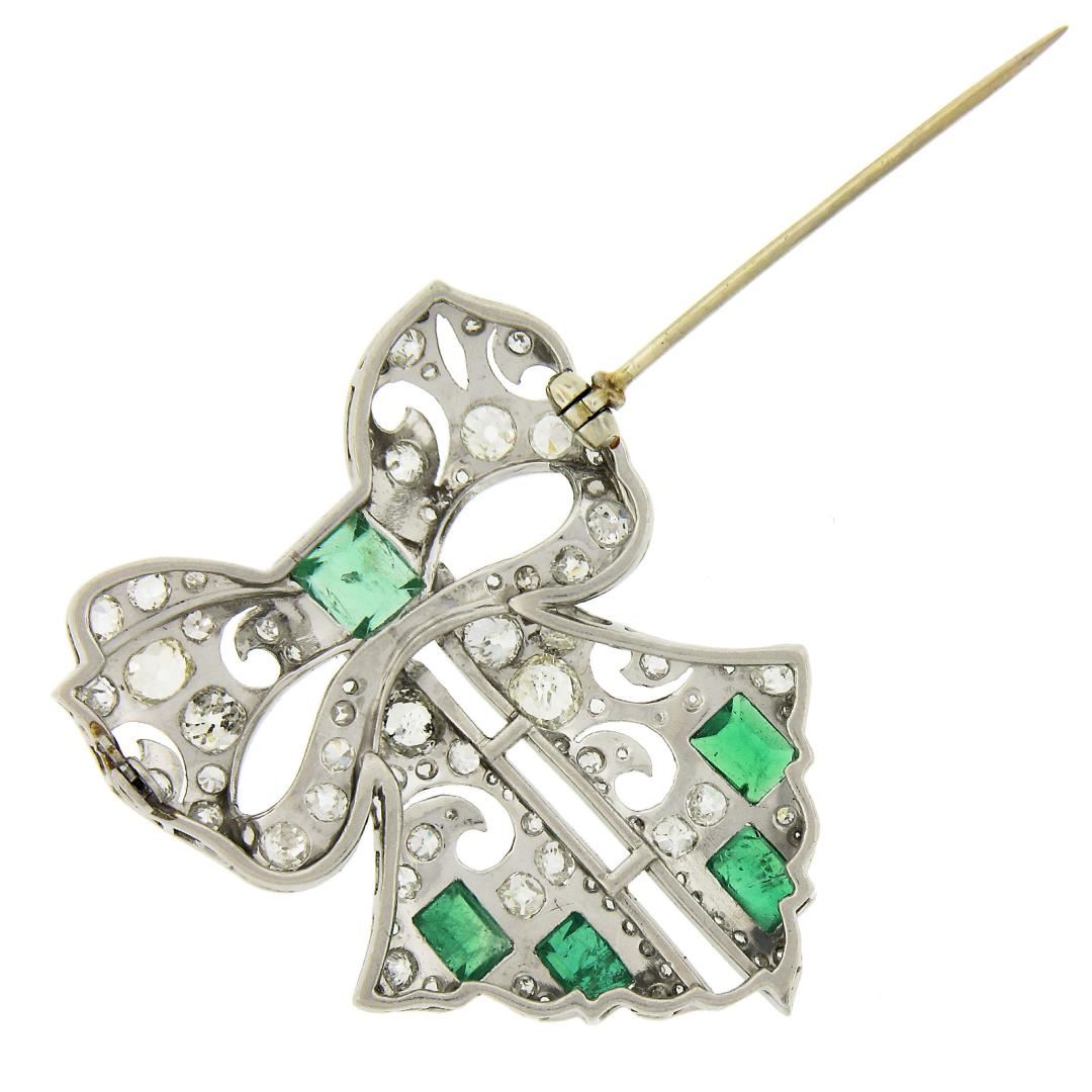 An antique solid platinum ribbon brooch, with 1 square cut natural emerald (1.50ct), 4 rectangular cut natural emeralds ( 2.20ctw), and 81 old mine, rose, single & european cut natural diamonds (G-L - VS2-I2 ; 4.0ctw). Measures 46x37.2mm and weighs a total of 18.56 grams.