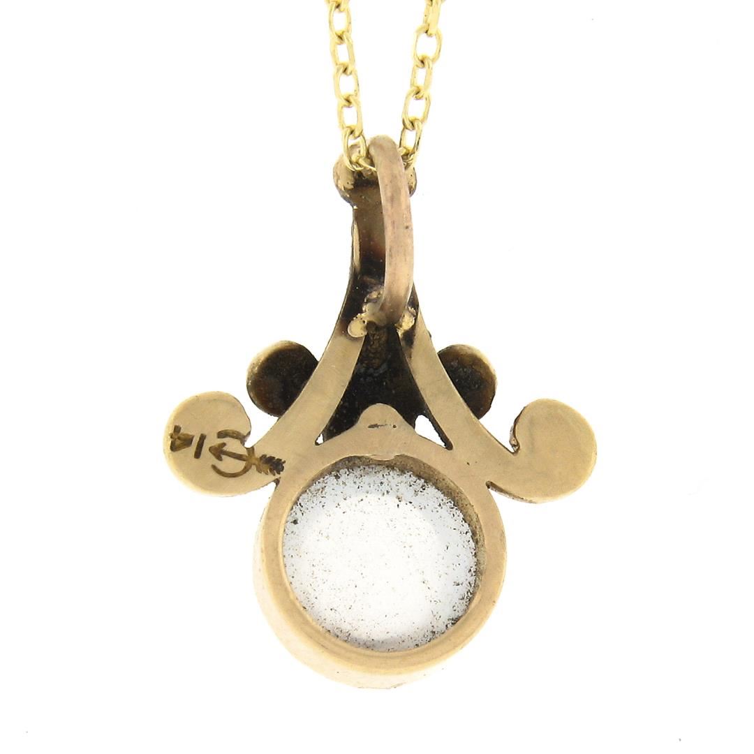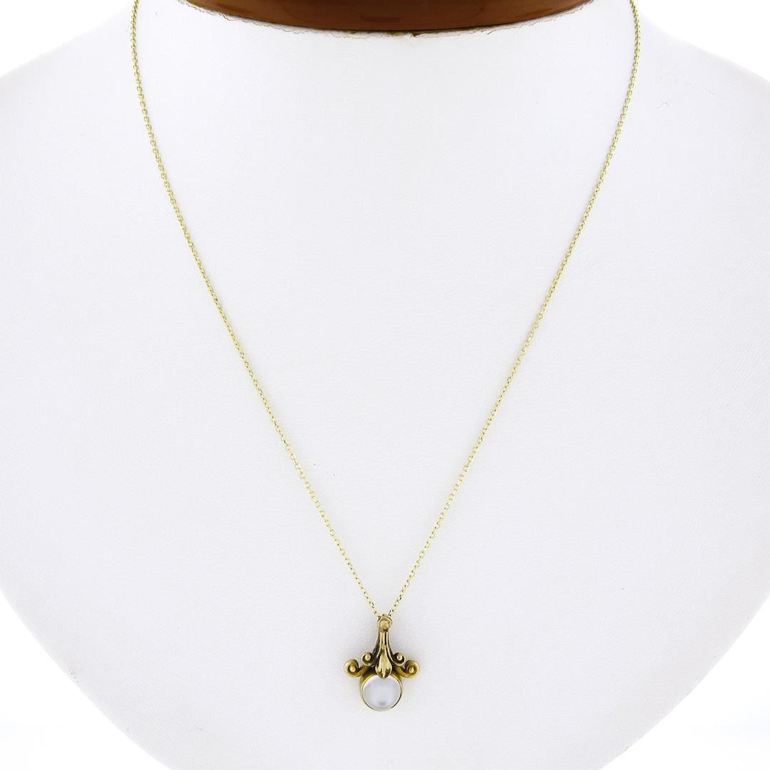 An antique 14k yellow gold pendant necklace, with 1 round cabochon cut natural moonstone (5.8mm). Adjustable at 16 and 18 inch cable link chain, 2.20 grams total weight, pendant measures 15x11.85mm.