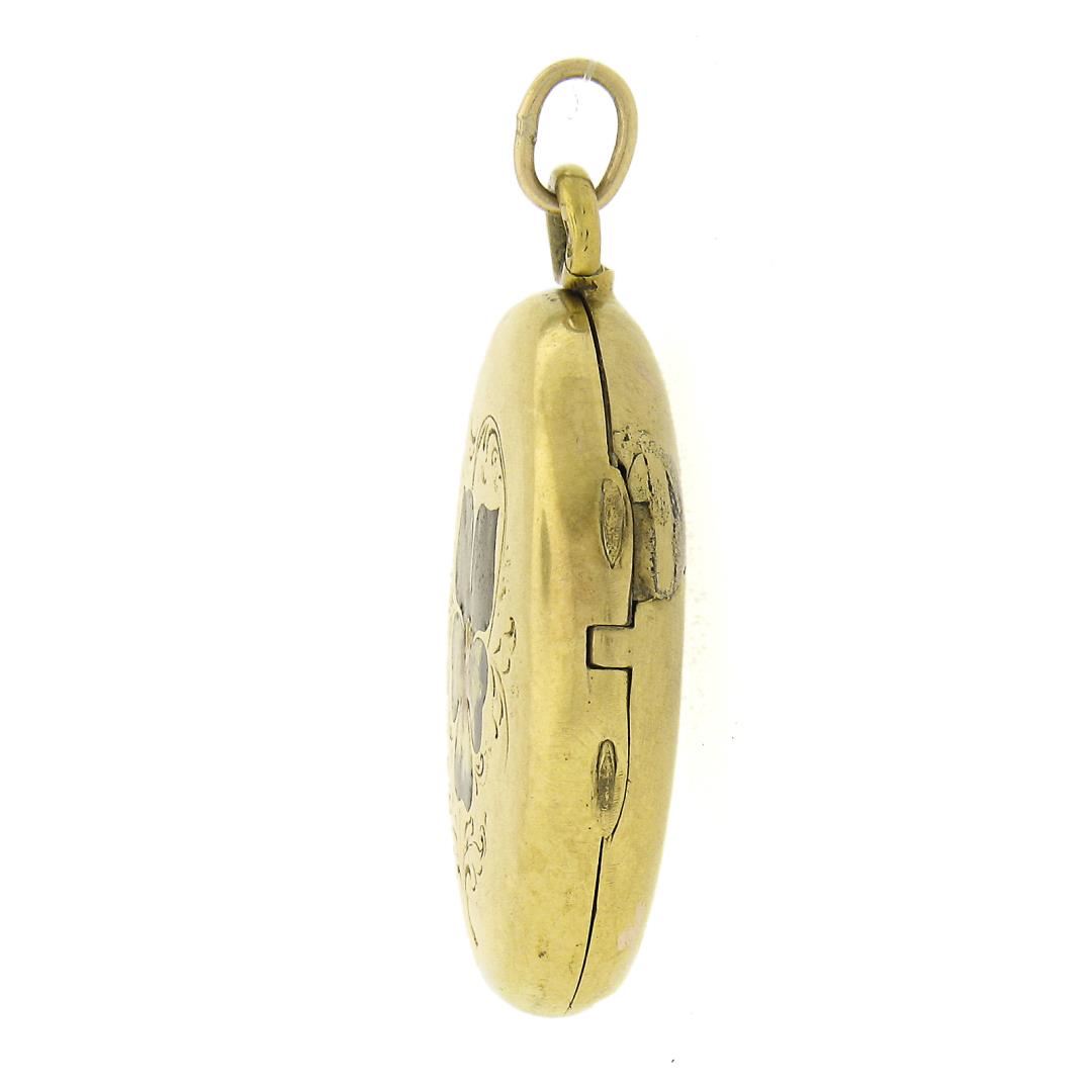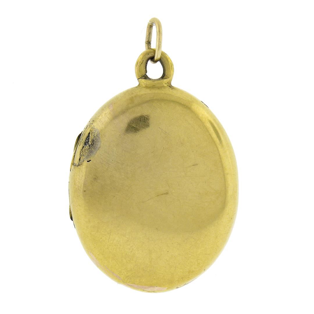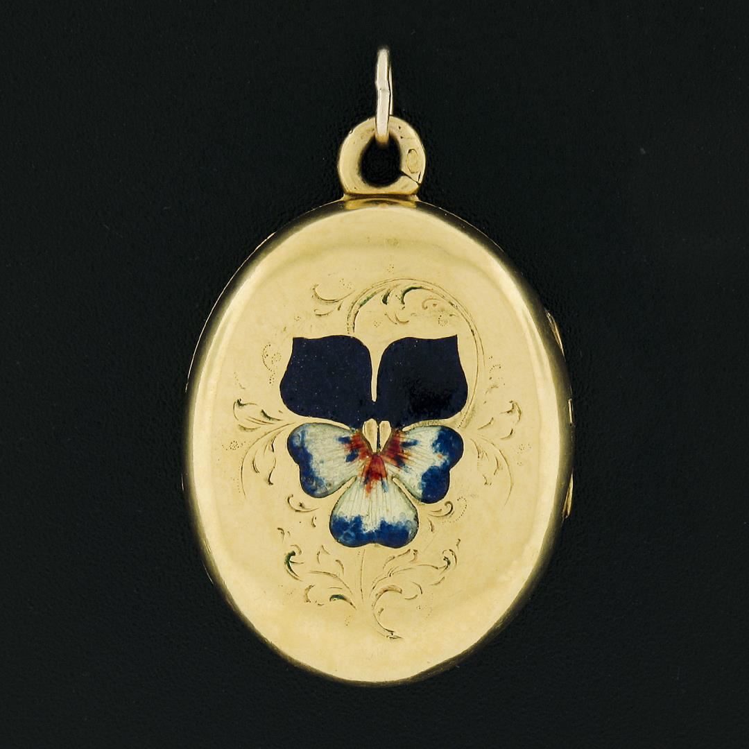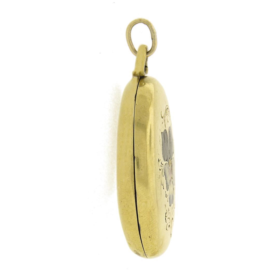 An antique solid 14k yellow gold & enamel work locket pendant. The pendant weighs a total of 8.65 grams, measures 40.4x24.9mm including the bail.