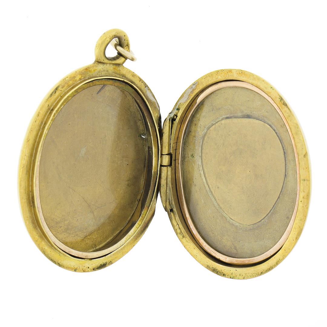 An antique solid 14k yellow gold & enamel work locket pendant. The pendant weighs a total of 8.65 grams, measures 40.4x24.9mm including the bail.