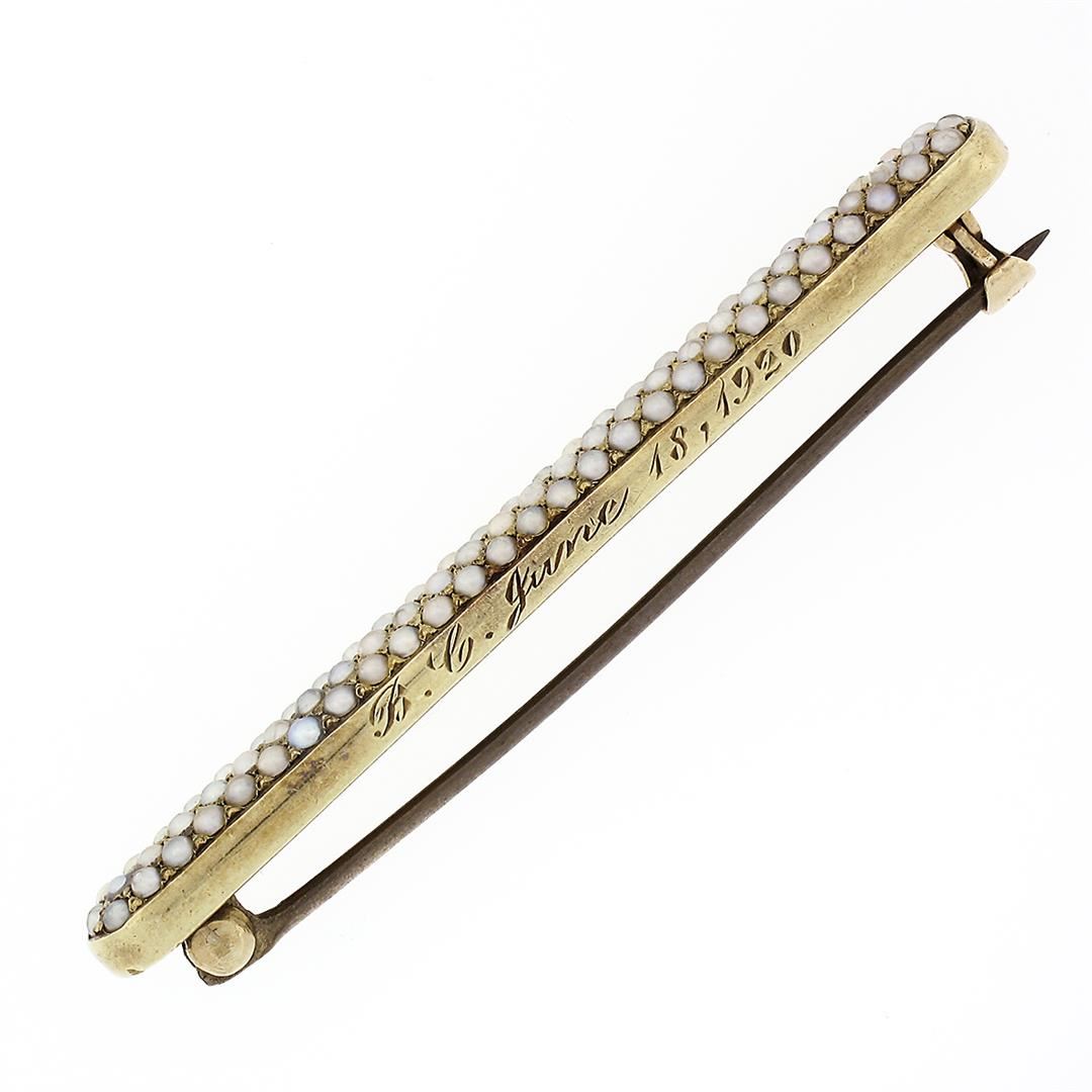 An antique art nouveau solid 14k yellow gold bar pin brooch, with 82 round shape cultured seed pearls (1.1mm each). Measures 6.0x50.7mm and weighs a total of 5.45 grams.
