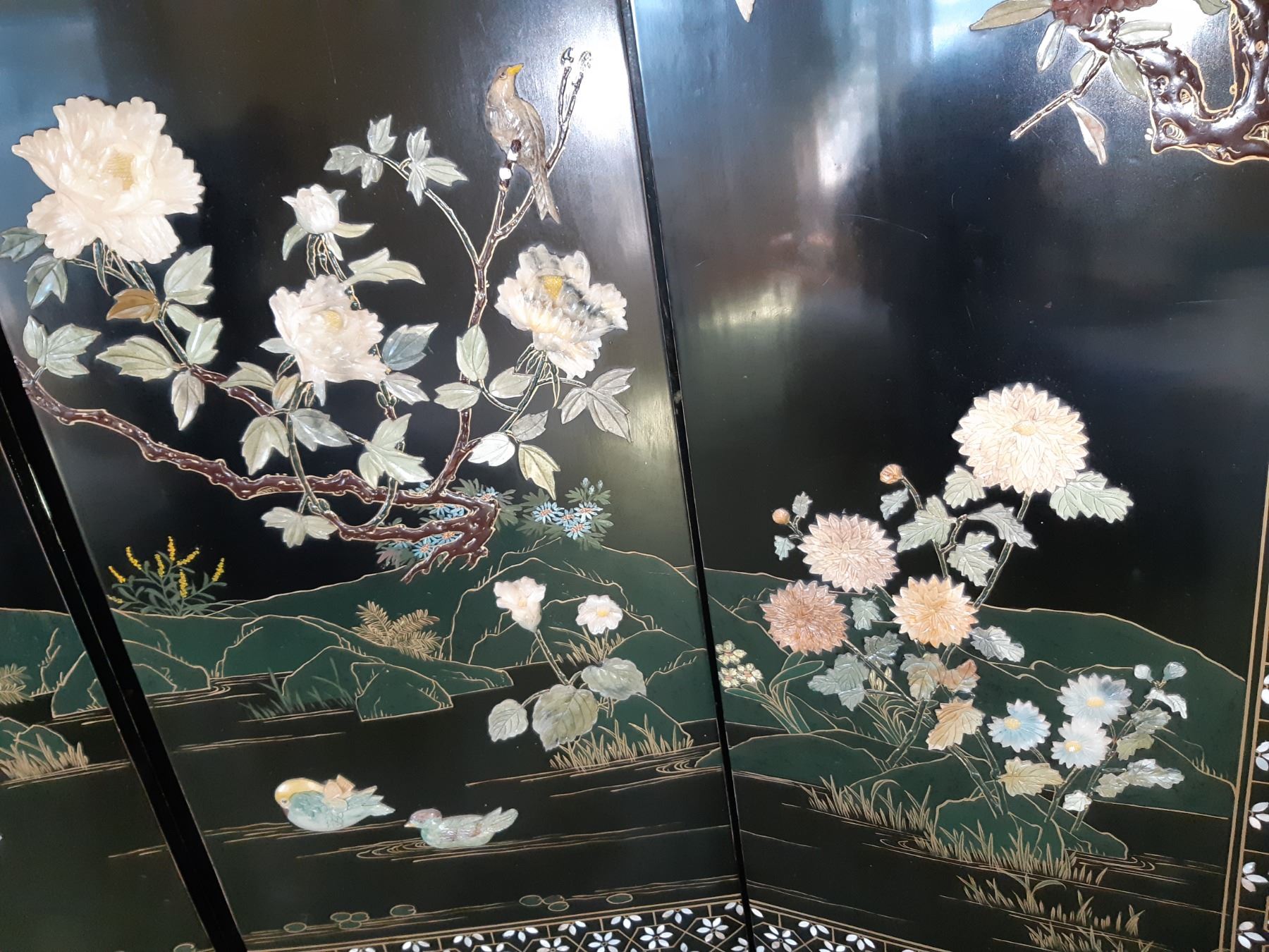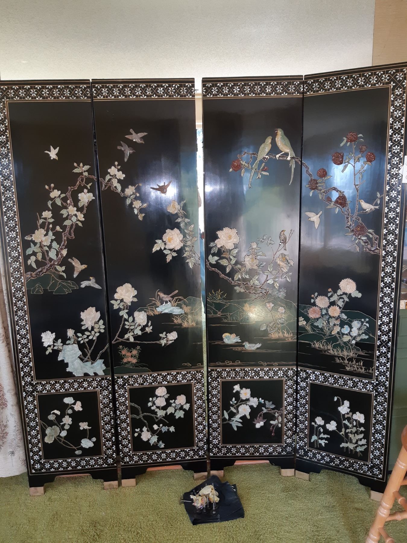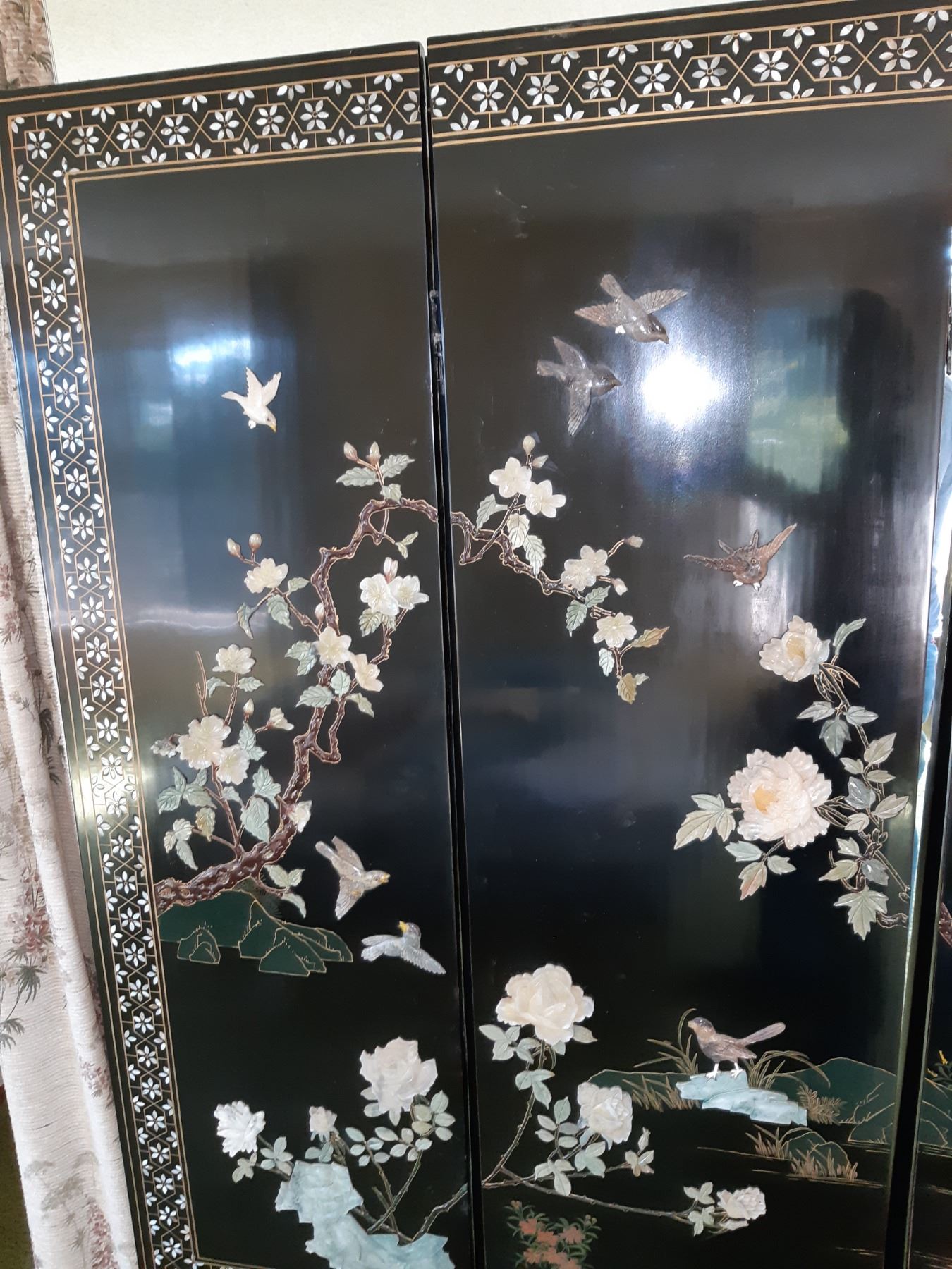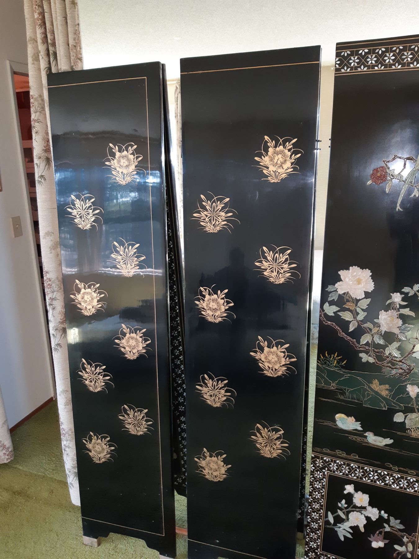 Pickup at Marsh McCormick panels 16x72 ea. black lacquered panels, jade, mother of pearl detailing. Disassembled & ready to move. Puckup at 12 pm