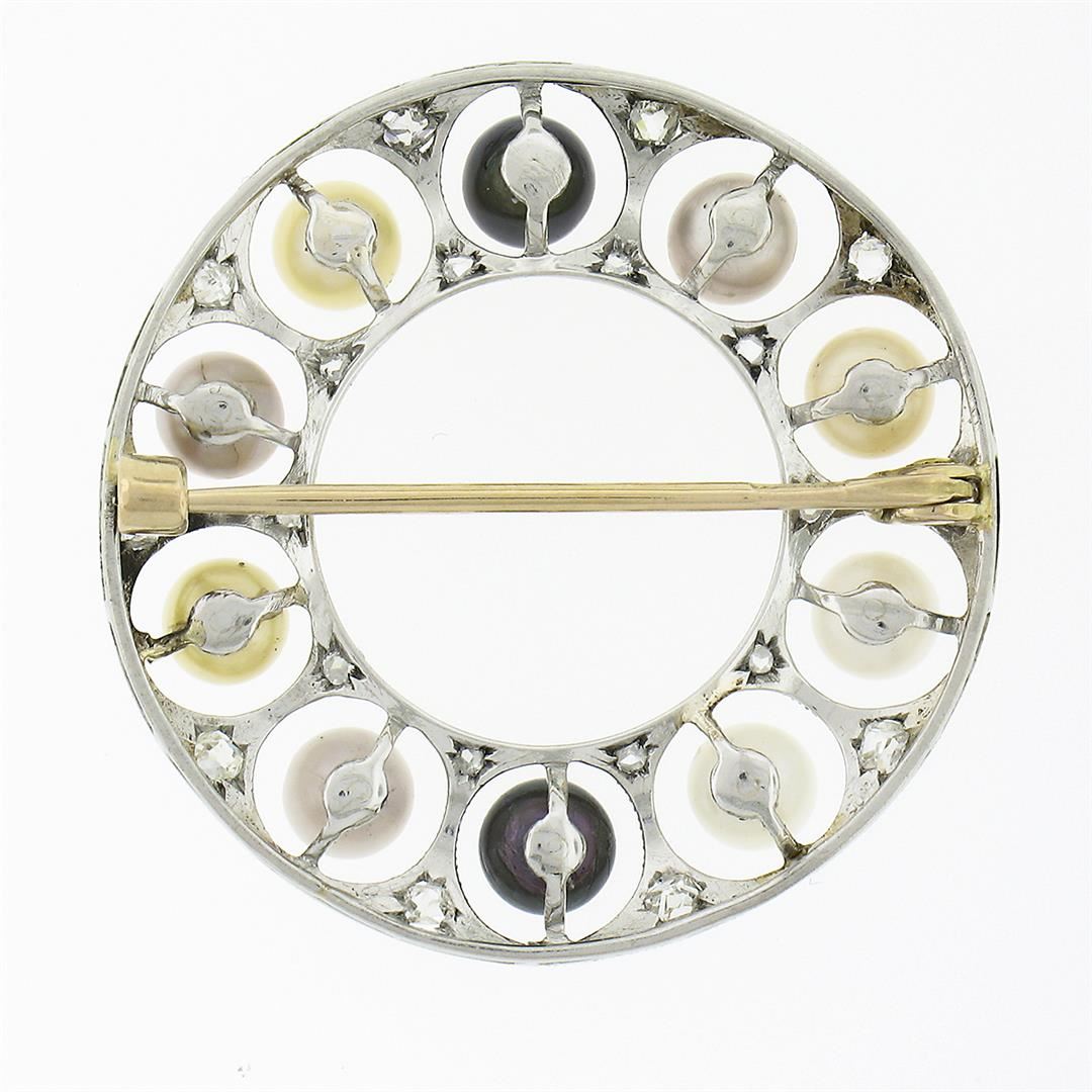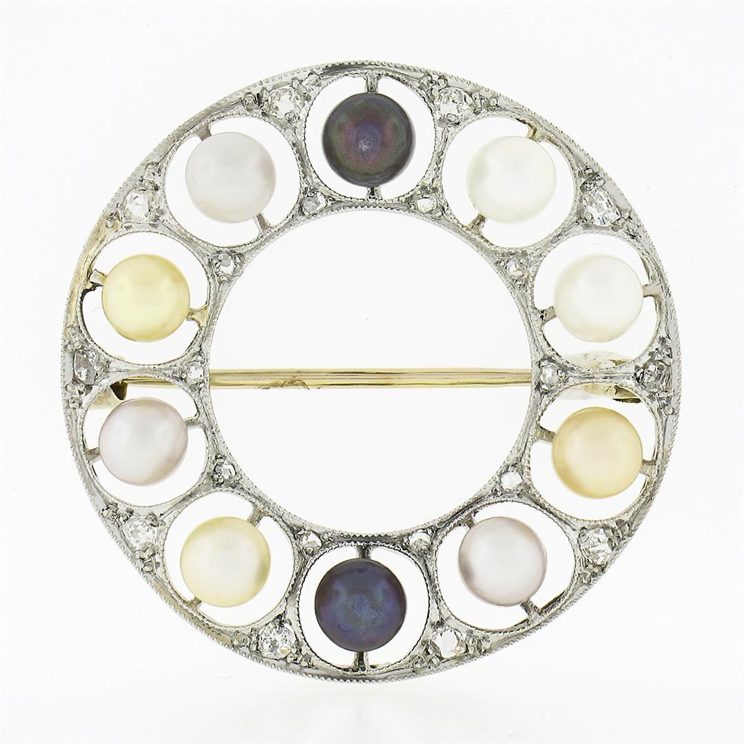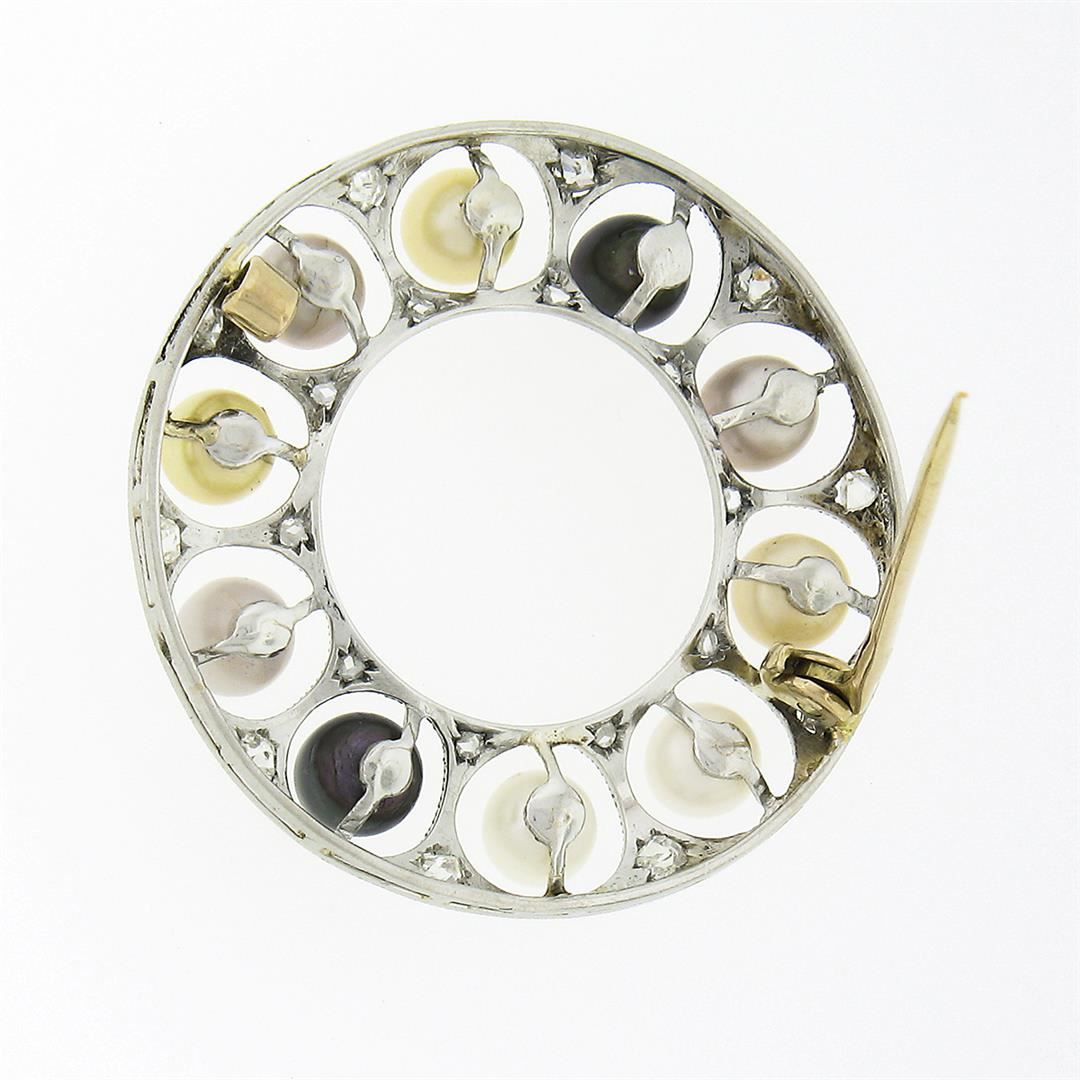 Antique Belle Epoque Platinum Multi Color Pearl Diamond Wreath Circle Pin Brooch
