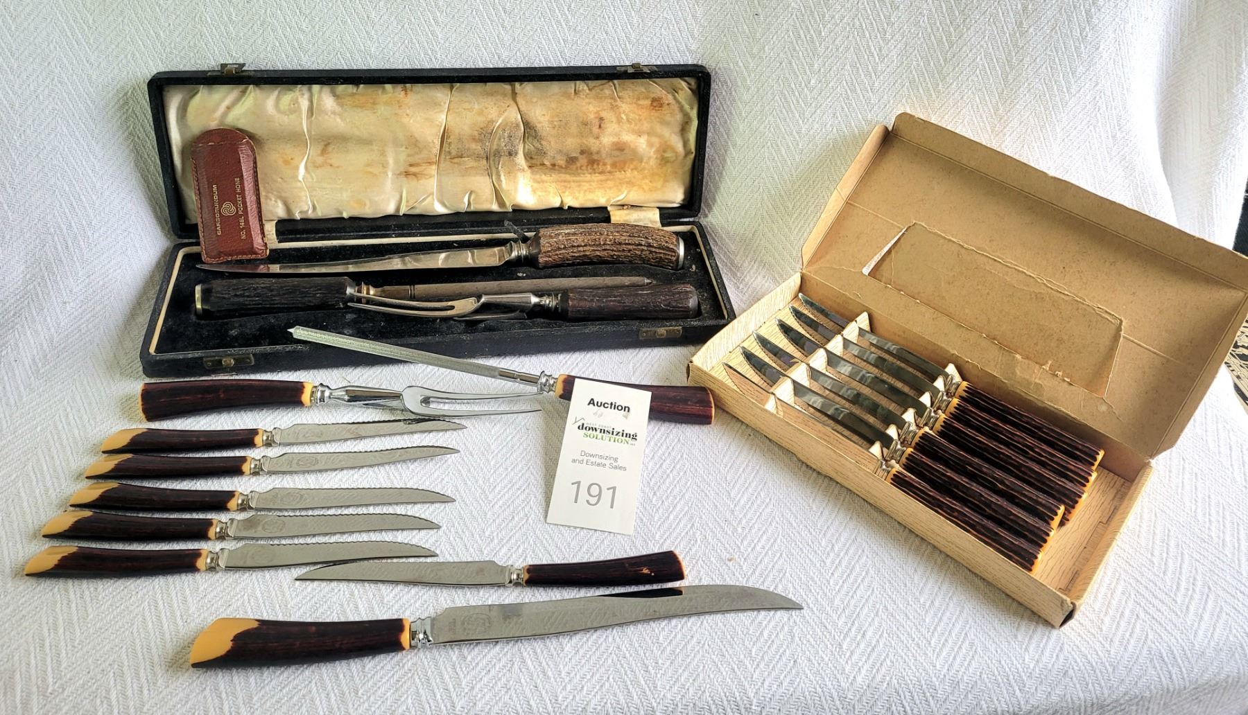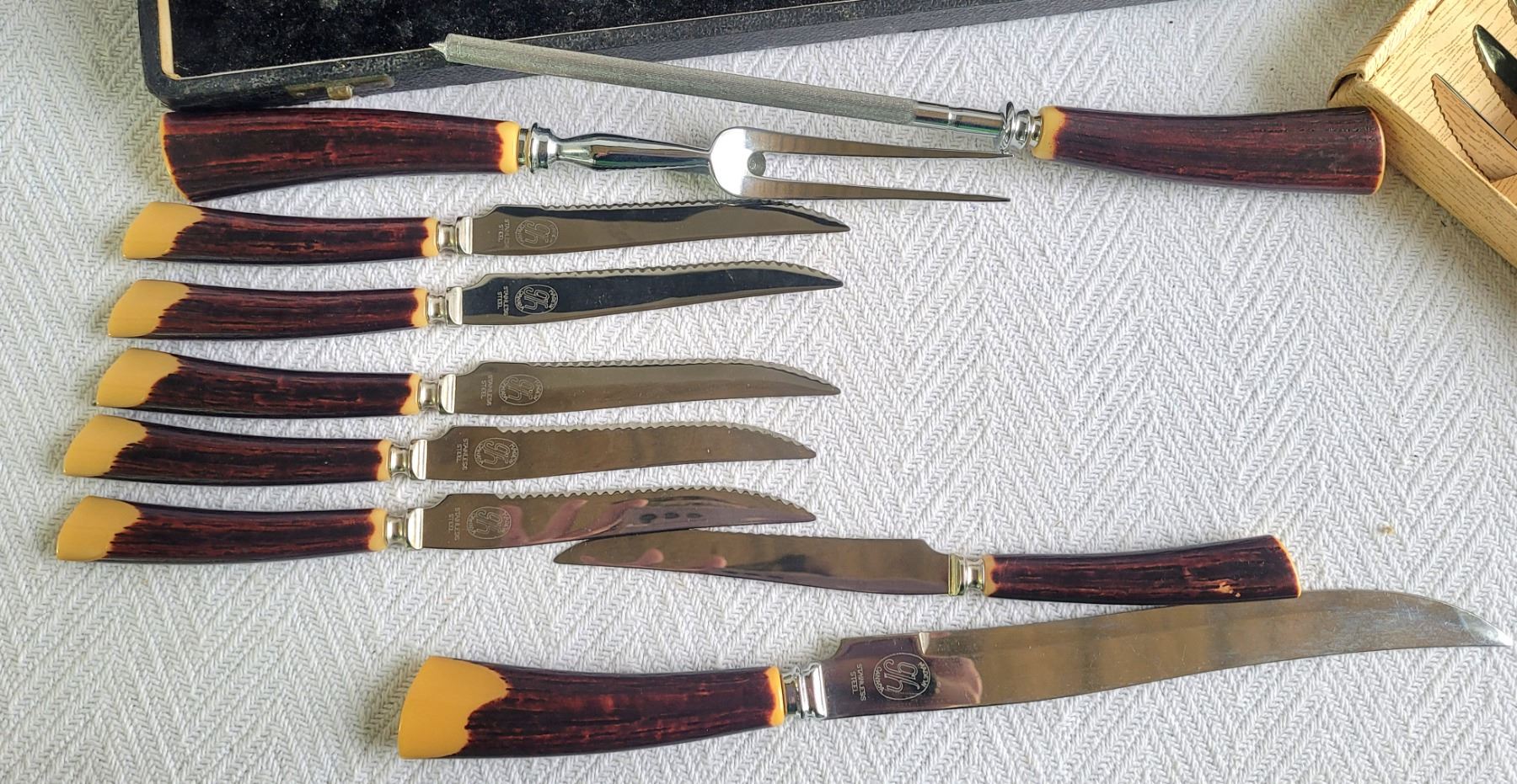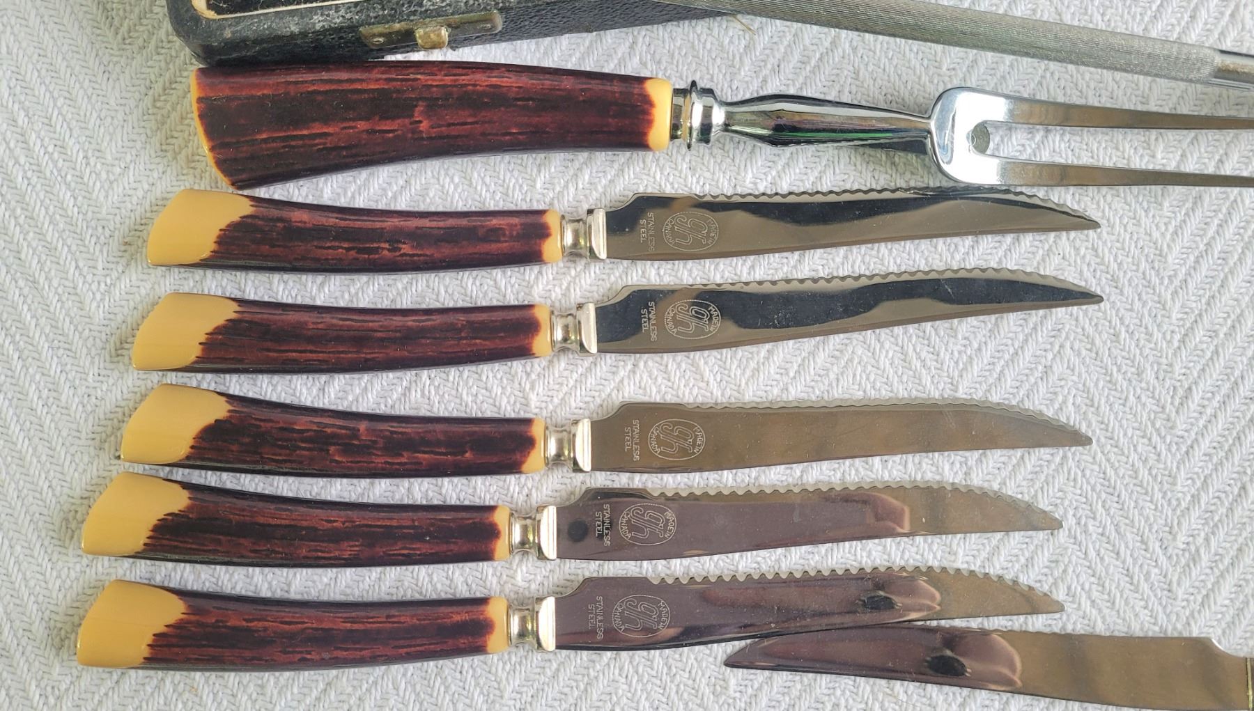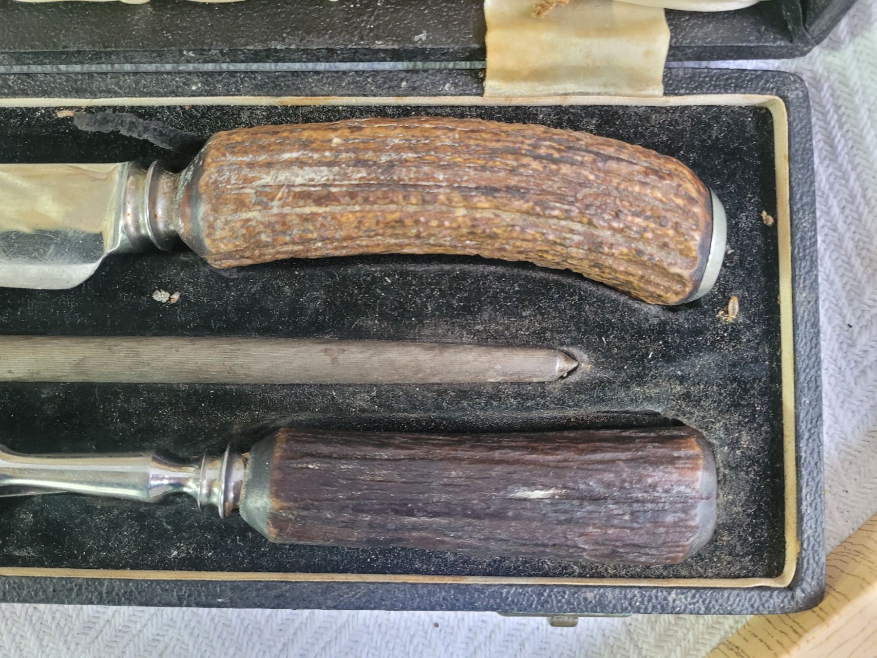 Carving set with antler handles. set of steak knives with faux bone handles. Pickup at 9 am