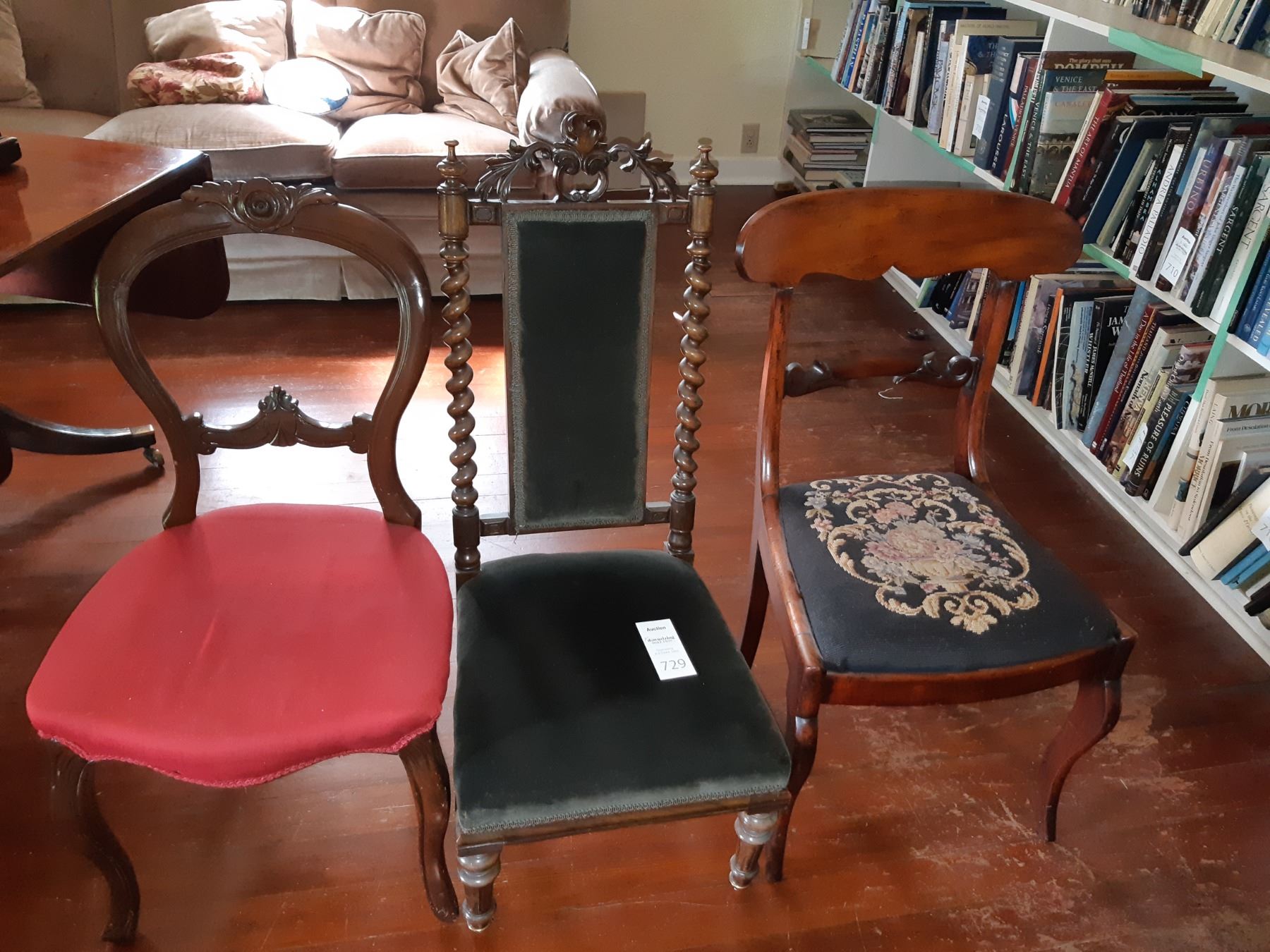 Three antique occasional chairs, one with petit point seat, one with barley twist detail. Pick up 10 am