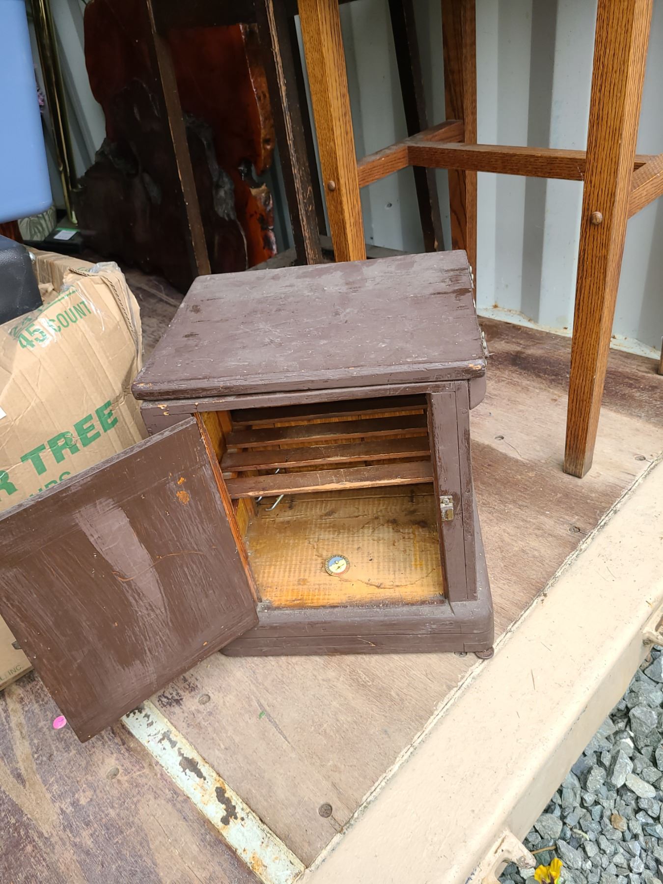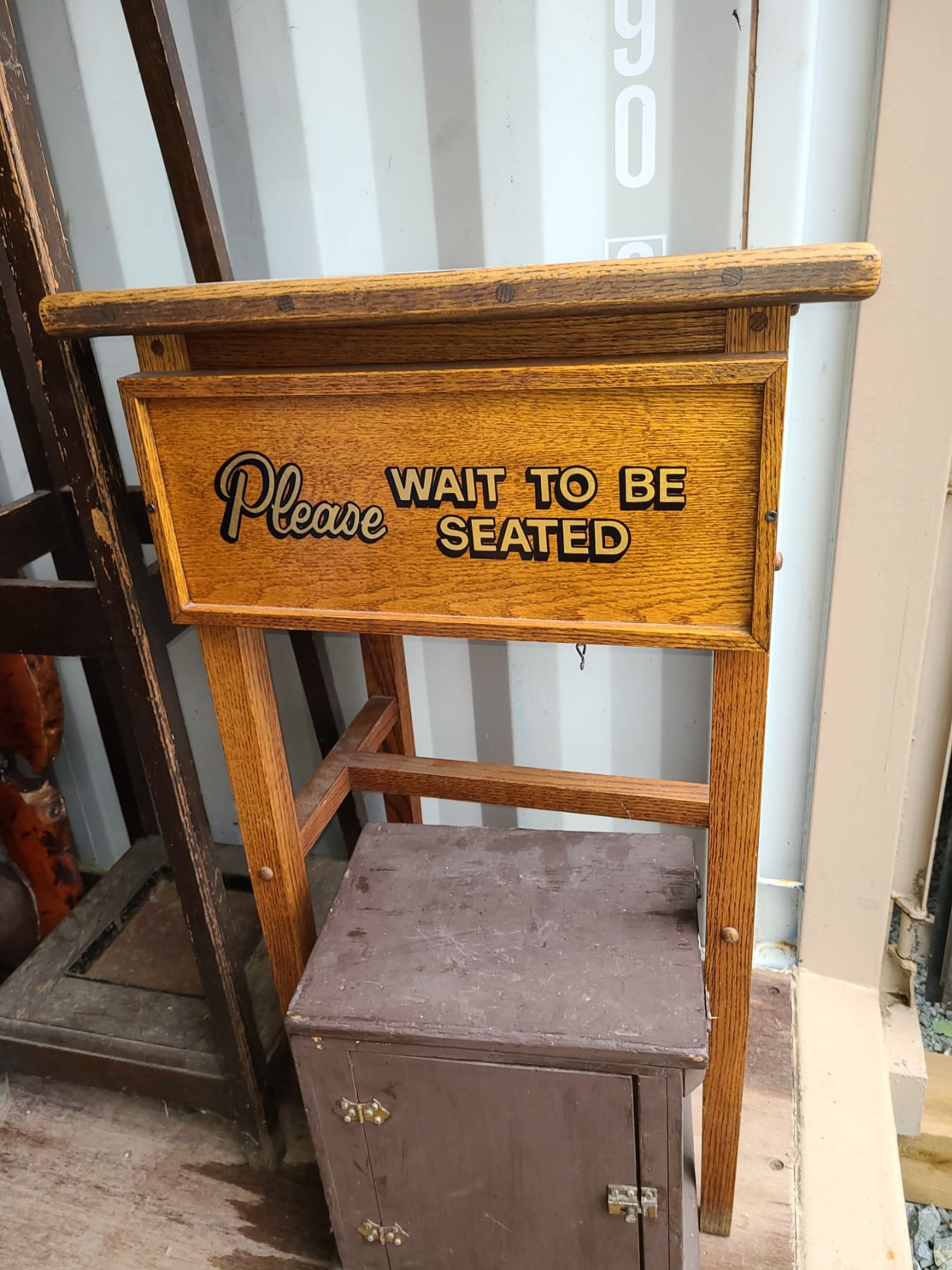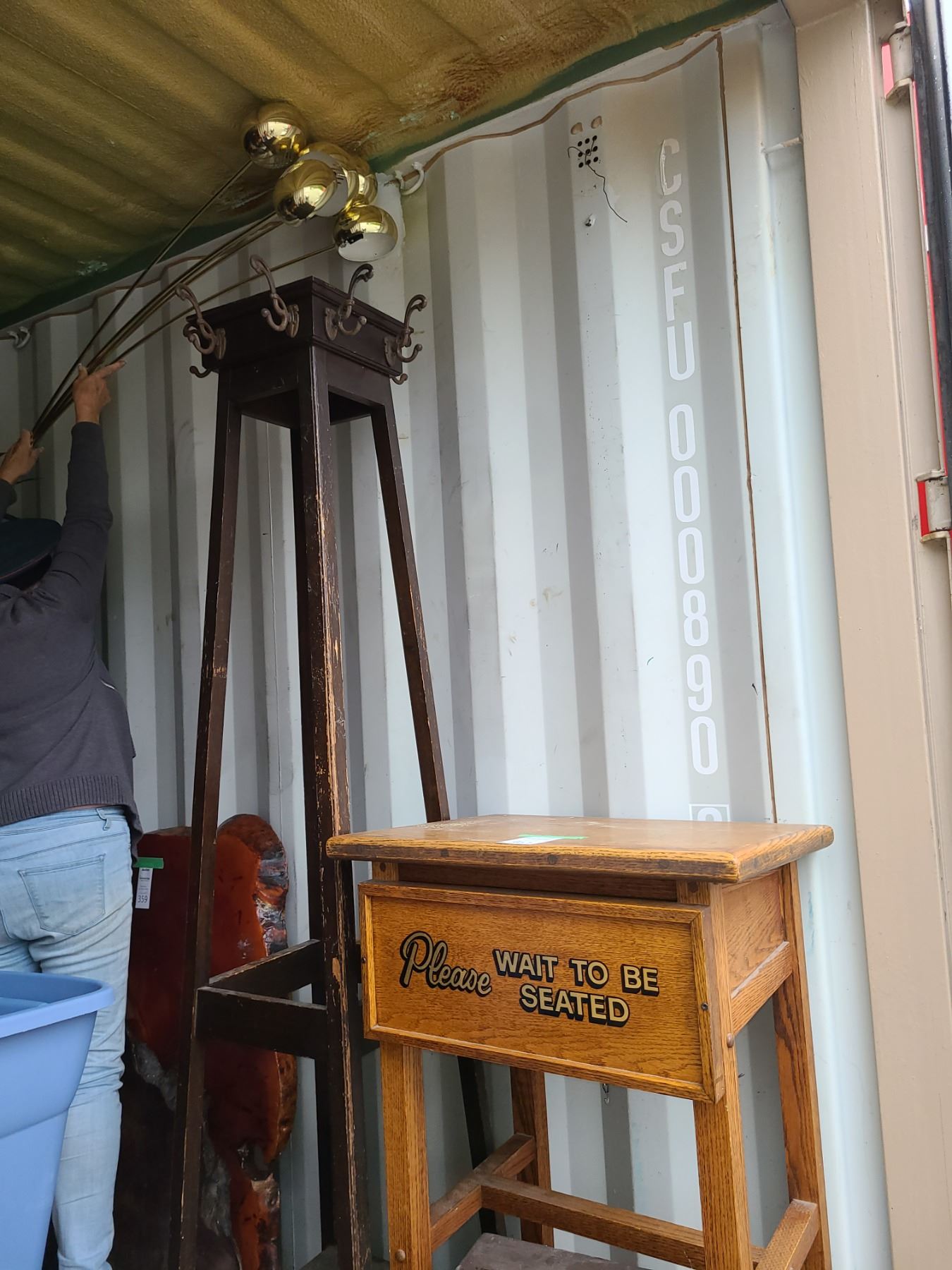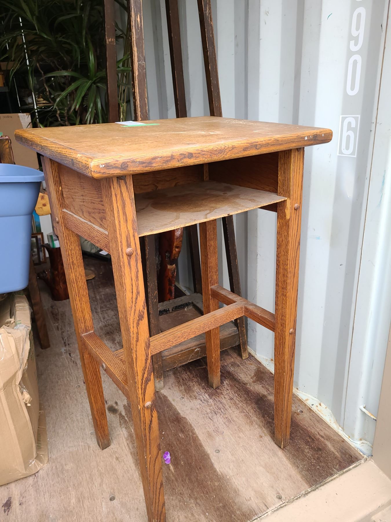 Antique coat rack about 6’, oak podium, small wooden cabinet. Pickup at 9 am