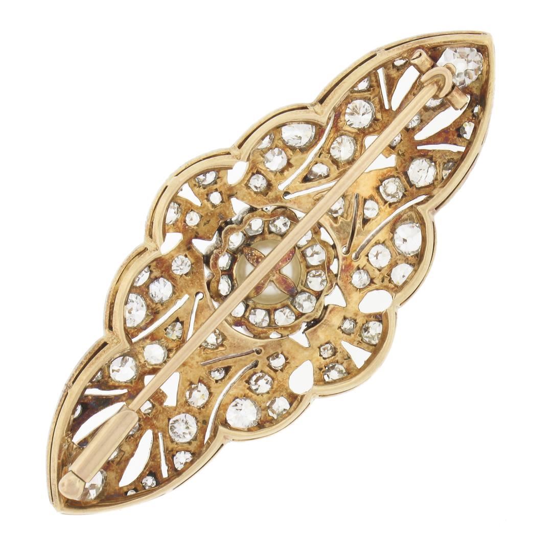 A solid 18k yellow gold & platinum brooch, featuring 1 round shape cultured pearl (6.35mm), and 72 old single, european & mine cut natural diamonds (G-L - VS2-I2 ; 3.60ctw). Measures 57x25.6mm and weighs a total of 13.47 grams.