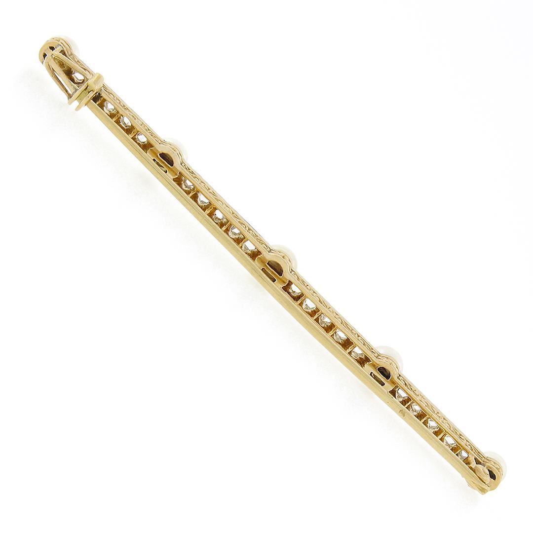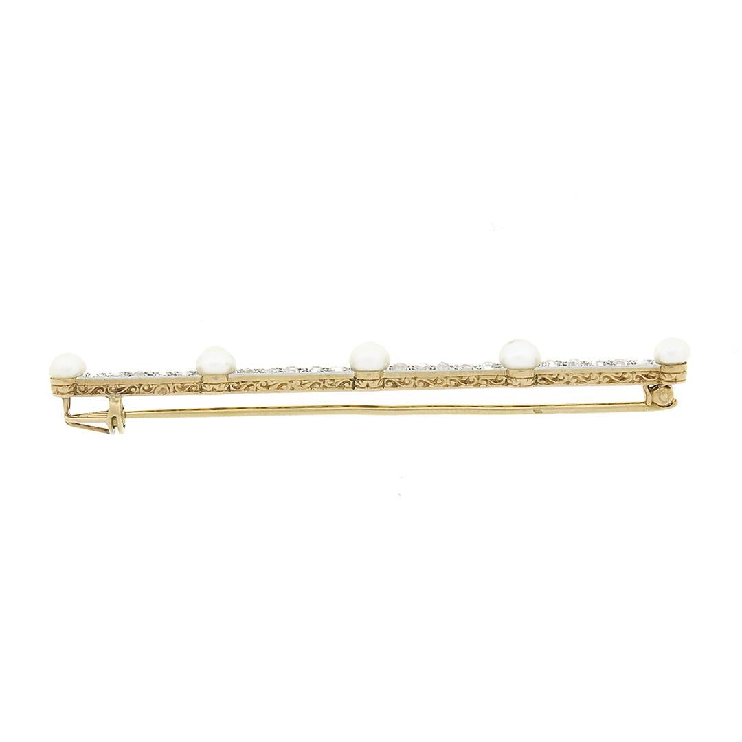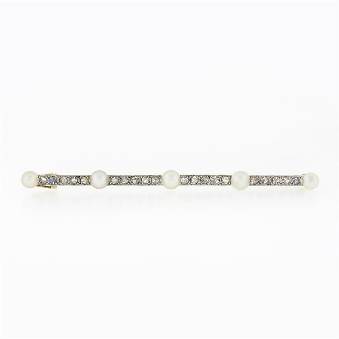 An antique solid 18k yellow gold and platinum bar pin brooch, with 5 round shape cultured pearls (4mm to 4.6mm each), and 20 rose cut natural diamonds (G/H - VS2/SI2 ; 0.80ctw). Measures 70.30x4.60mm and weighs a total of 6.20 grams.