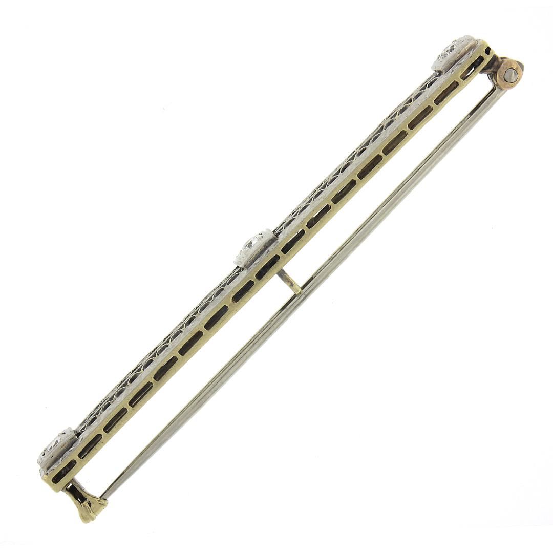 An antique solid platinum bar brooch, with 3 old european cut natural diamonds (H/I - VS1/VS2 ; 0.20ctw). Measures 5x56mm and weighs a total of 4.28 grams.