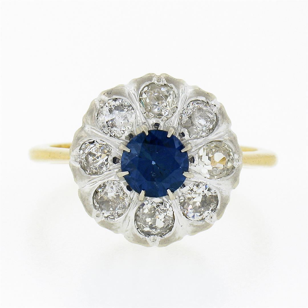 An antique solid 18k yellow and white gold cluster ring, with 1 Gia certified round cut natural blue sapphire (0.75ct ), and 8 old mine cut natural diamonds (F/G - SI2/I2 ; 1.00ctw). The ring is size 6.0, weighs a total of 4.49 grams, and measures 13.40mm wide. Comes with all original relevant certifications.