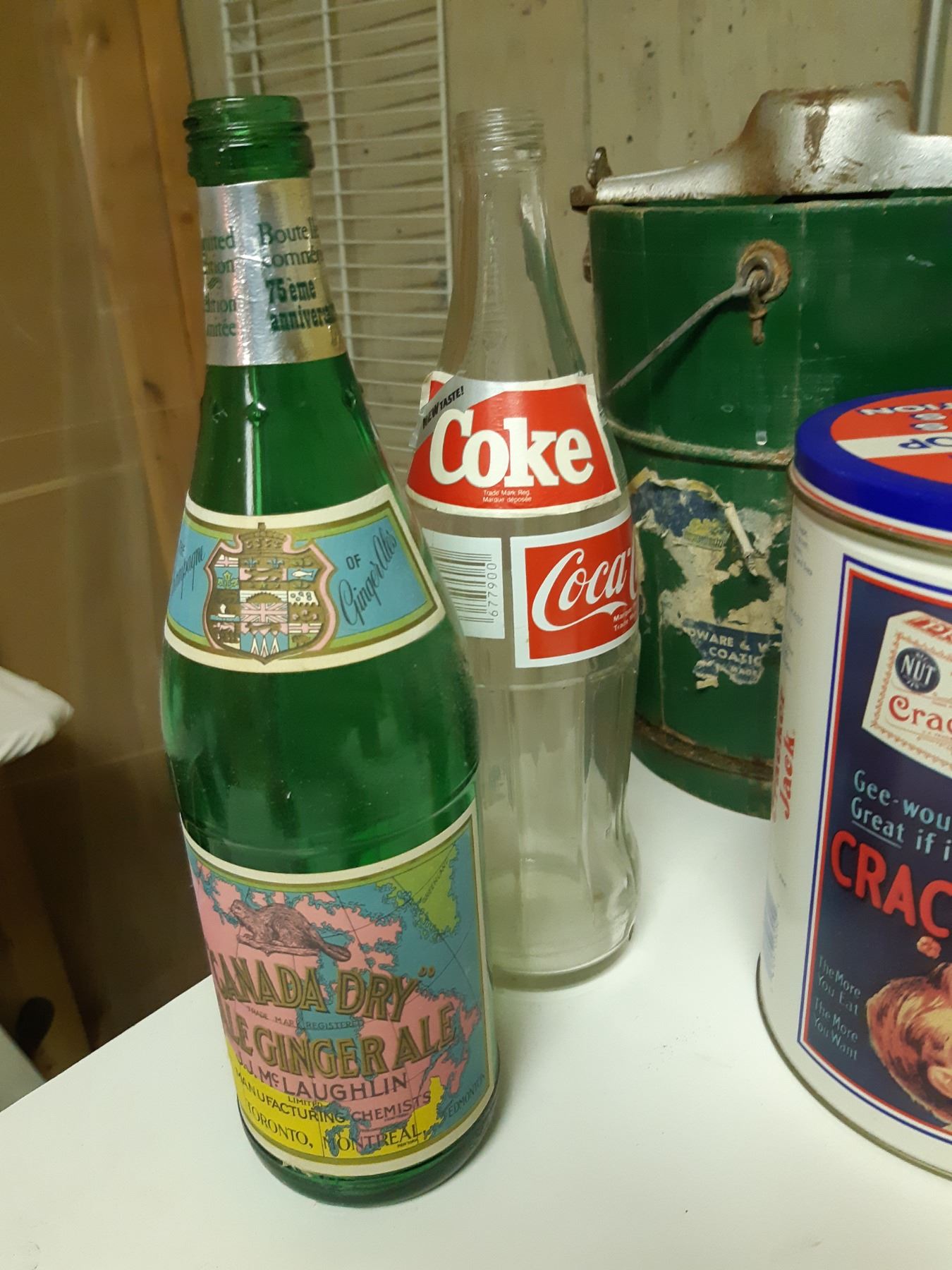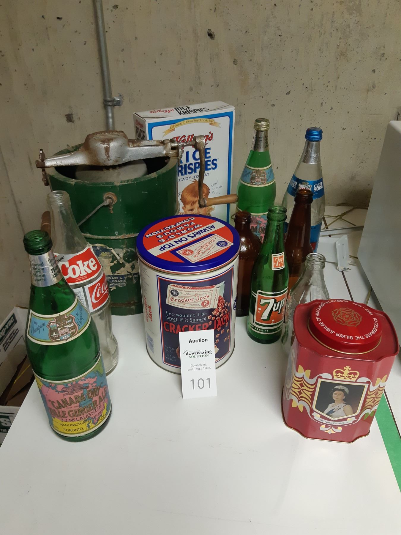 Homestead antique icecream maker, vintage Kellogs corn flake box, vintage pop bottles and tins. Bring packing and pickup at 10 am