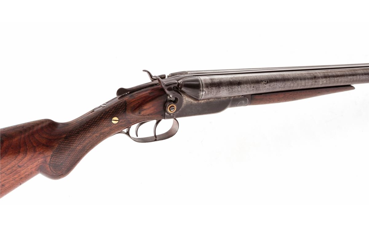 Antique Ithaca Side-by-Side Shotgun, with exposed hammers, #4879, 10 ga., 22'' Damascus barrels, even overall gray finish, factory checkered walnut stock and splinter handguard. Condition is fair to good with gray/brown patination to metal surfaces. Brass pin and screw repairs to stock. Moderate flattening to checks. Functioning action, dark bores. Est.: $250-$400. (Antique)