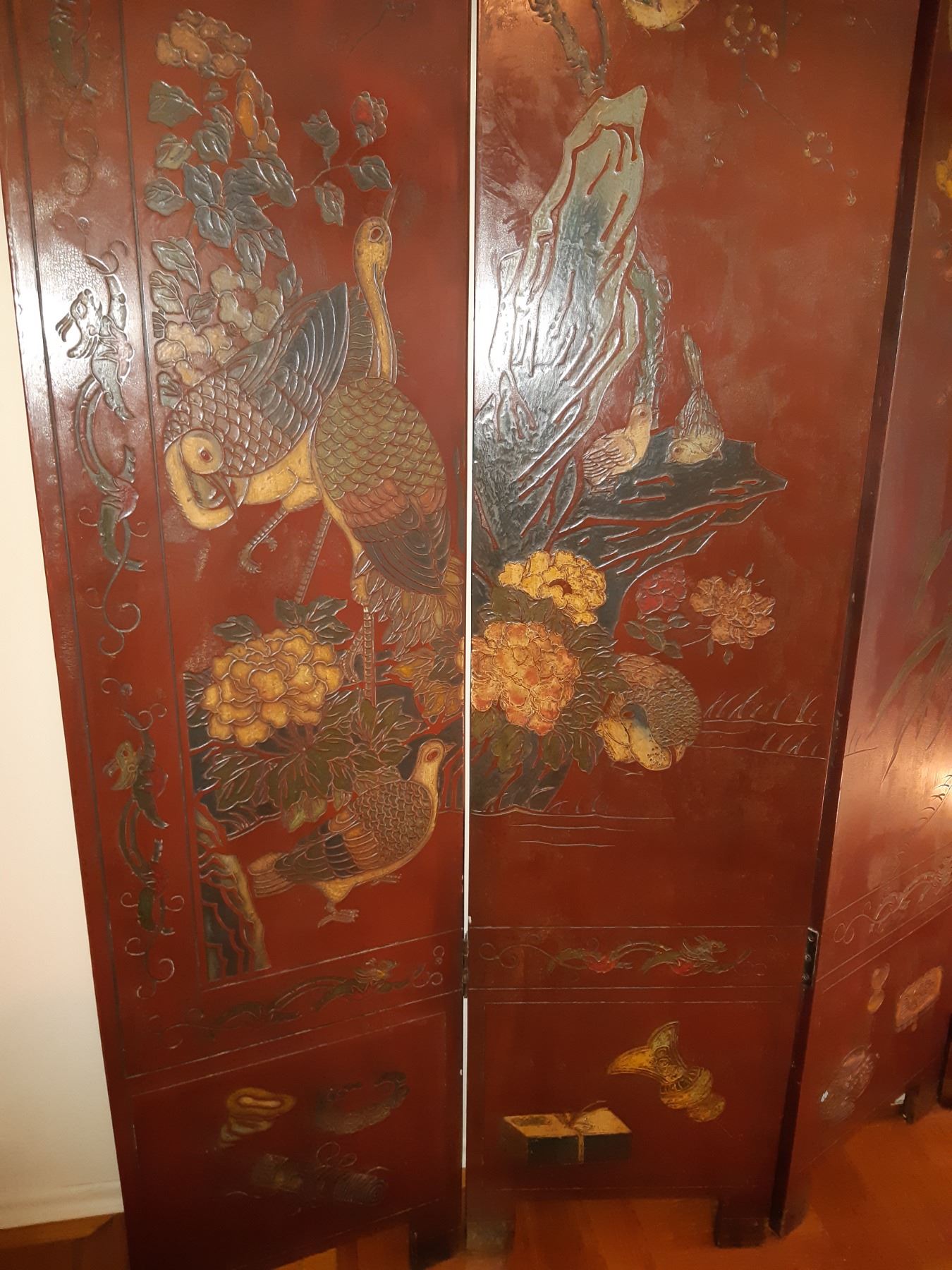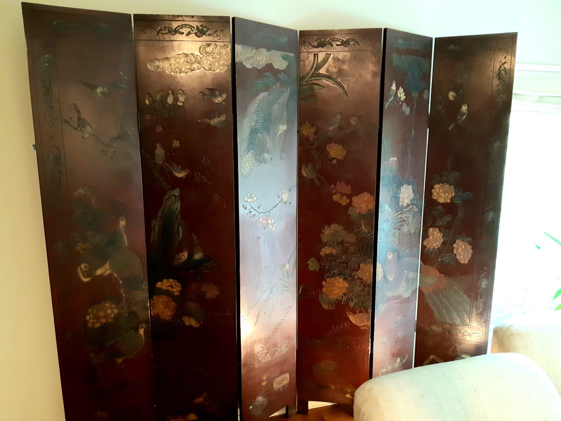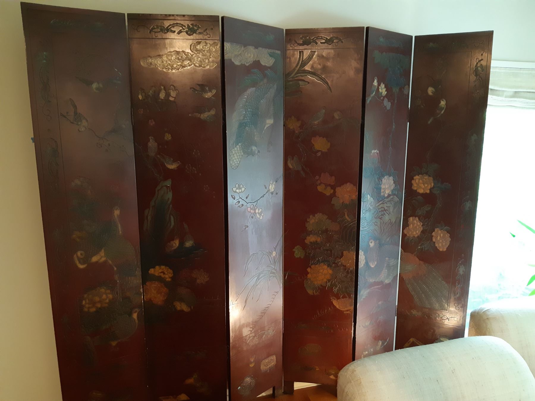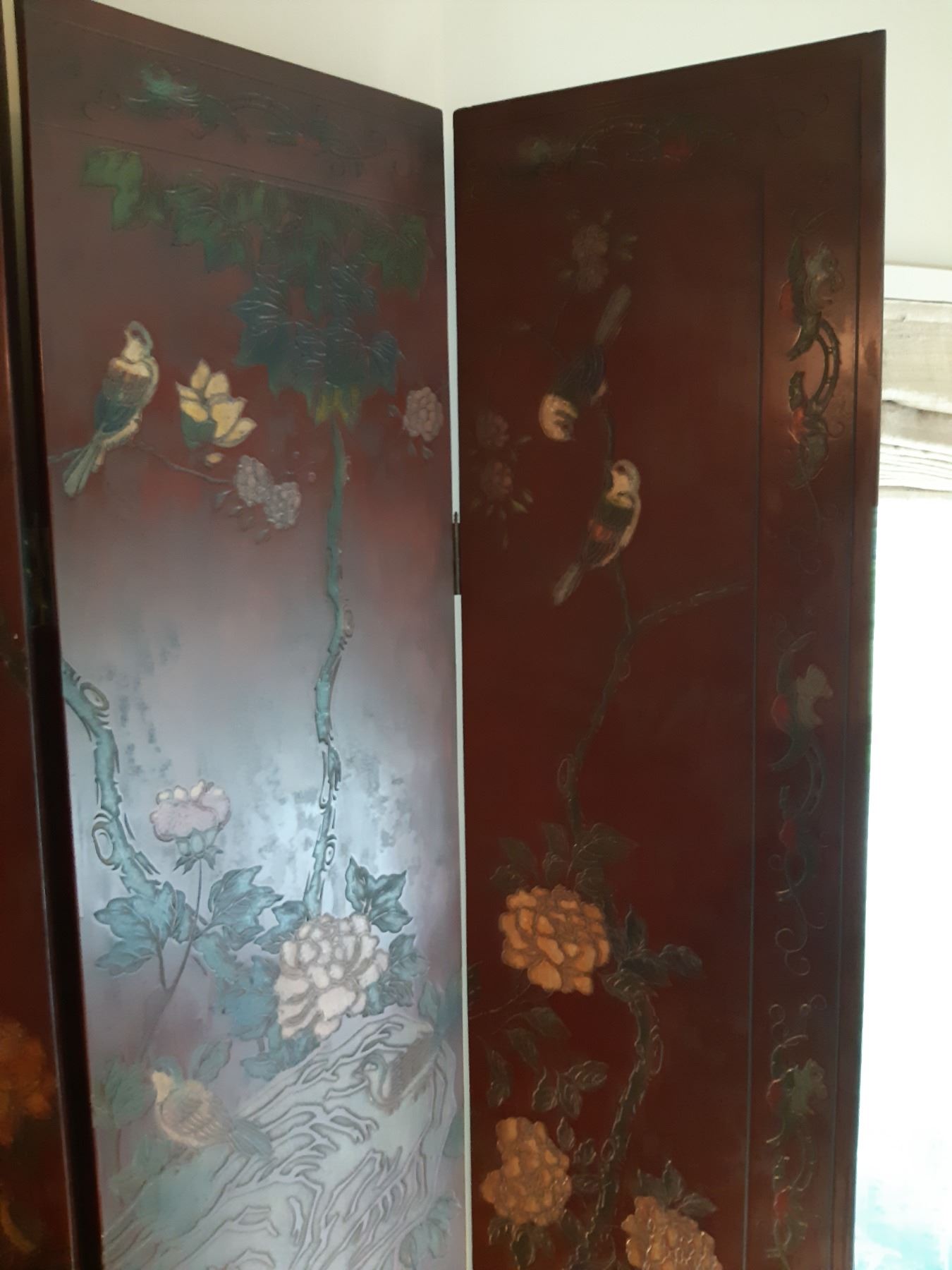 Ornate wood privacy screen featuring birds, flowers and branches on both sides. Each panel 16x84 (x6) Maynards estimated value $400.00 - $600.00.