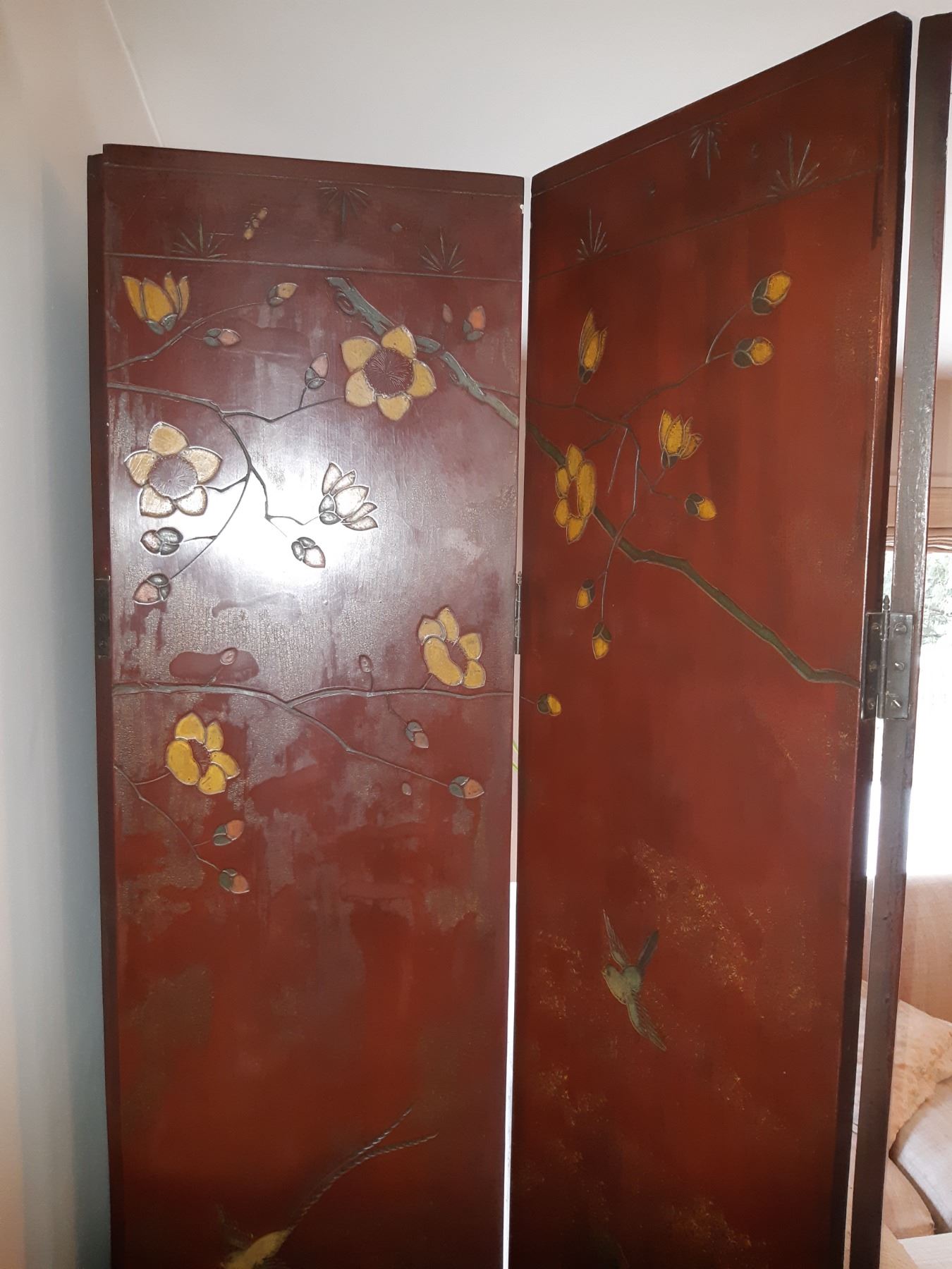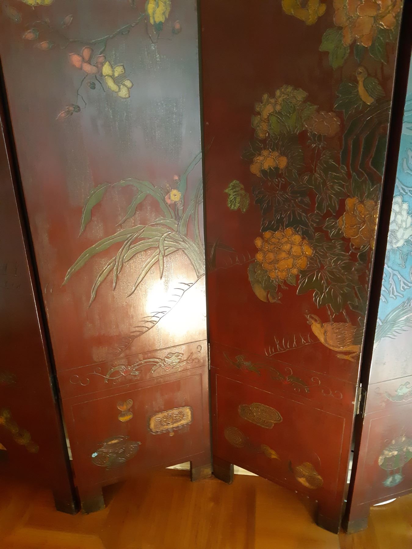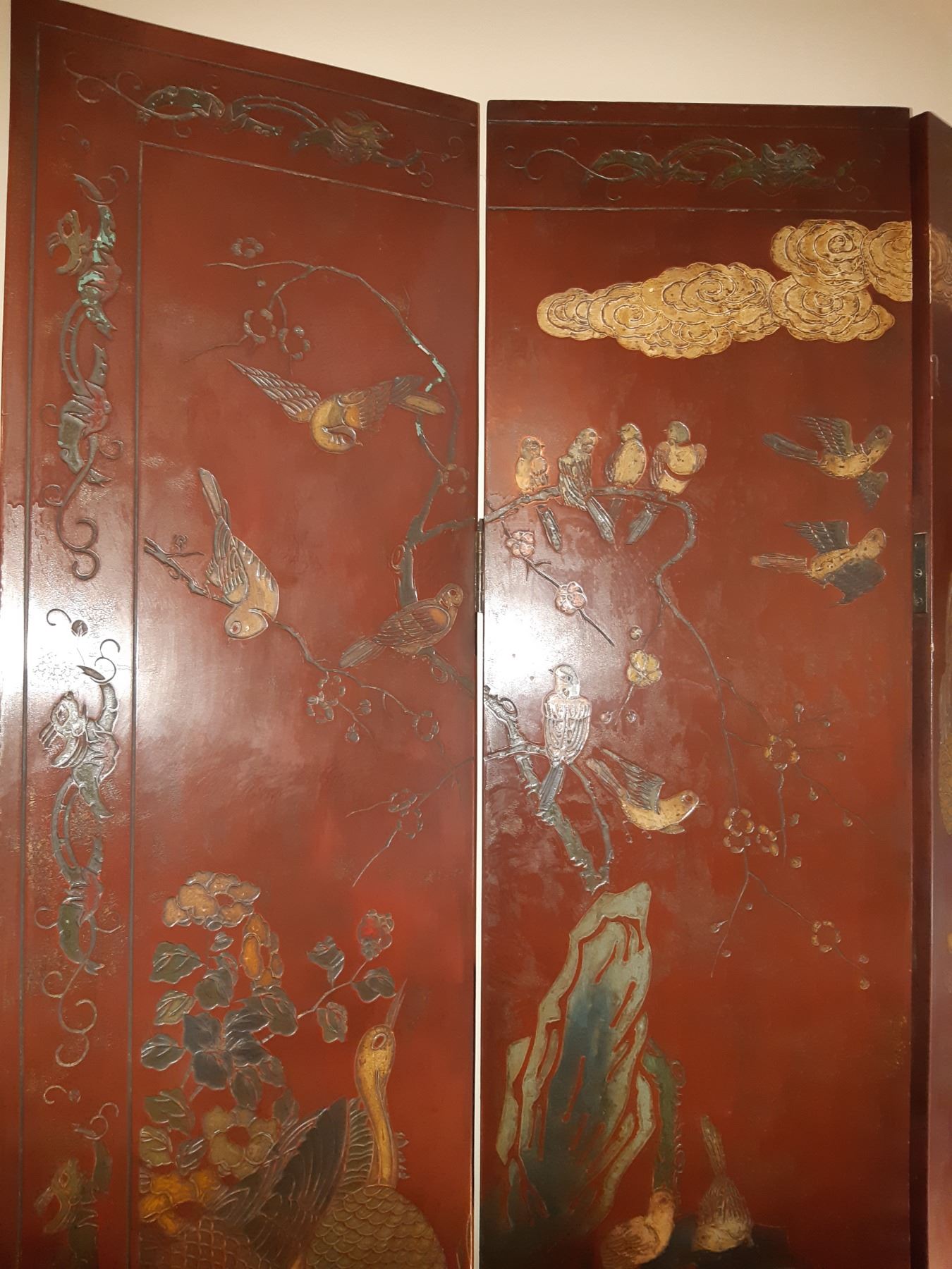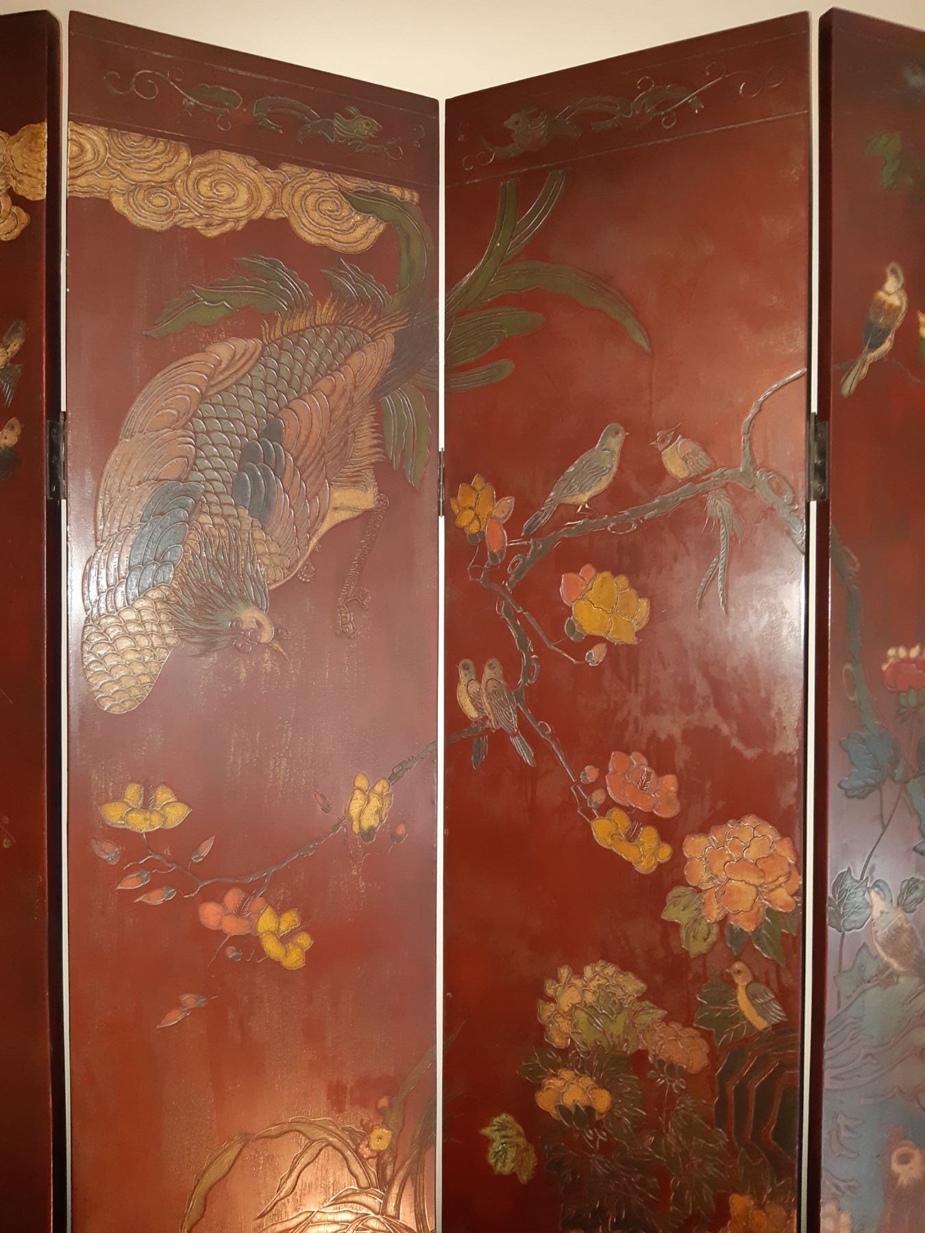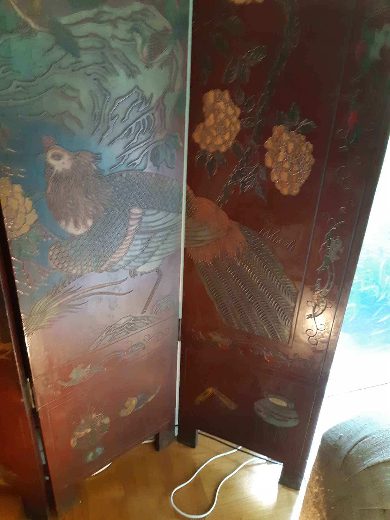 Ornate wood privacy screen featuring birds, flowers and branches on both sides. Each panel 16x84 (x6) Maynards estimated value $400.00 - $600.00.