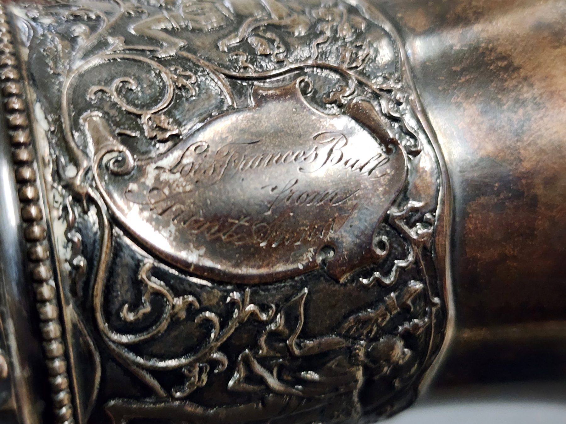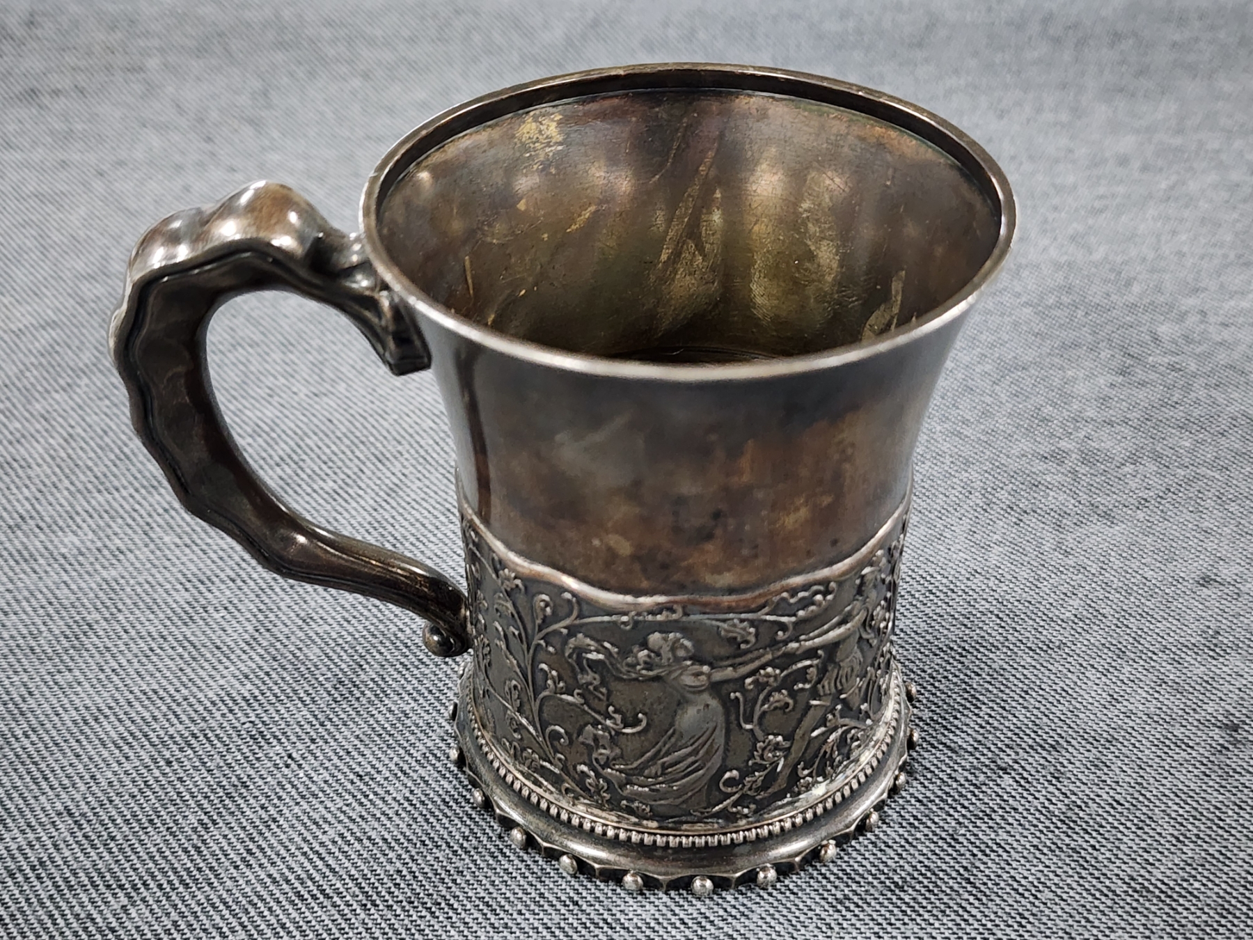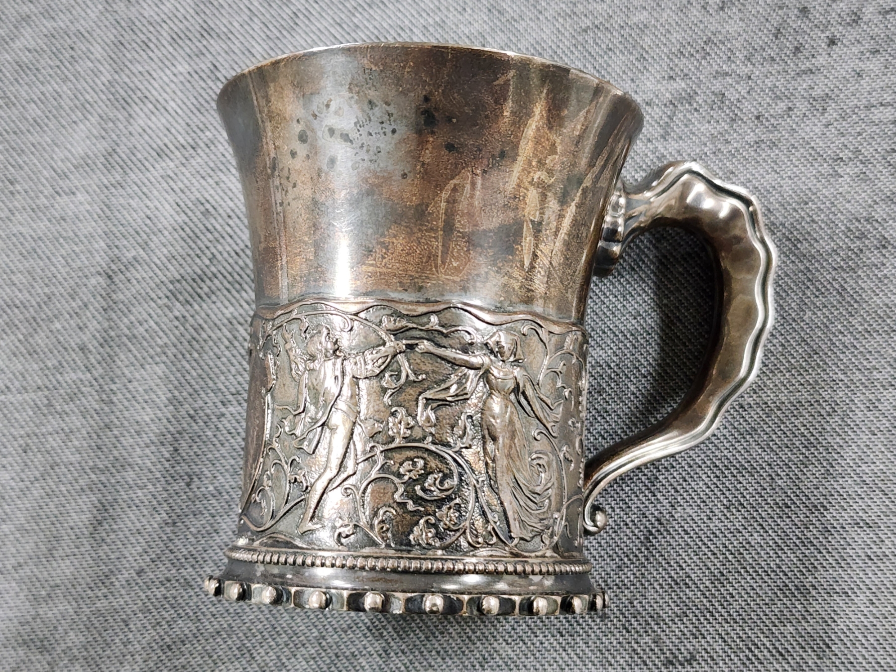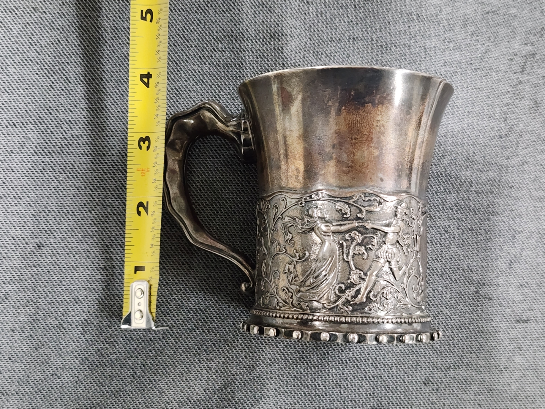 Antique Ornate Sterling Silver Cup With Wonderful Depiction On Side Weighing 224 Grams