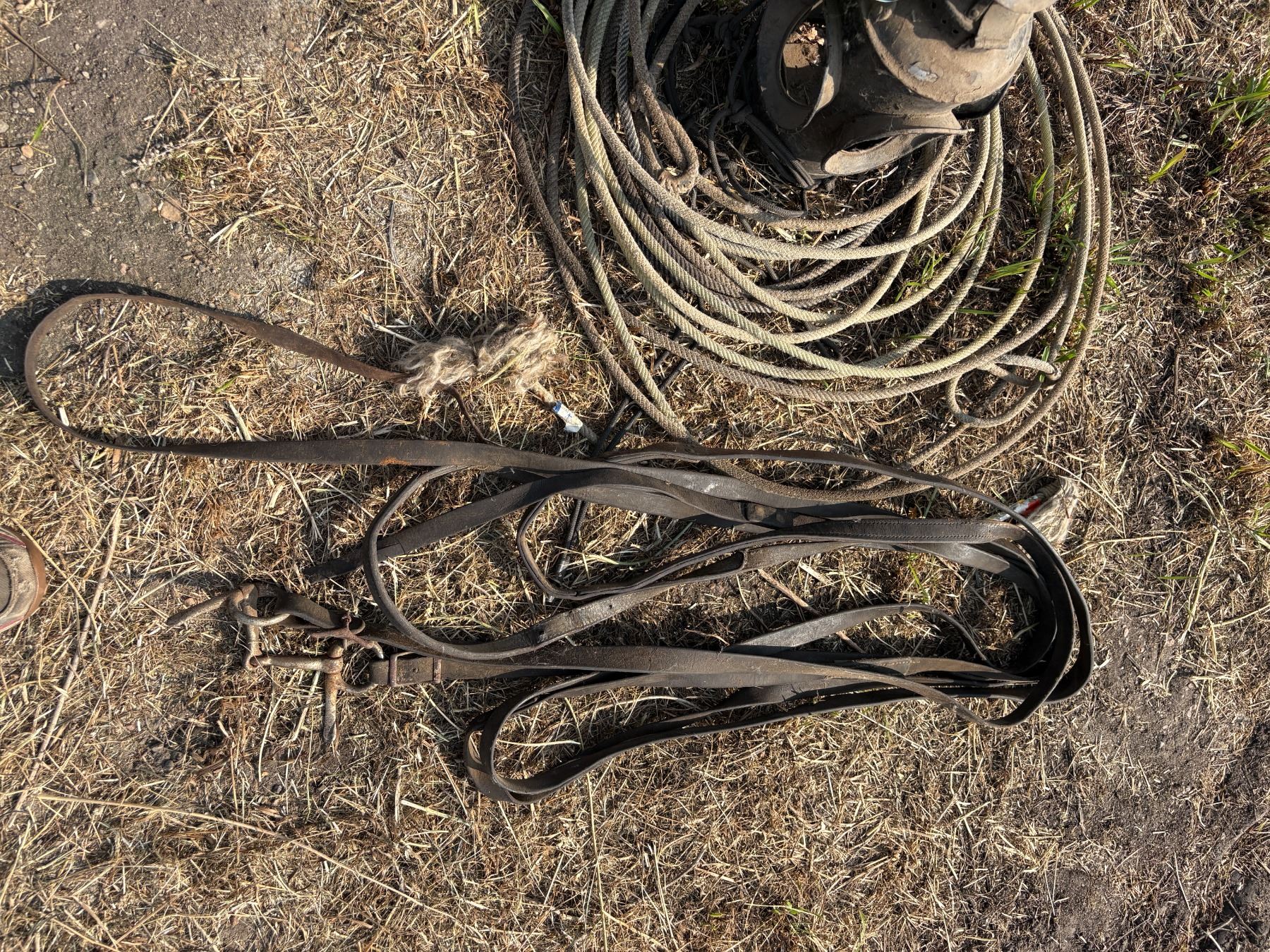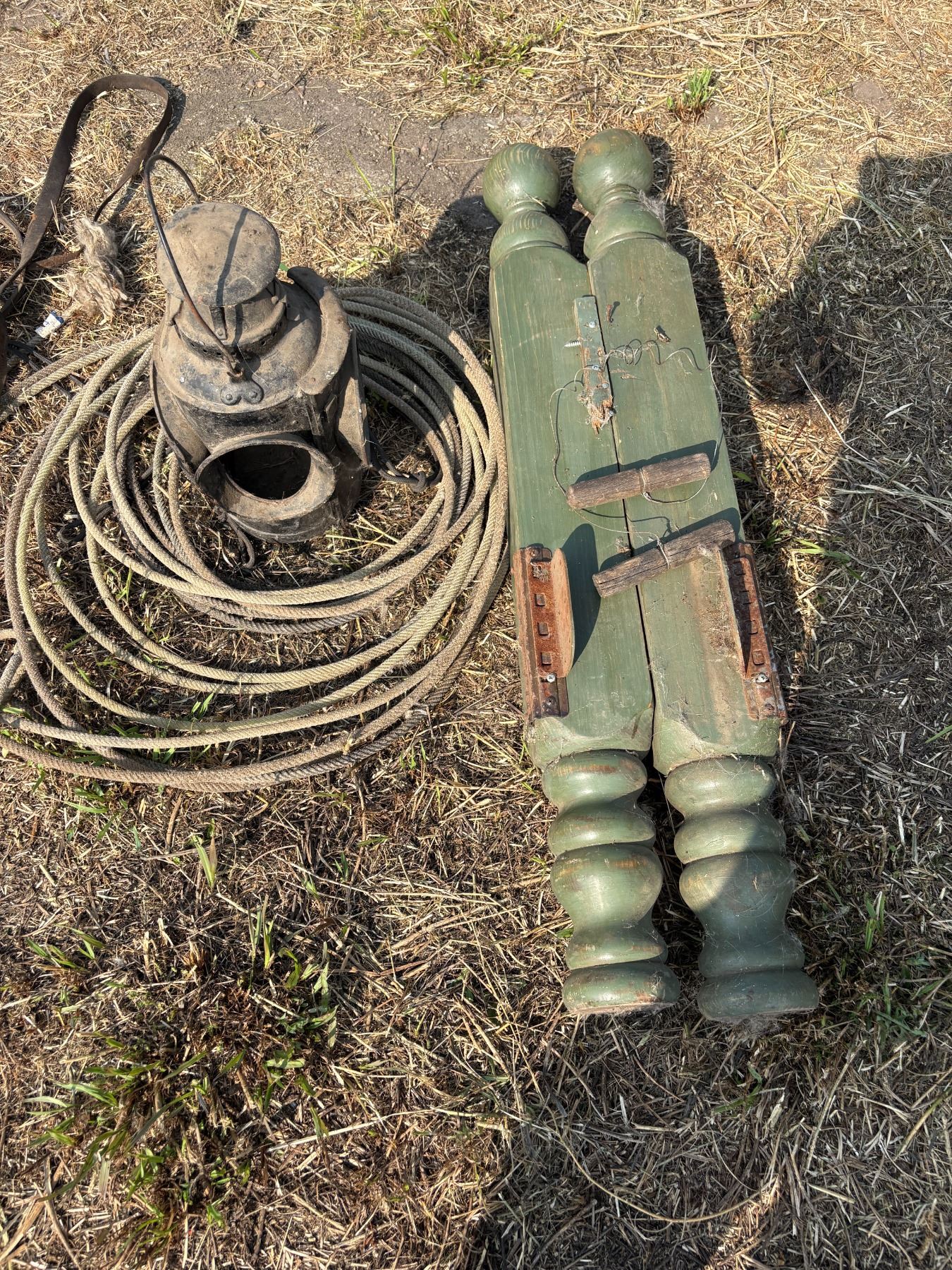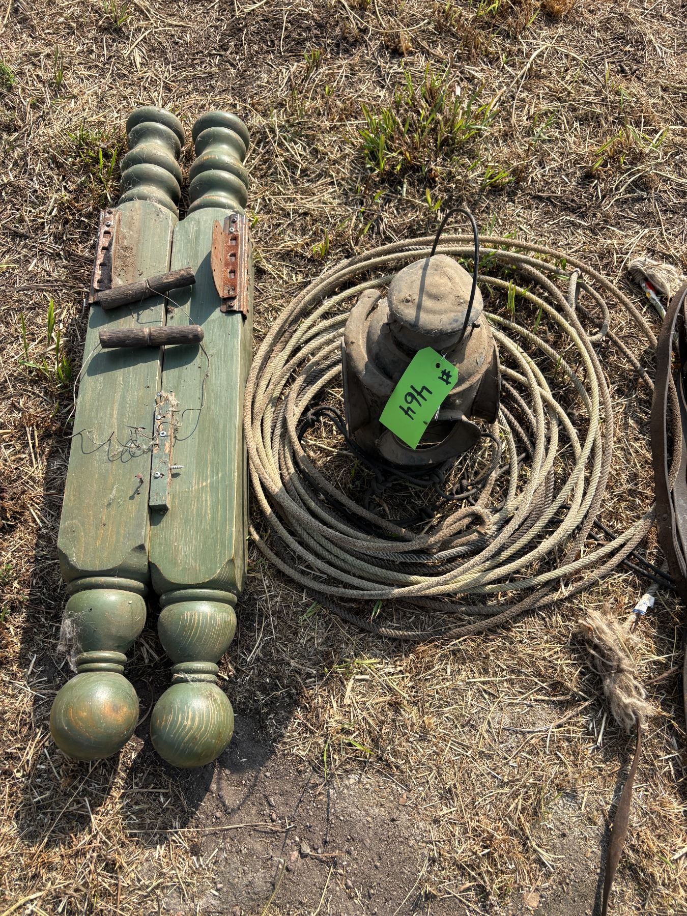 Antique R.R. LANTERN with no glass, lariat, two bed posts and two leather reins