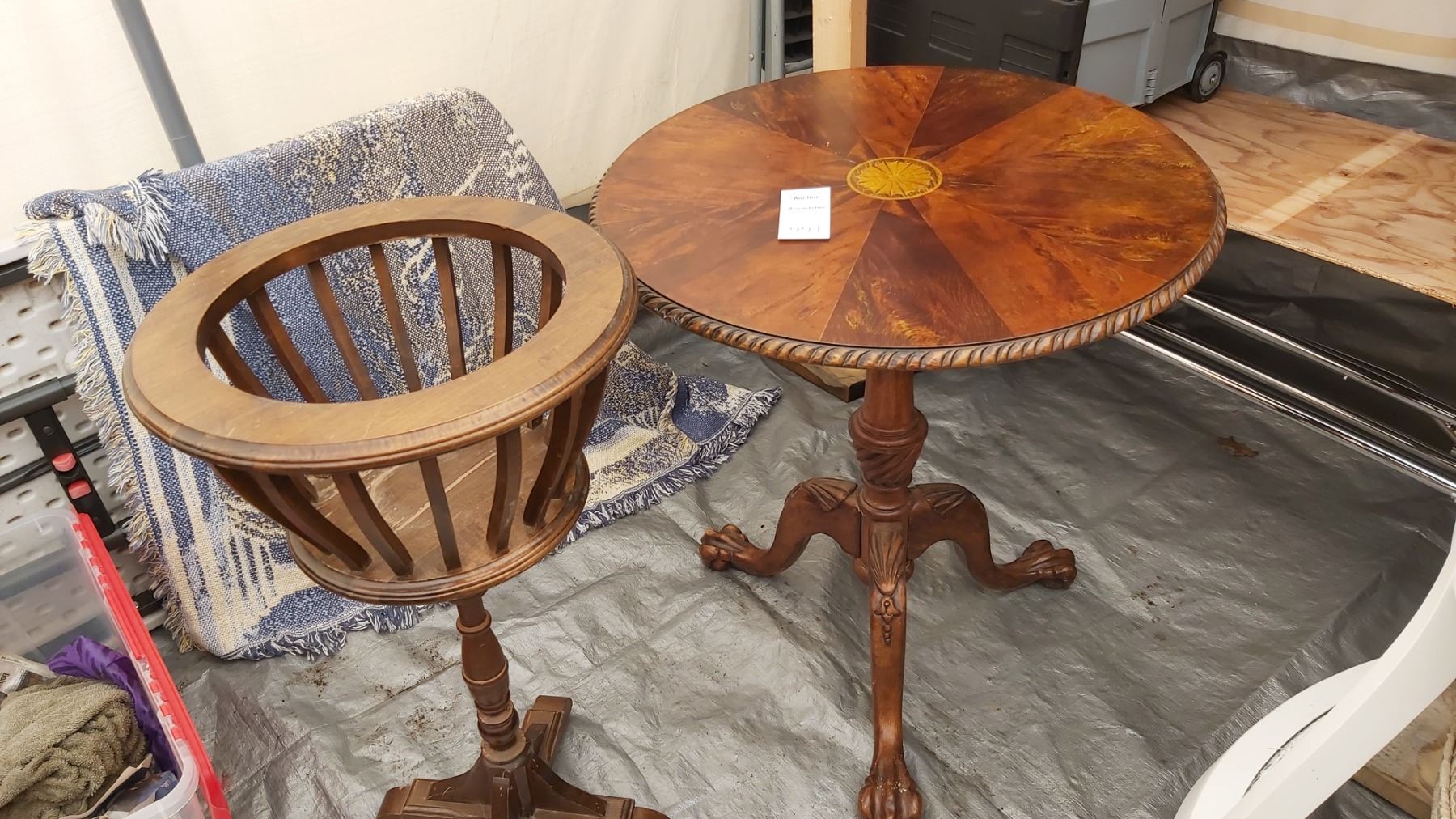3 footed table, note scratches & footed plant pot holder. Pickup at 11 am