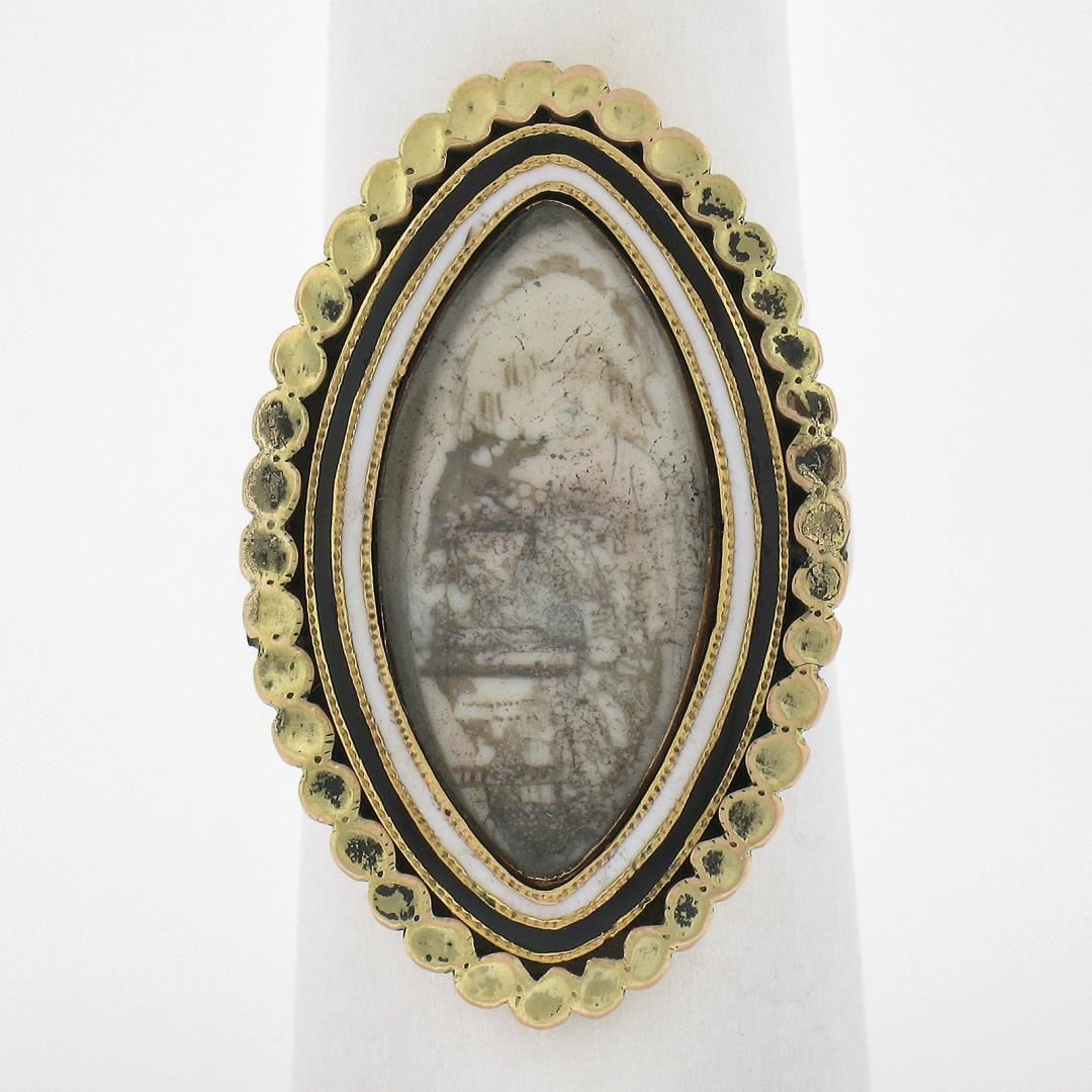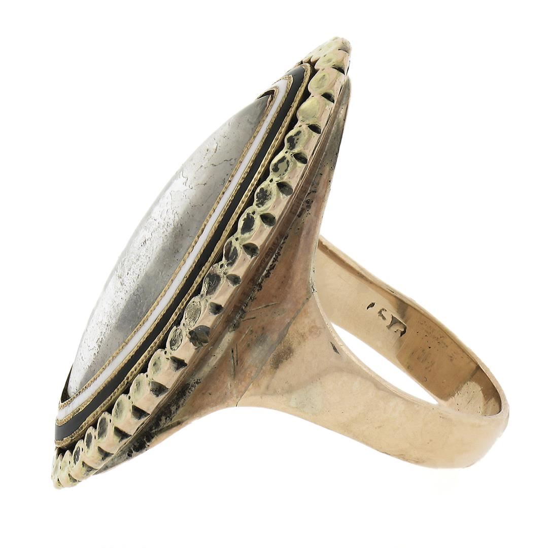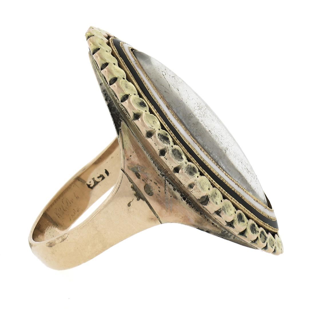 An antique solid 12k gold mourning ring with enamel work. The ring is size 6.0, weighs a total of 9.65 grams, and measures 30.9mm wide.