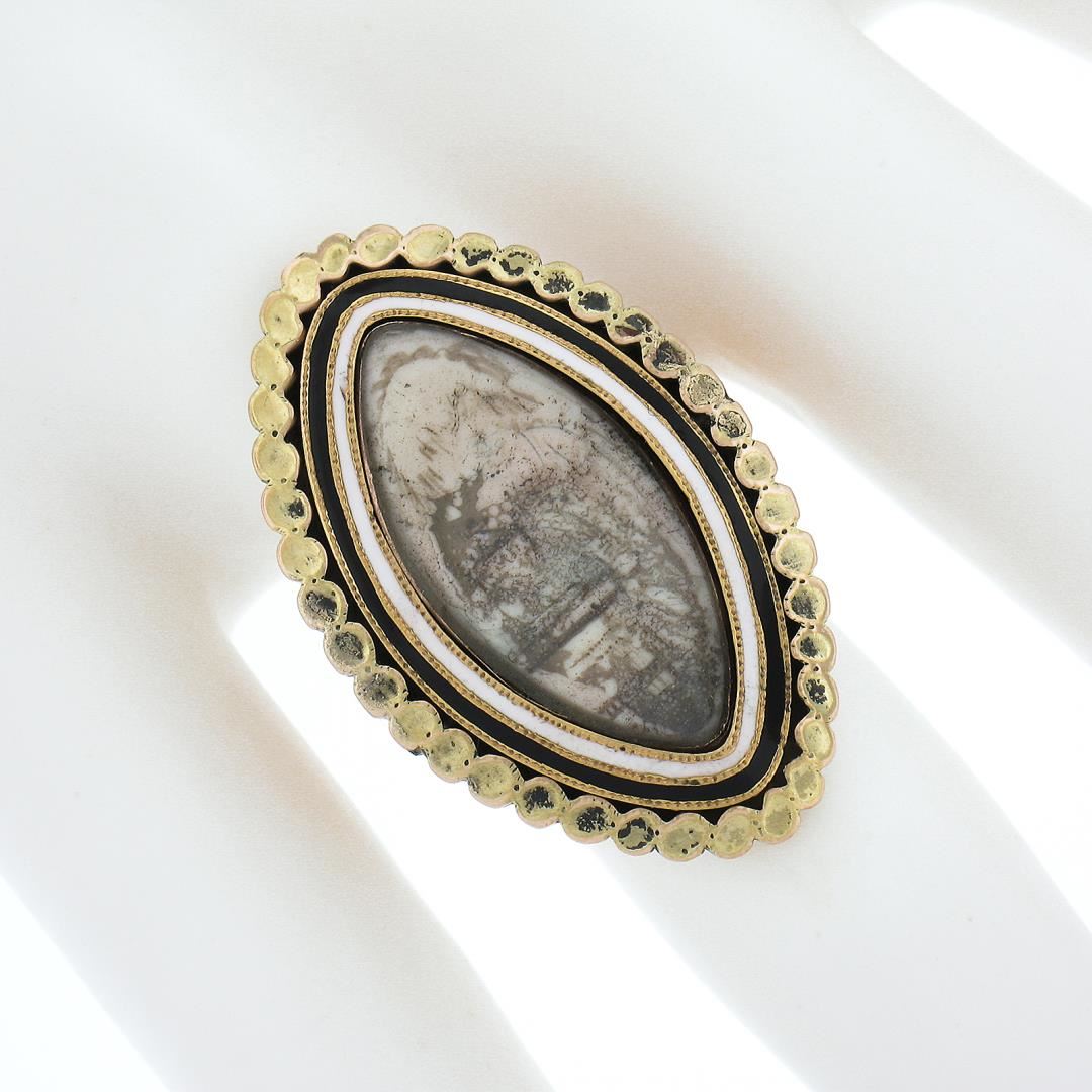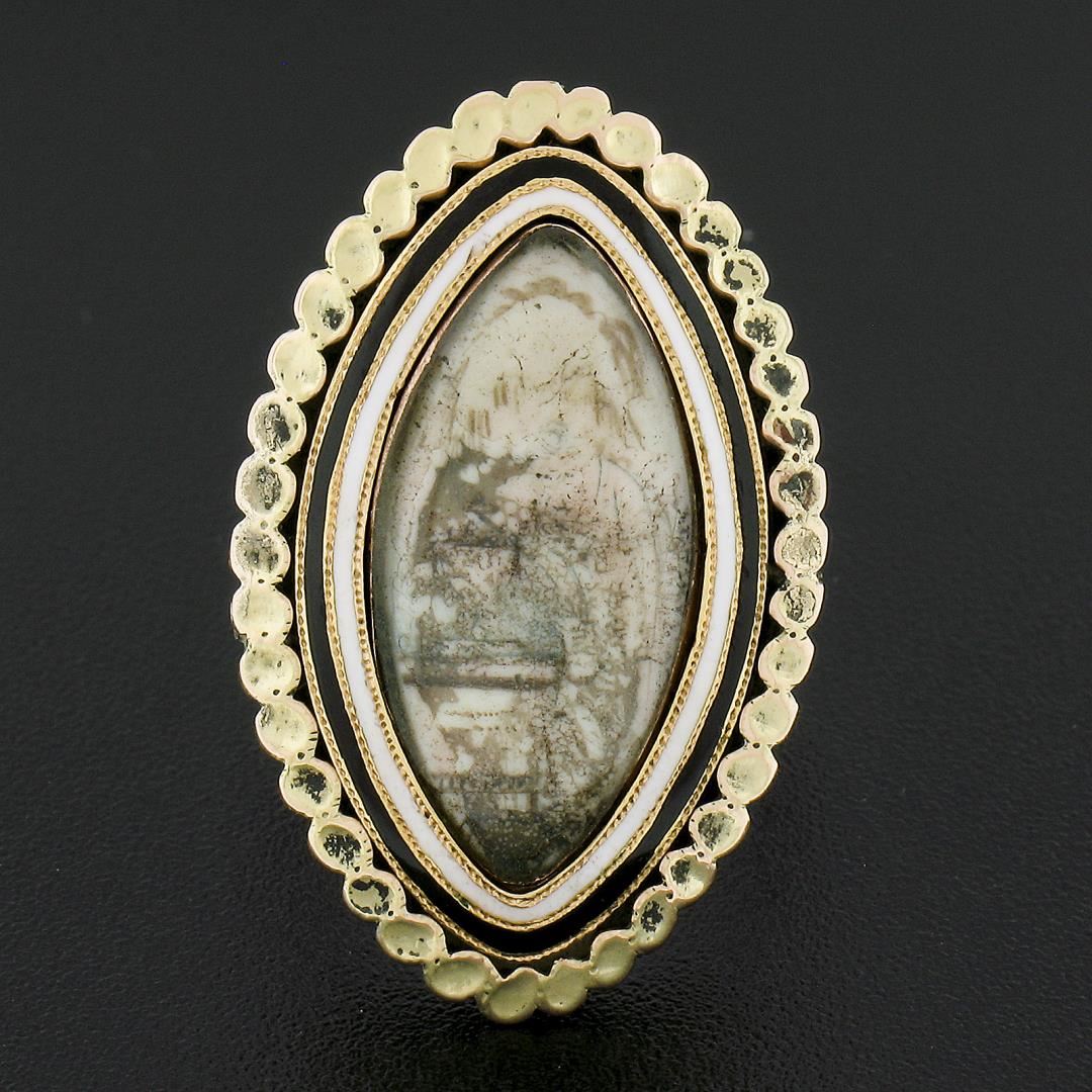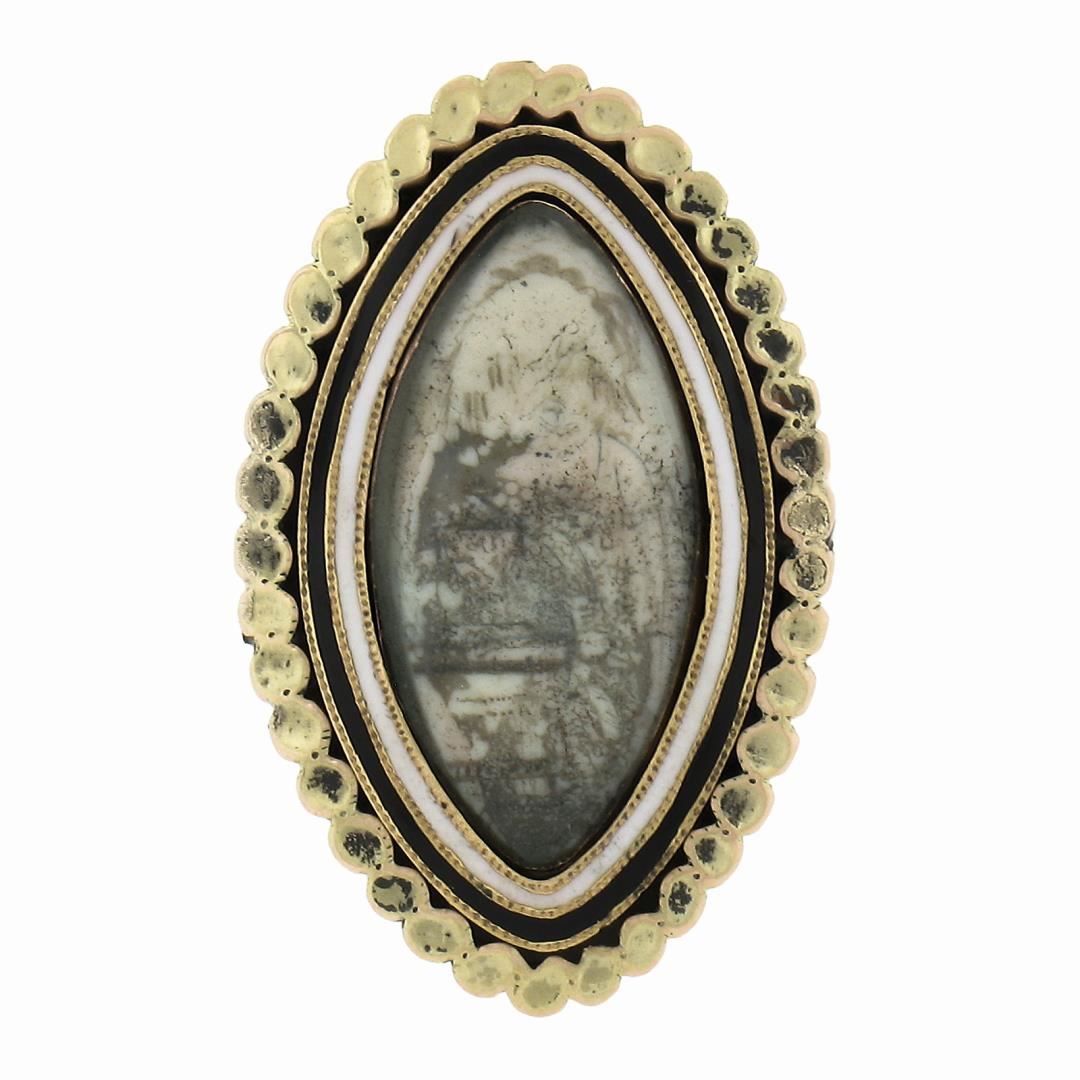 An antique solid 12k gold mourning ring with enamel work. The ring is size 6.0, weighs a total of 9.65 grams, and measures 30.9mm wide.