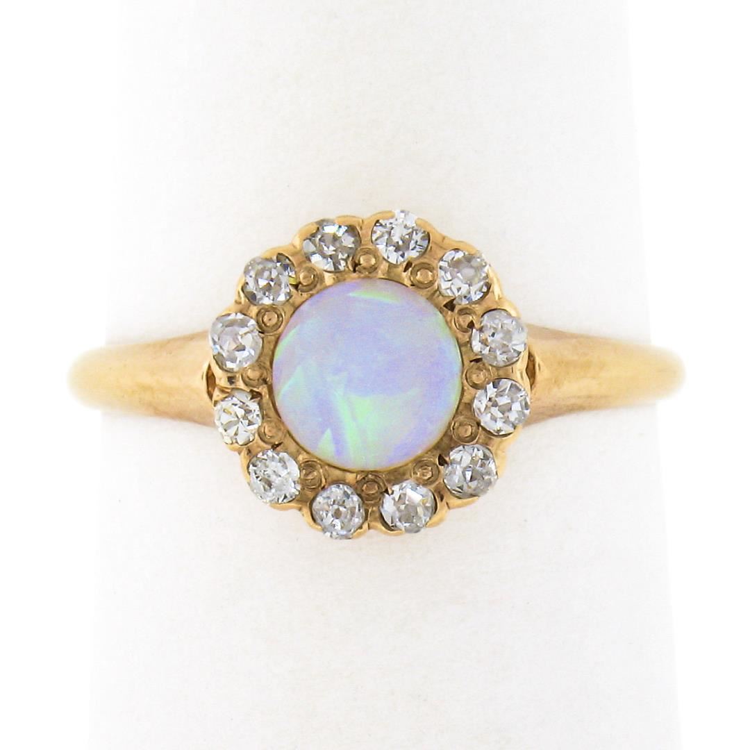 An antique solid 14k yellow gold ring, with 1 round cabochon cut natural opal (5.2mm), surrounded with a halo of 12 old mine and old single cut natural diamonds (G/H - VS2/SI1 ; 0.24ctw). The ring is size 5.0, weighs a total of 1.38 grams, and measures 8.9mm wide.