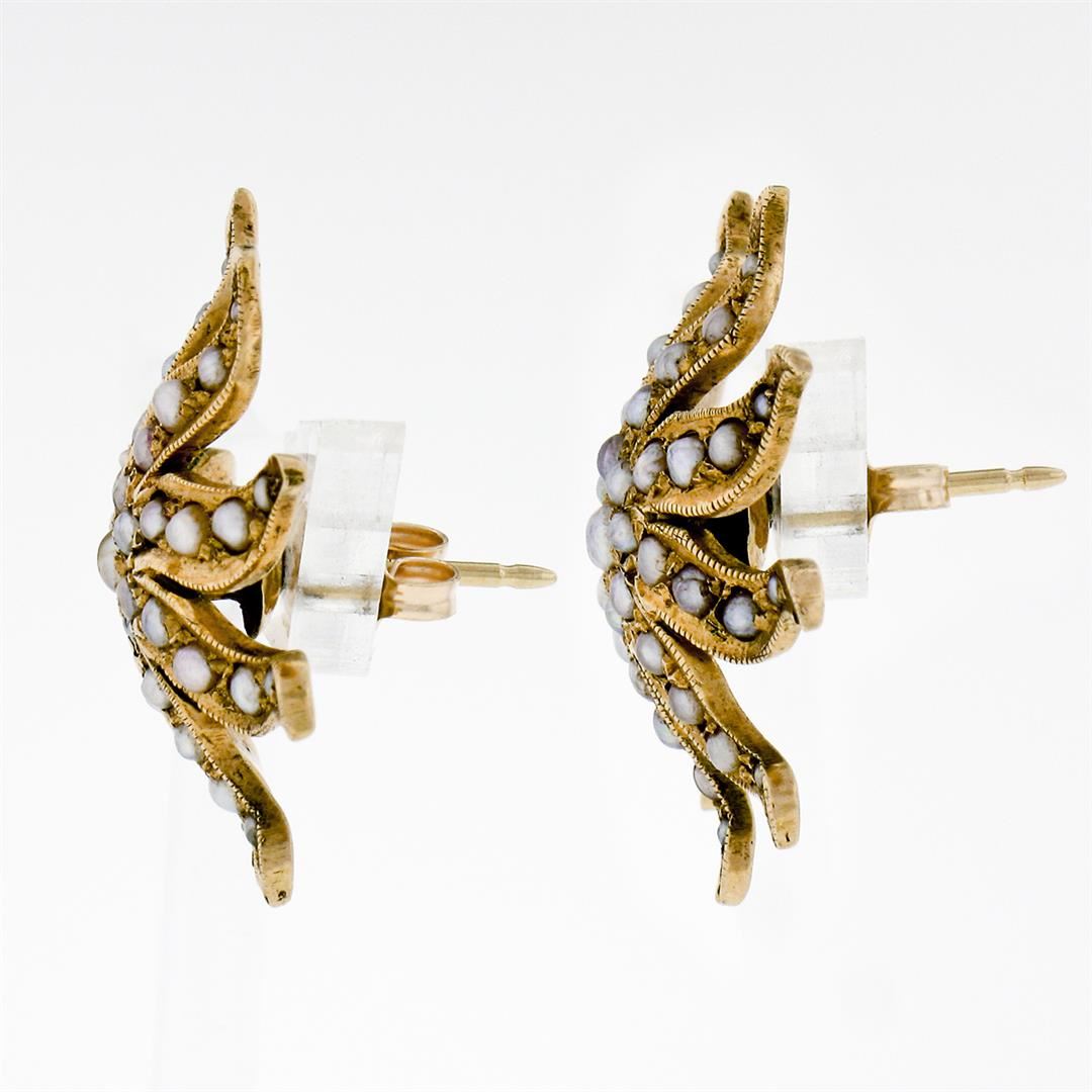 An antique solid 14k yellow gold starburst stud earrings, with 90 round bead shape natural seed pearls (1.30 to 2.50mm). The earrings measure approximately 25.45mm in diameter and weigh a total of 8.0 grams.