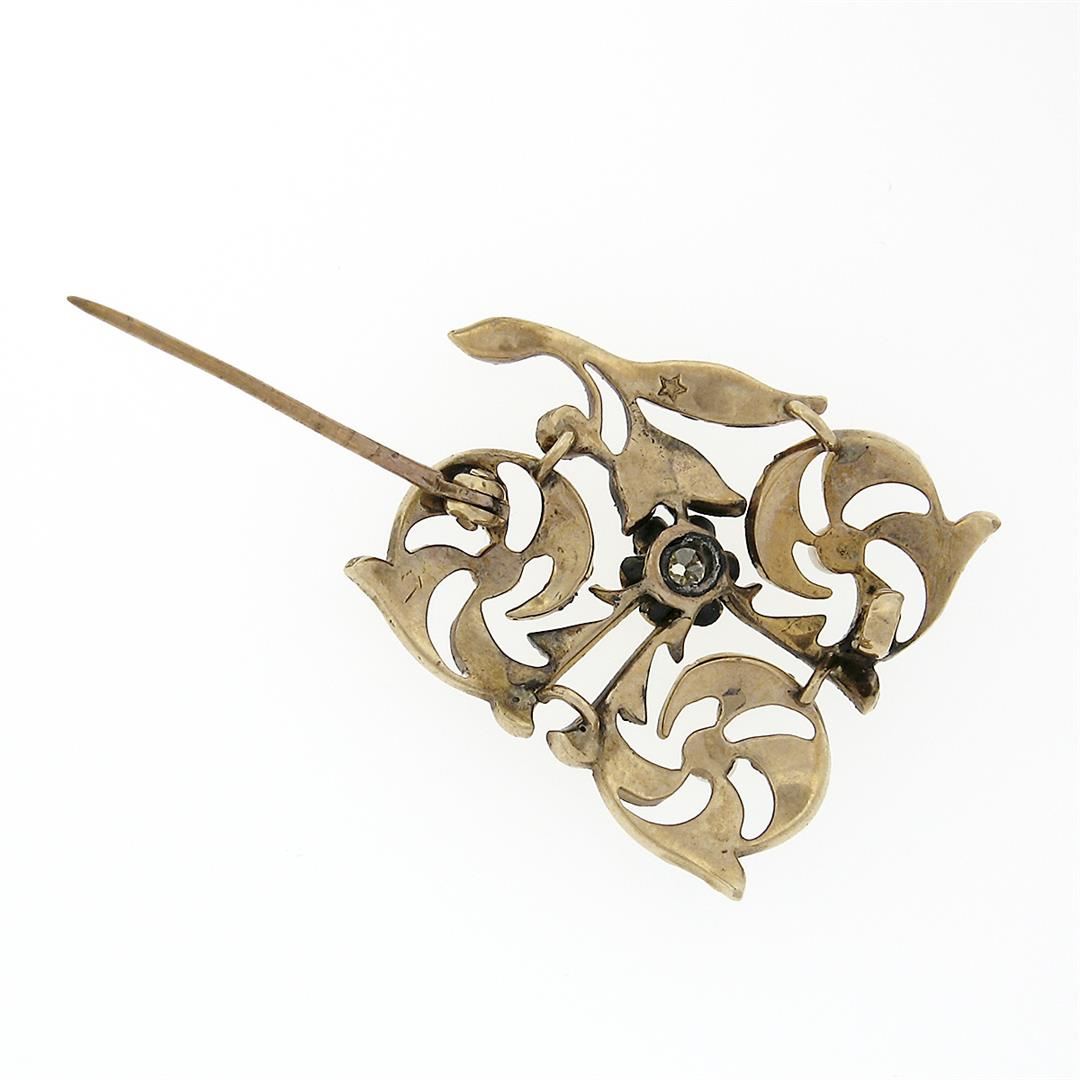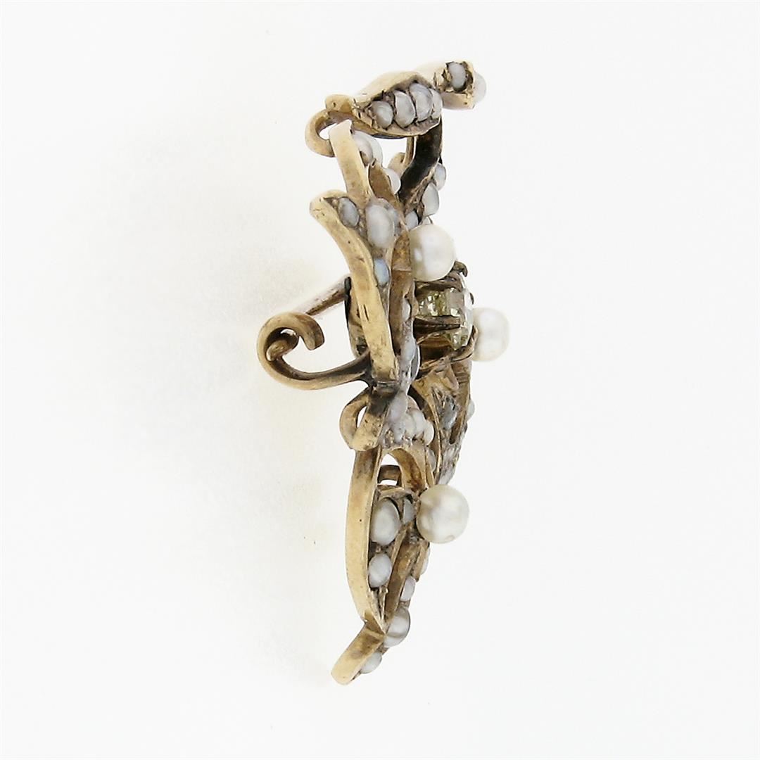 An antique victorian solid 14k yellow gold floral pin brooch,with 1 old mine cut natural diamond (VS2; K/L - 0.16ctw), surrounded with numerous of round shape cultured seed pearls. Measures 25.4x32mm and weighs a total of 4.05 grams.