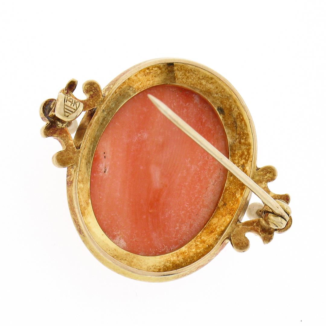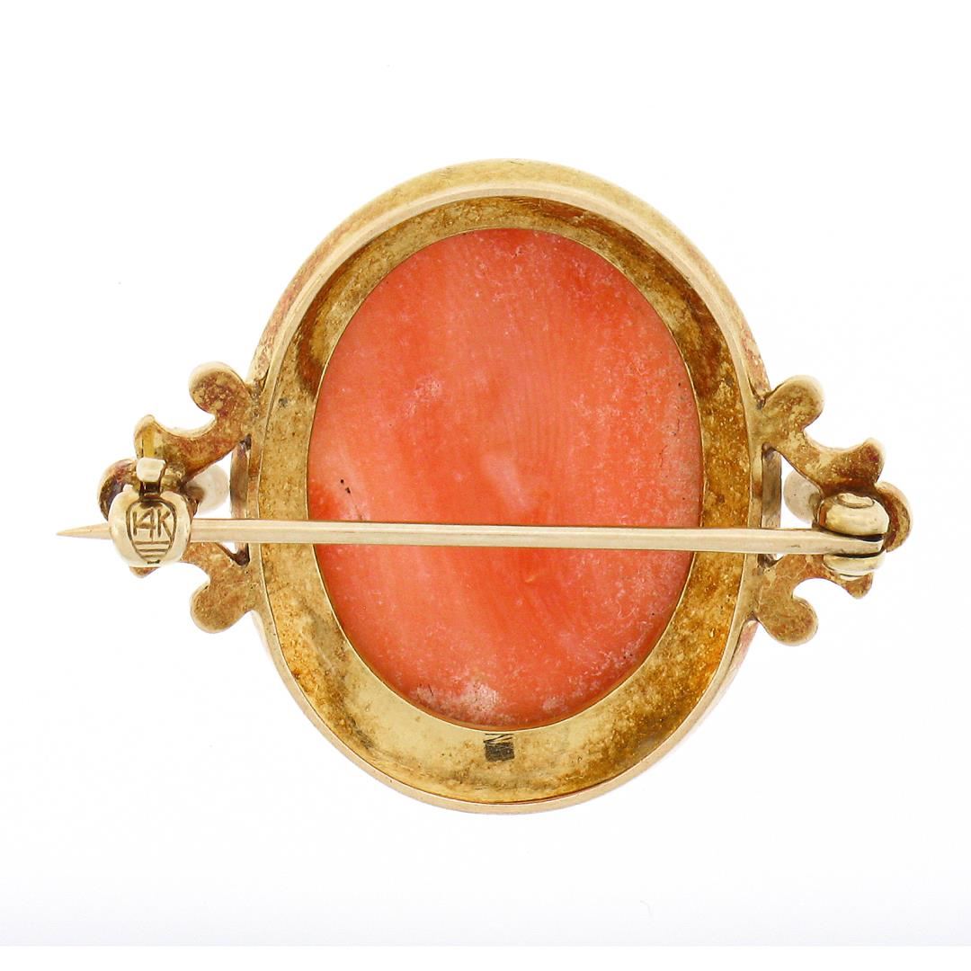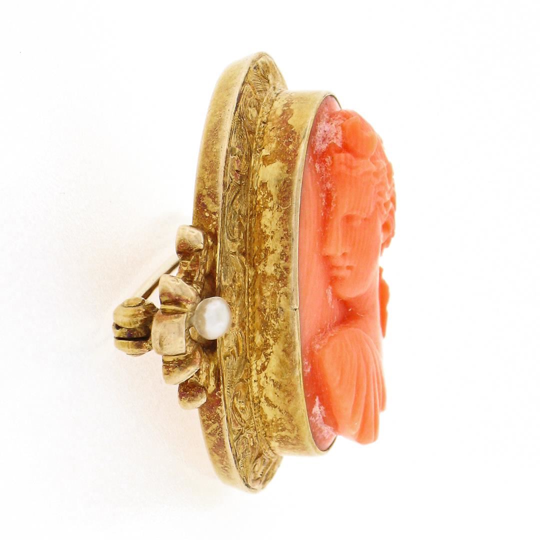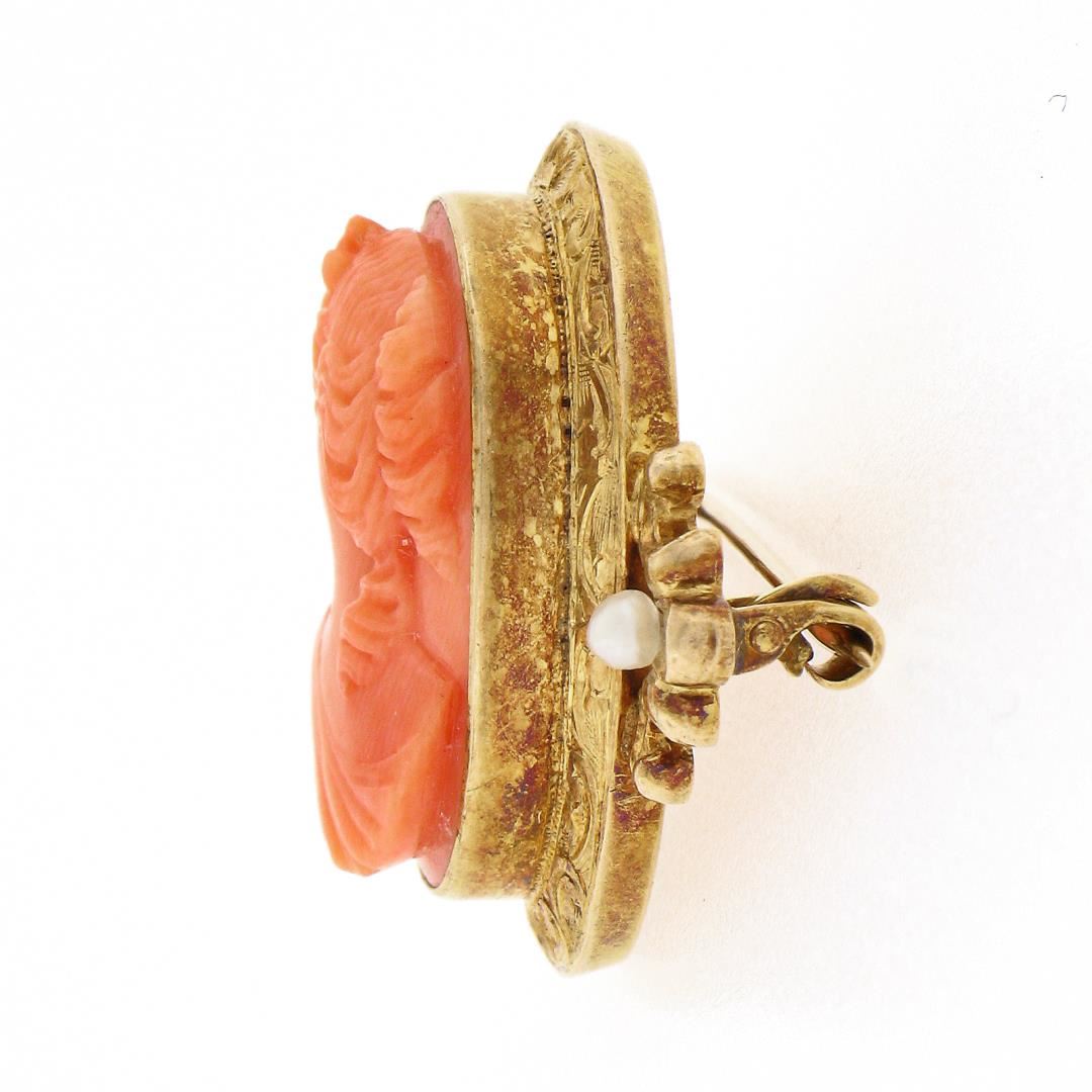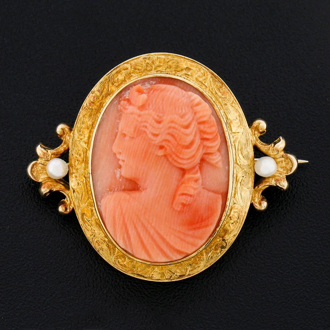 An antique solid 14k yellow gold brooch, with 1 oval carved cameo natural coral (20.3x15mm ), and 2 round shape cultured seed pearls (2.5mm each). Measures 25x29.7mm and weighs a total of 6.0 grams.