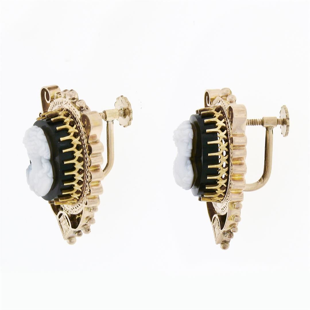 Antique Victorian 14k Gold Oval Black & White Carved Cameo Brooch & Earrings Set