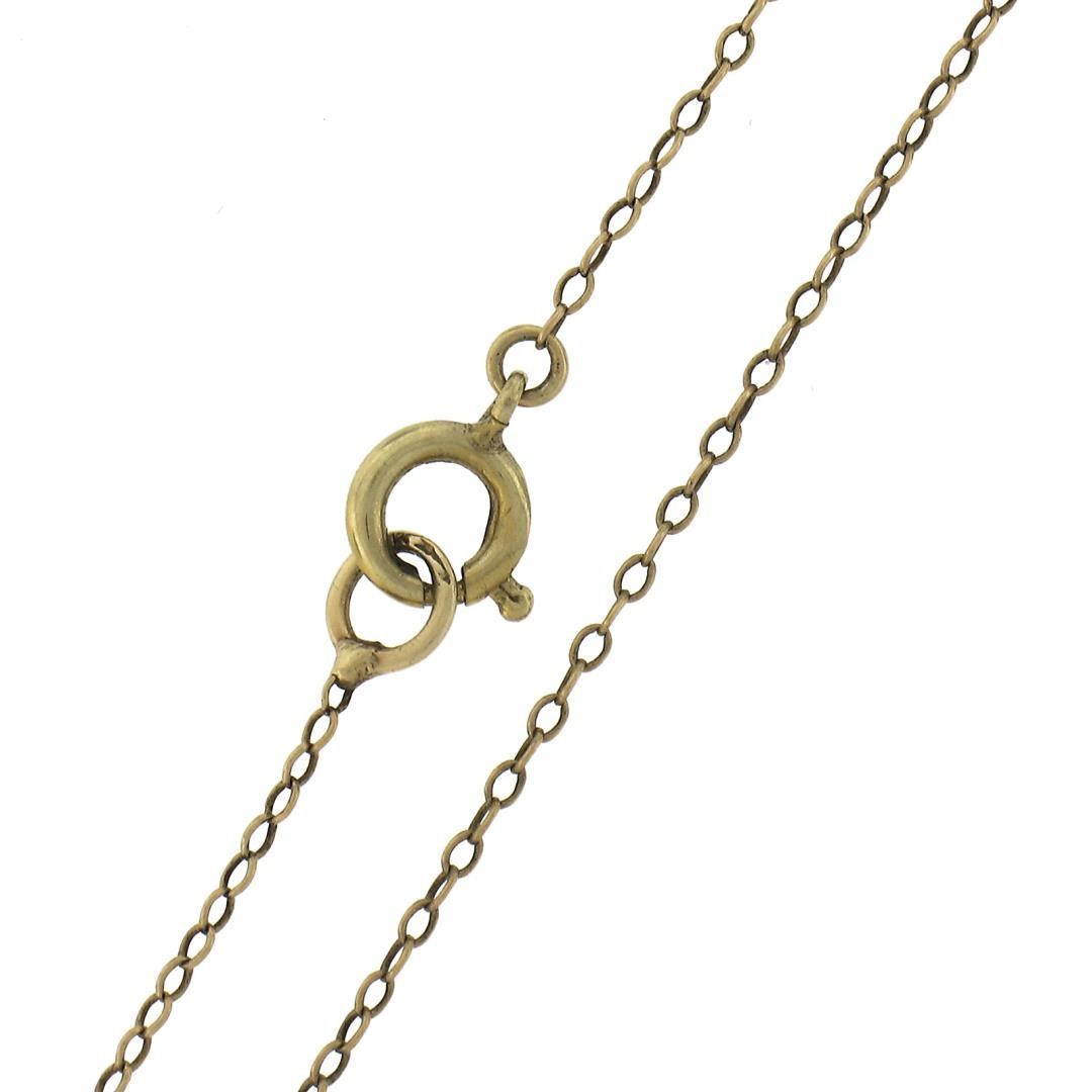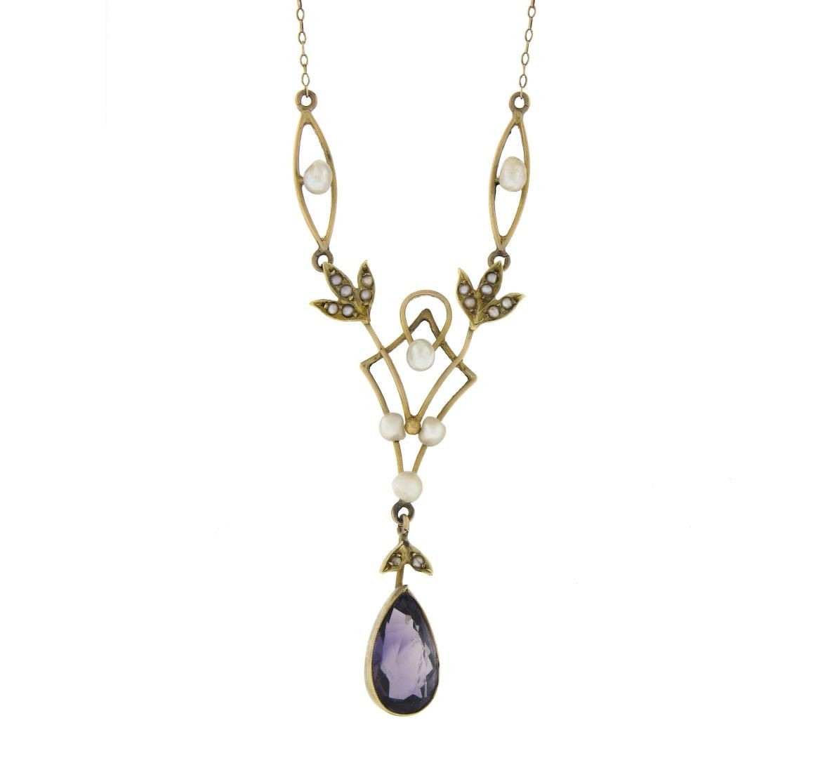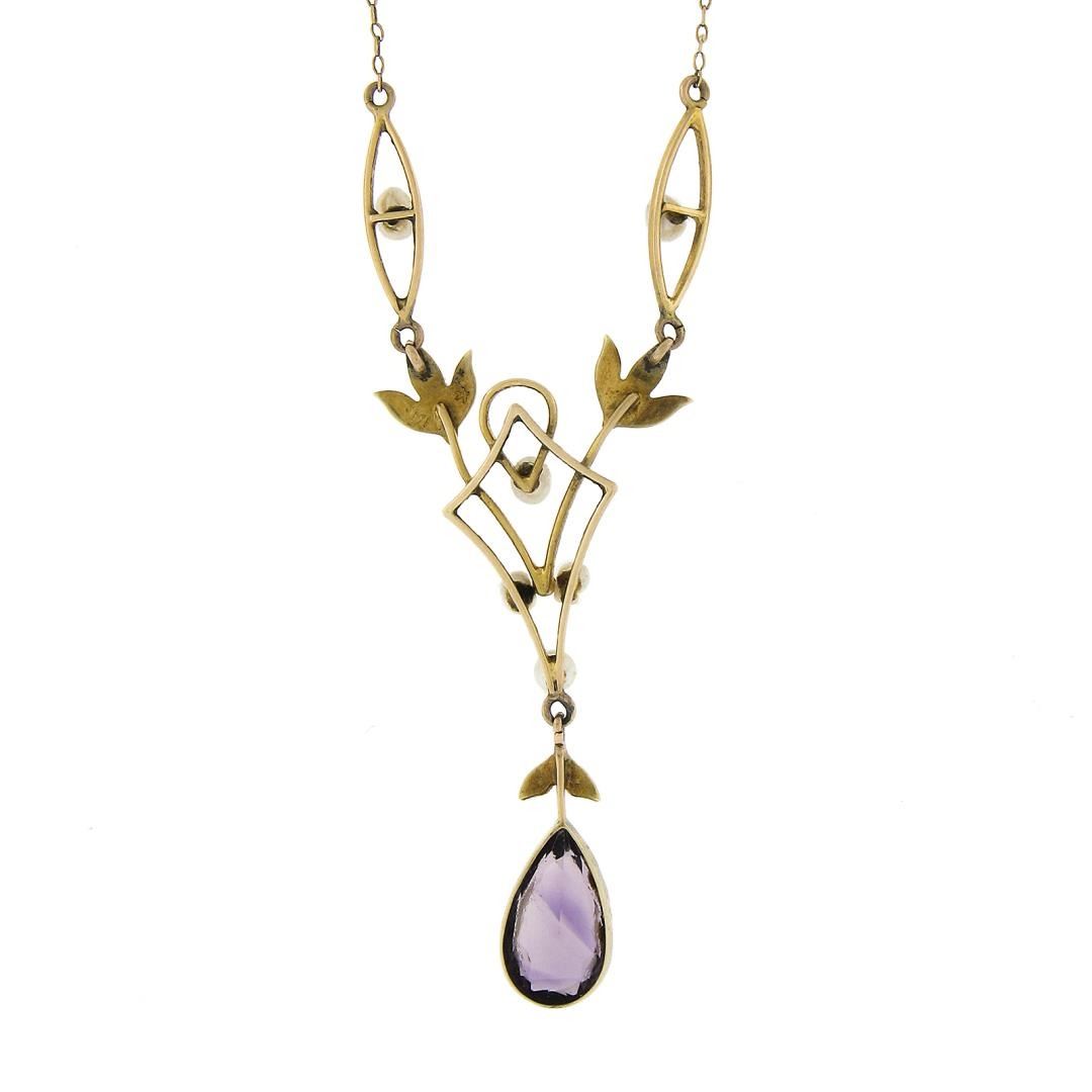An antique solid 14k yellow gold lavalier necklace, with 1 pear cut natrual amethyst (11.6x6.7mm), and 20 bead shape cultured seed pearls (0.8mm to 3.1mm). 19.25 inch cable link chain, 3.76 grams total weight, pendant measures 44.9x21.6mm.