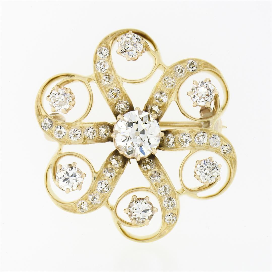 An antique victorian solid 18k yellow gold swirl flower pin brooch, with 37 old european cut natural diamonds (G/H - VS2/SI1 ; 1.97ctw). Measures 25.20x22.90mm and weighs a total of 6.61 grams.