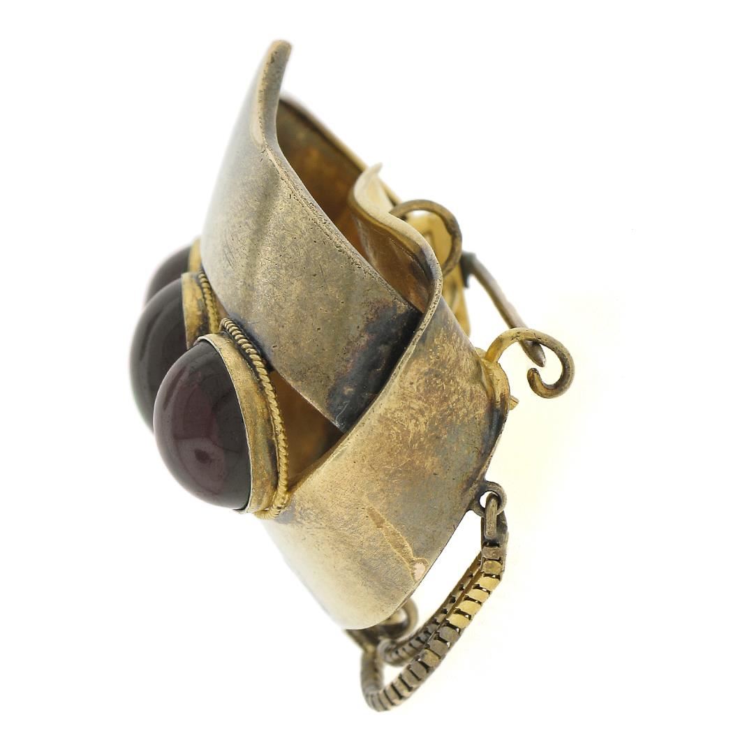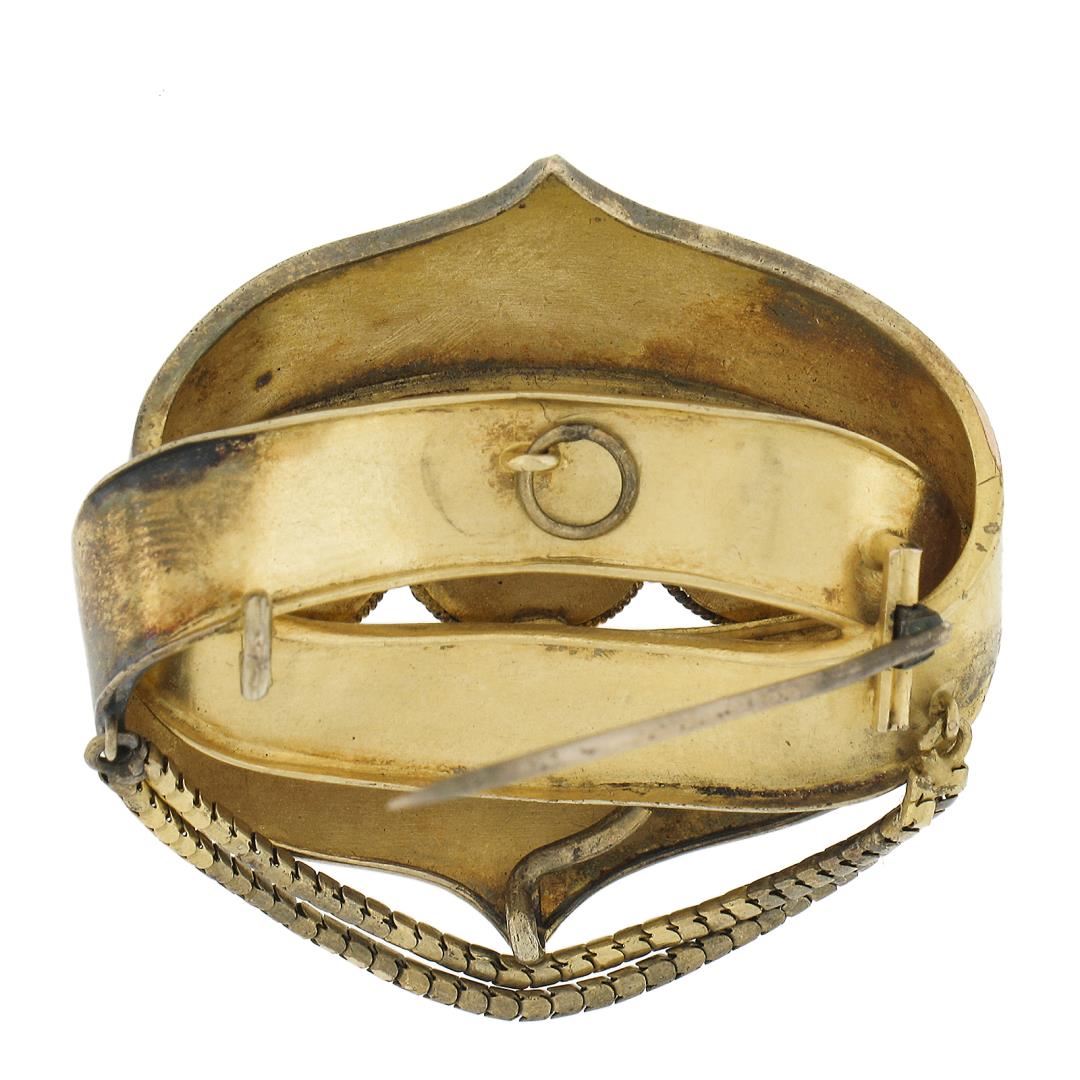 An antique solid 18k yellow gold brooch pendant scarf tie, with 3 round cabochon cut natural garnets (11.2mm & 10.3mm). Measures 42.5x42.2mm and weighs a total of 13.52 grams.