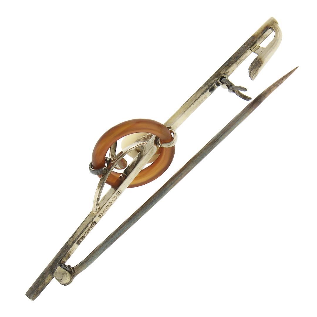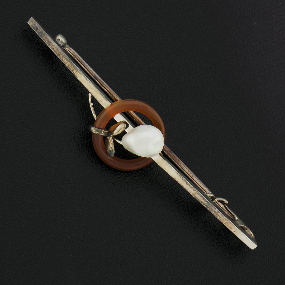 An antique solid 9k yellow gold bar pin brooch, with round ring natural carnalian (11mm), and 1 baroque pearl. Measures 48x11mm and weighs a total of 1.74 grams.