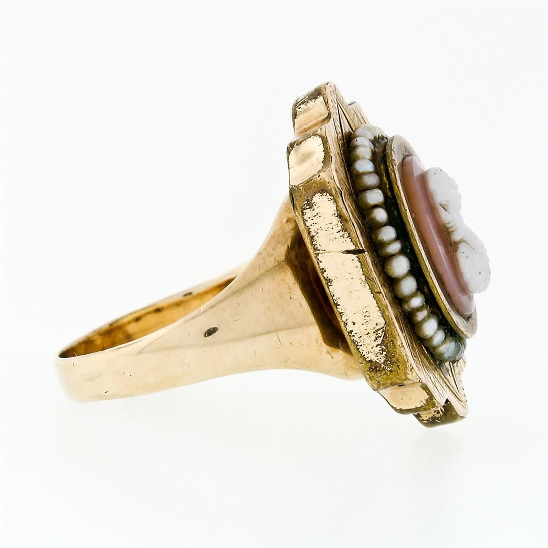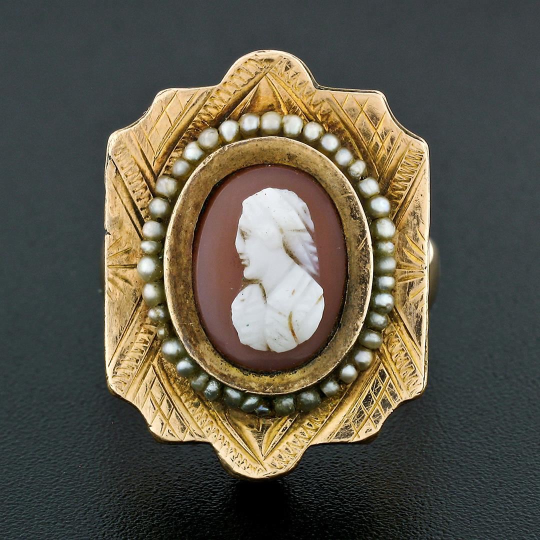 A Victorian solid 10k yellow gold cameo ring, with 1 oval shape carved agate (11.73x8.77mm), surrounded with 40 oval bead shape natural seed pearls (1.50x0.85mm). The ring is size 9.0, weighs a total of 12.82 grams, and measures 24.88mm wide.