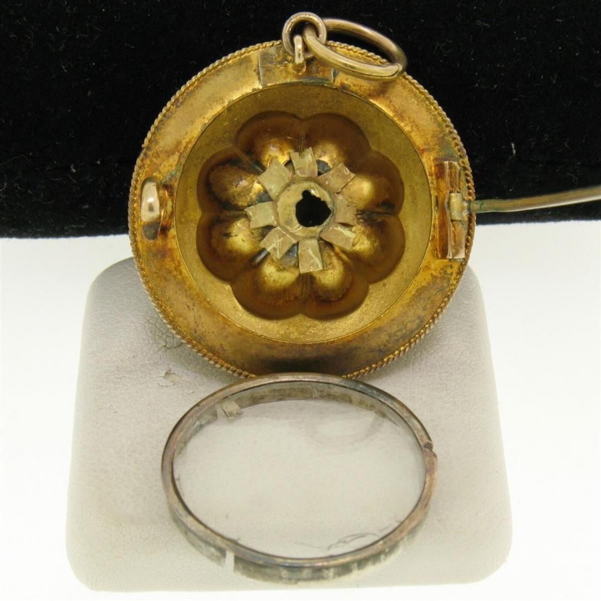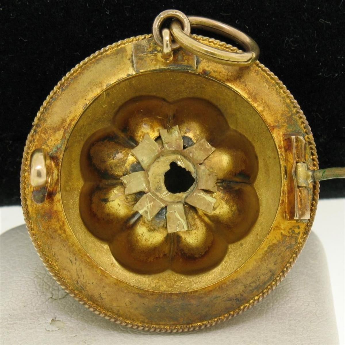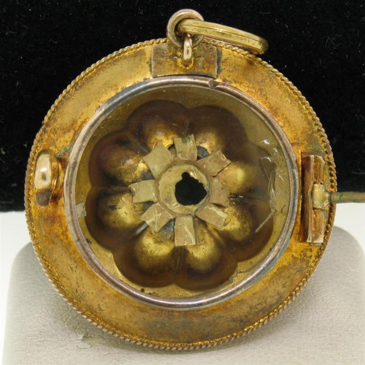 A Victorian era solid 15k yellow gold brooch or pendant locket with a natural round white pearl (3.4mm) and royal blue enamel. Measures 30.5mm in diameter with a 6.1mm bail and weighs a total of 9.60 grams.