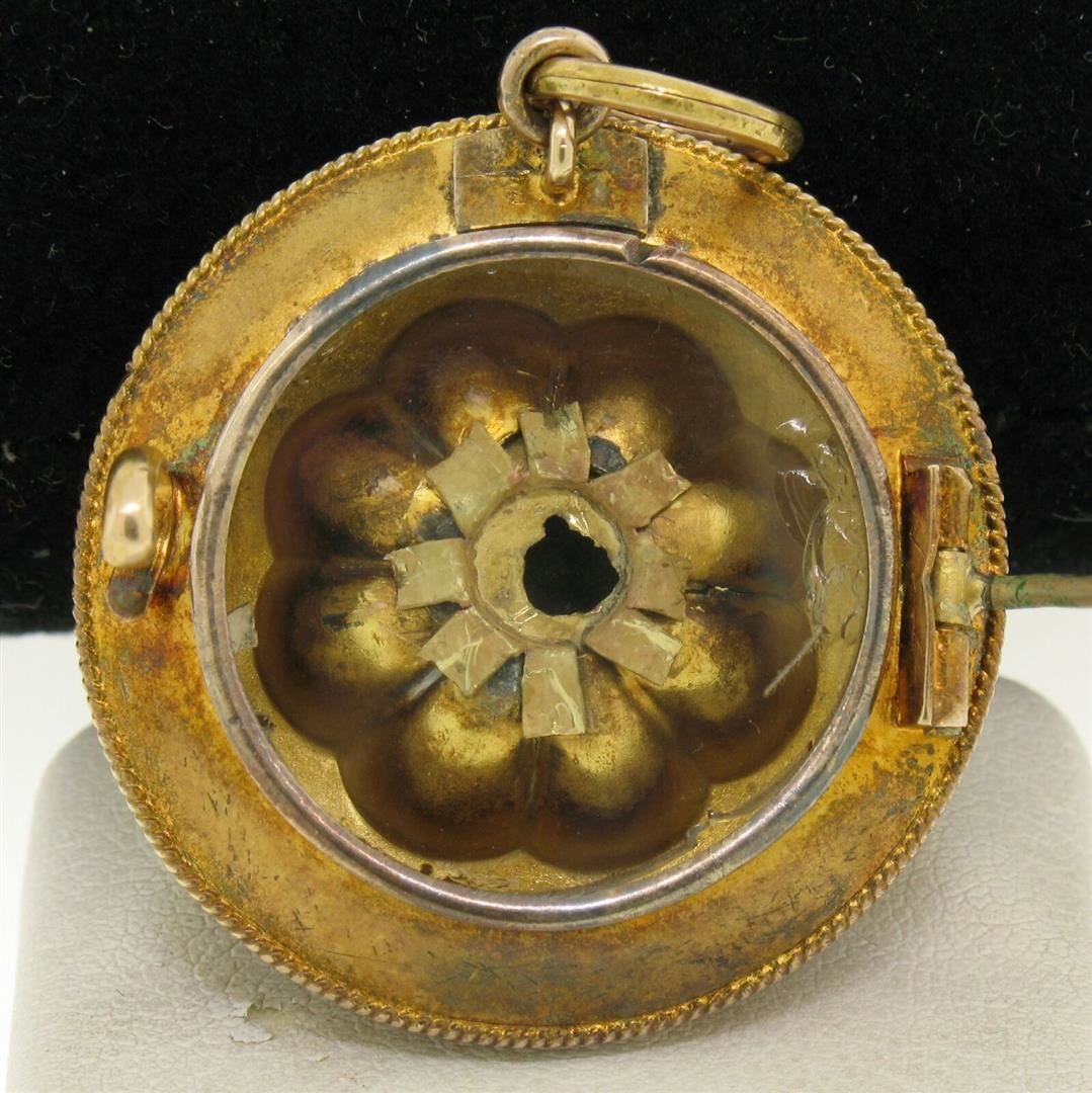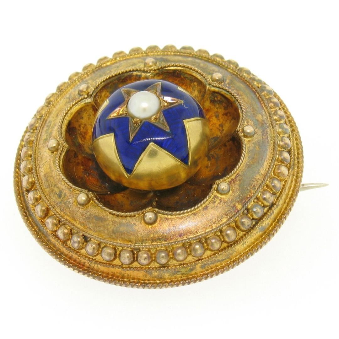 Antique Victorian Etruscan 15k Solid Gold Hair Picture Locket Brooch Pin Pendant. Please see photos and description for all available information. An antique victorian solid 15k yellow gold locket brooch pendant, featuring blue enamel work and 1 natural genuine pearl (3.4mm). Measures 30.5mm in diameter and weighs a total of 9.6 grams.