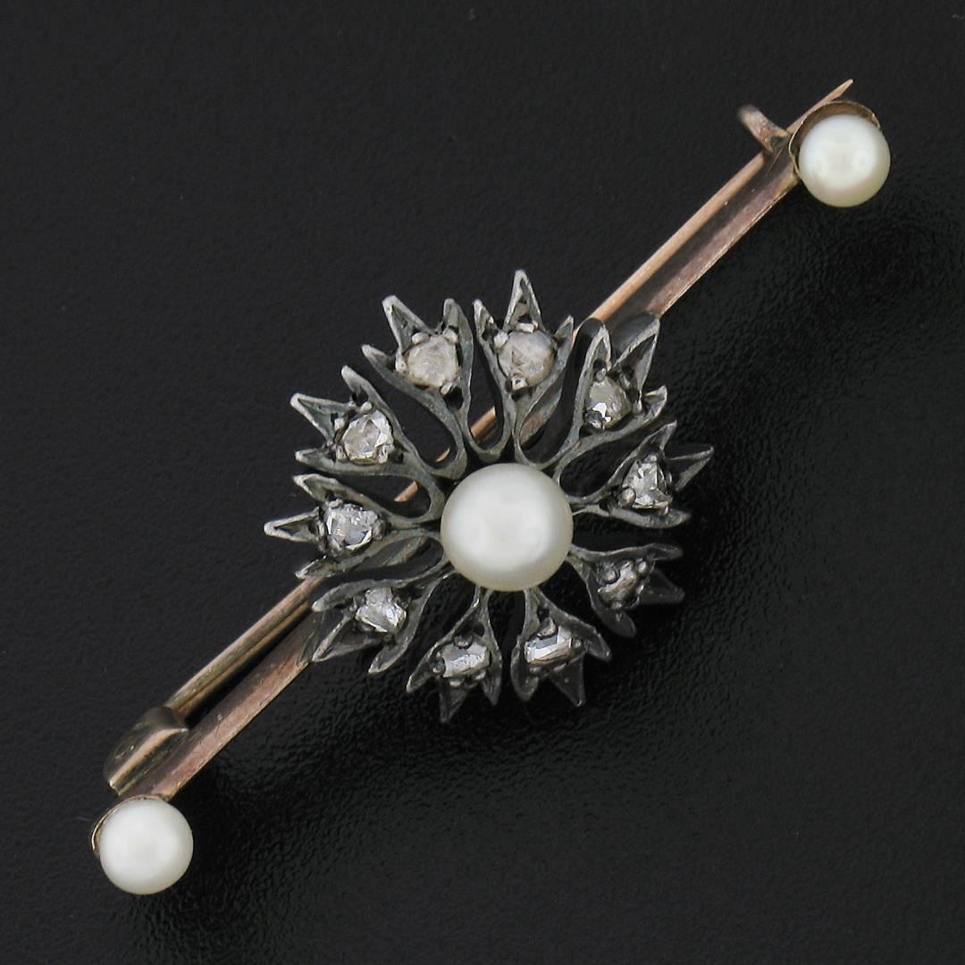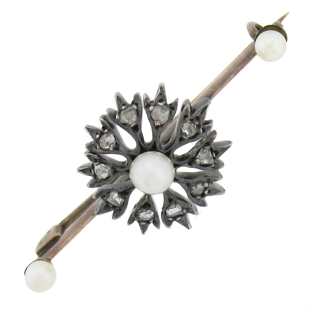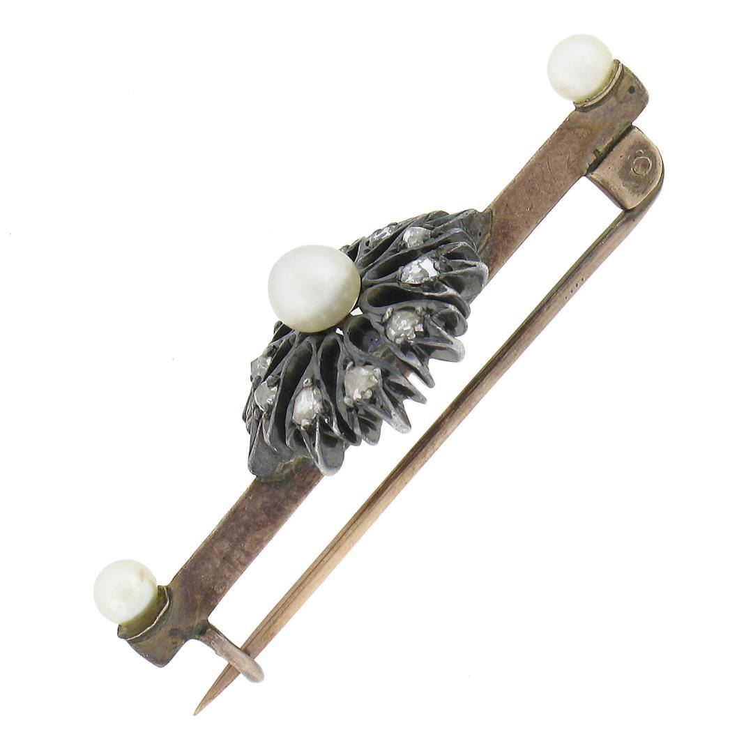 Antique Victorian Gold & Silver 0.30ctw Diamond & Pearl Floral Bar Pin Brooch