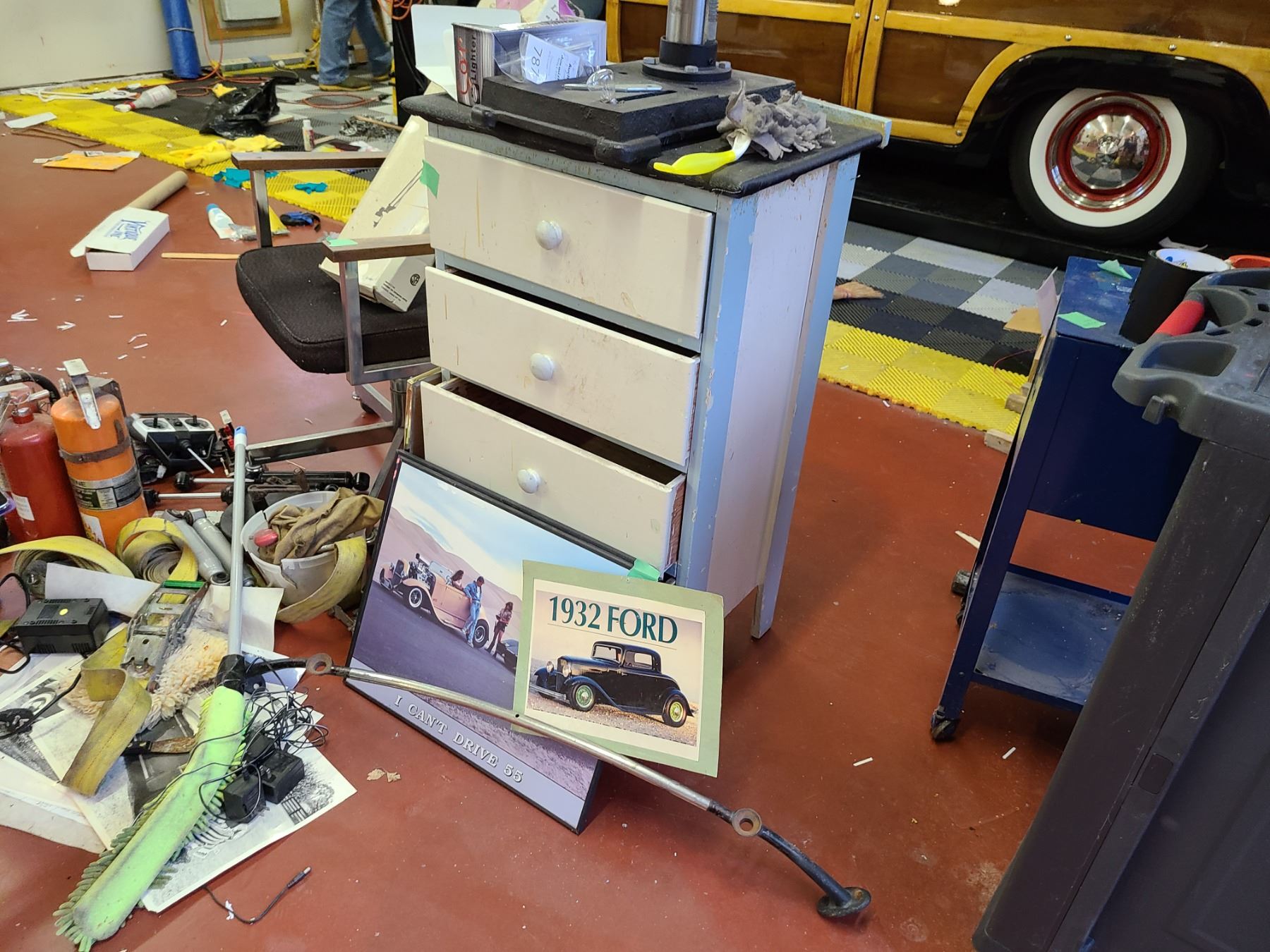Chair, wooden drawers,drill press not included 1932 fender headlights support and more. Pickup at 11