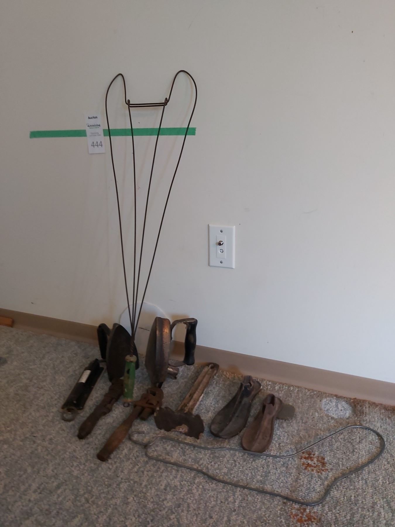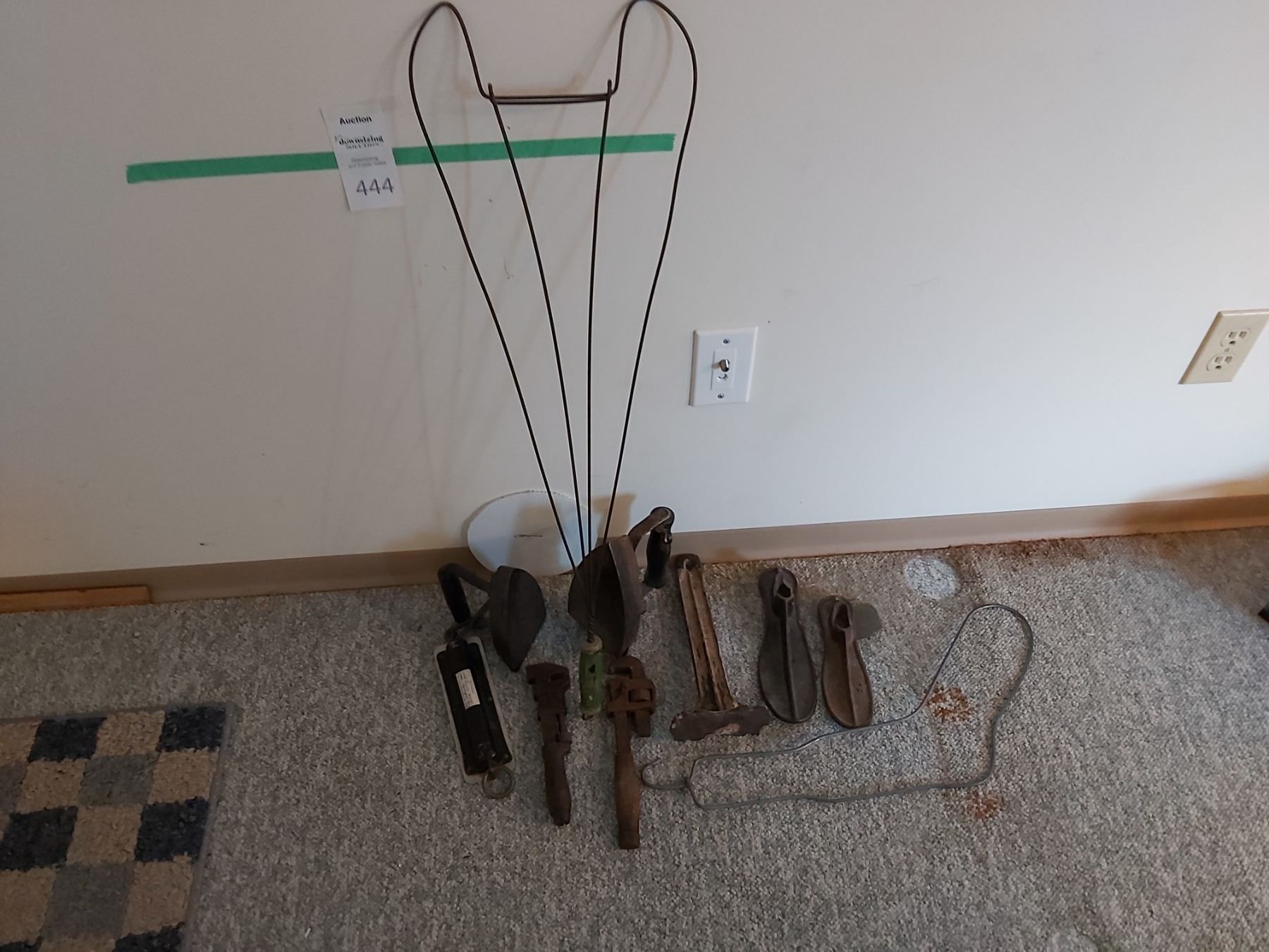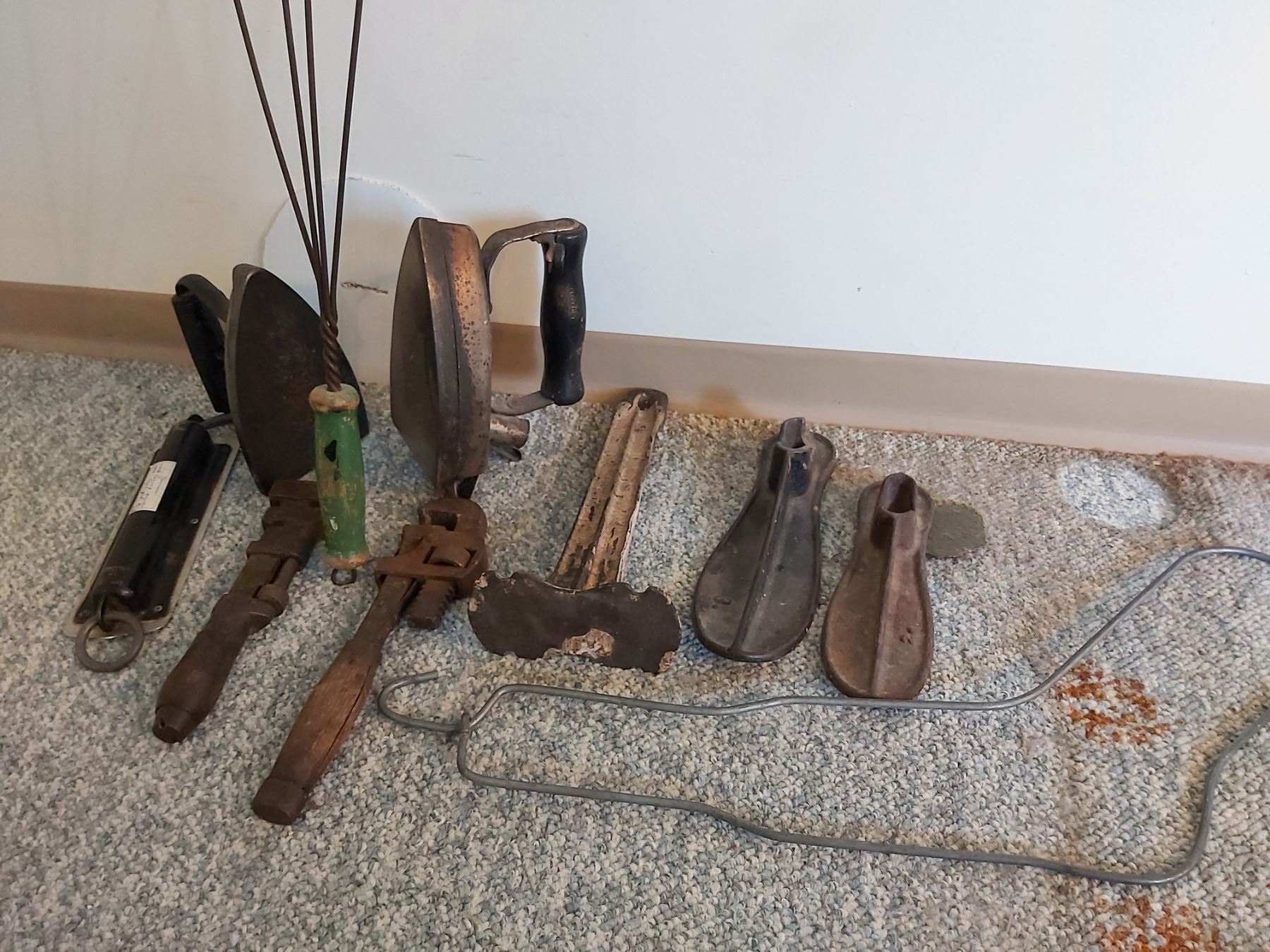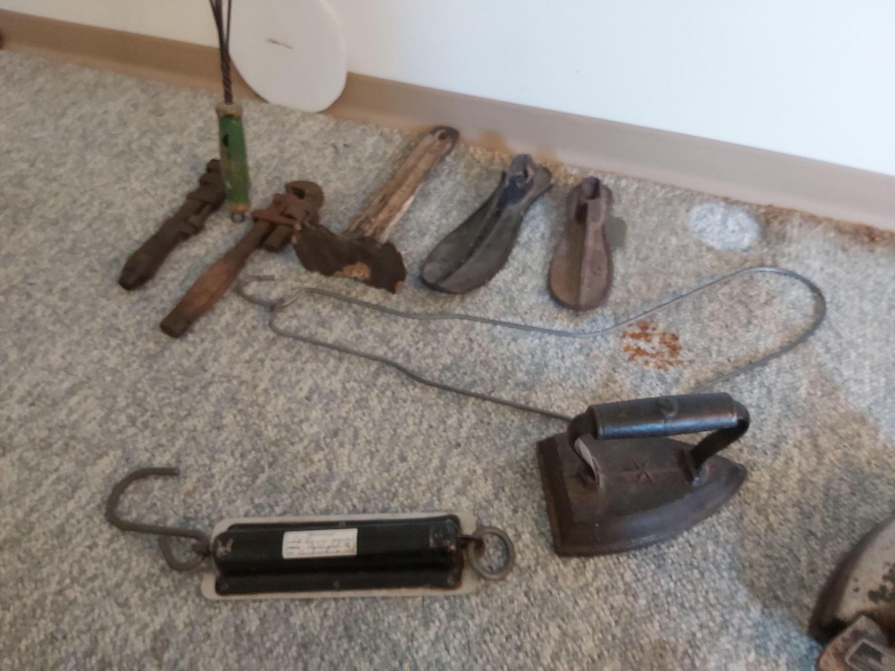 Antique irons, wrenches, rug beater, shoe making forms, and hand scale. Bring boxes.