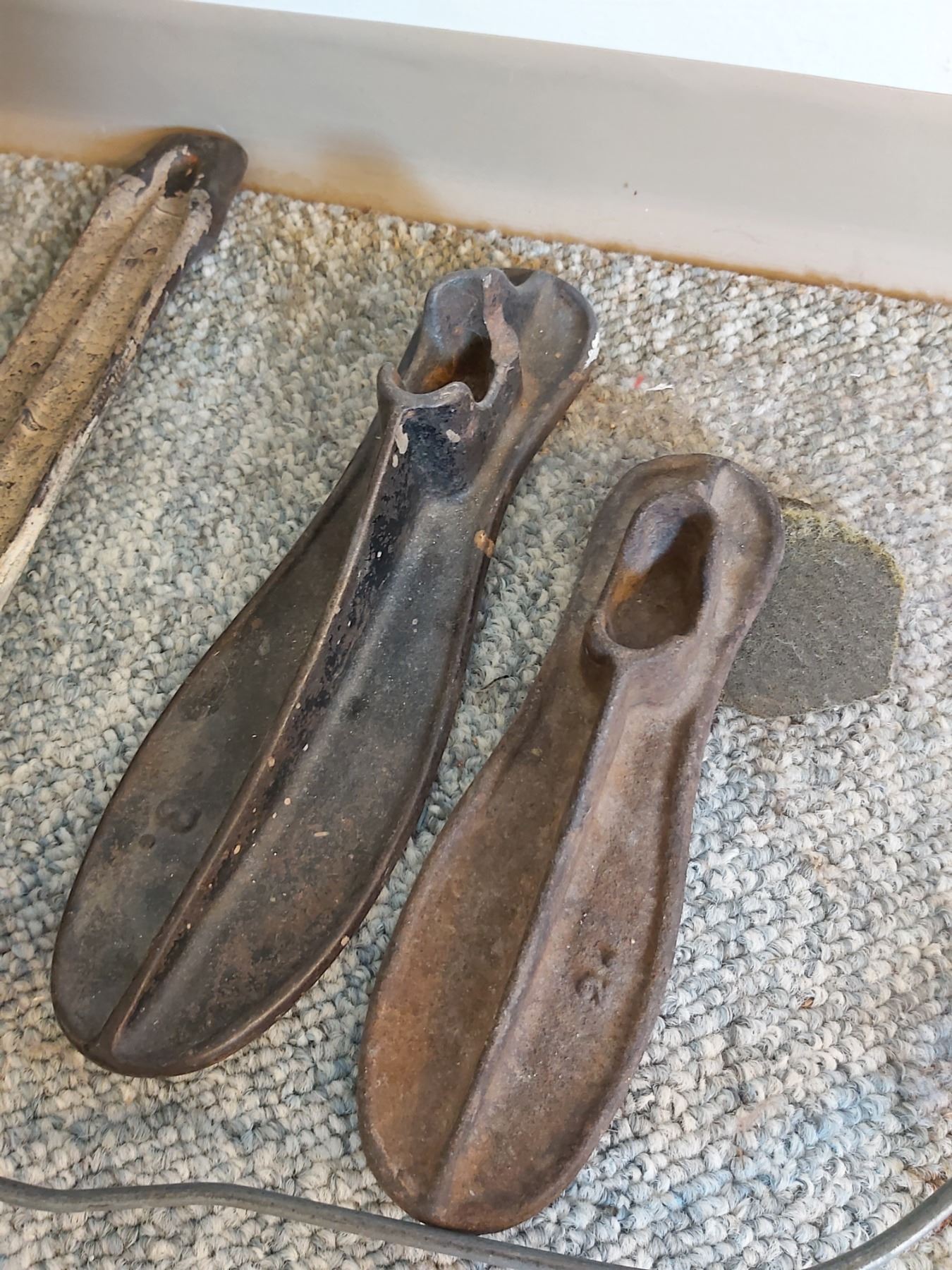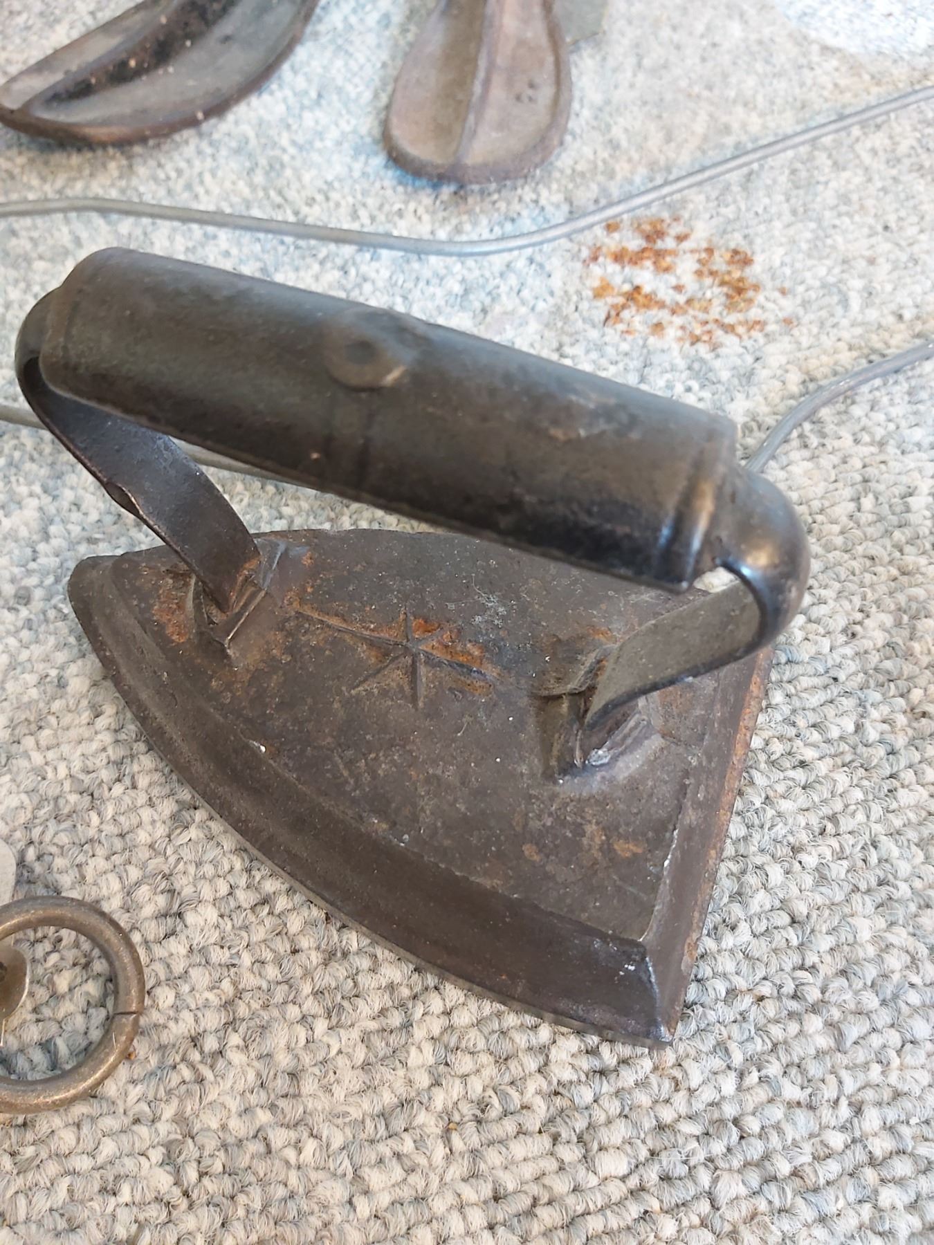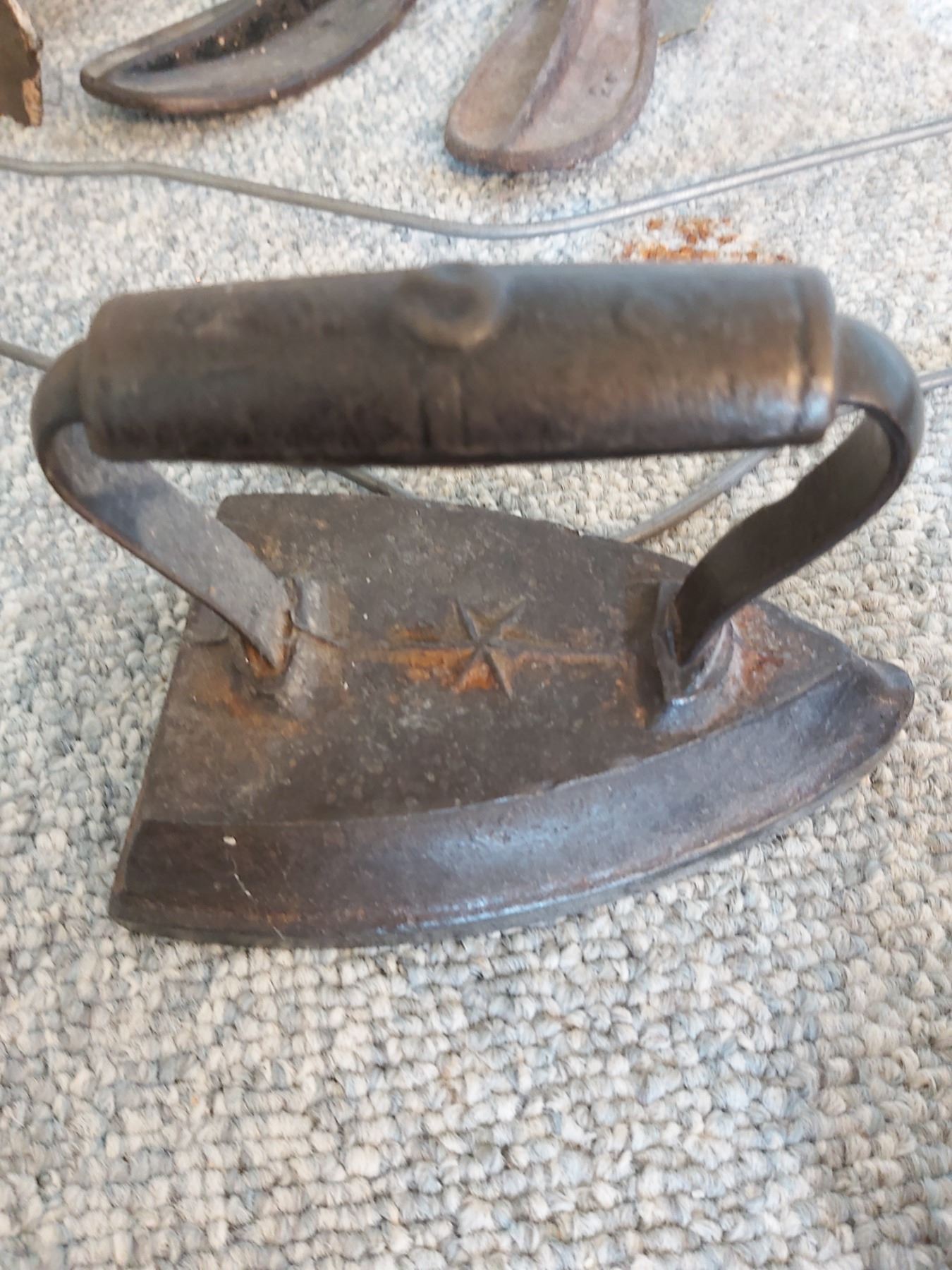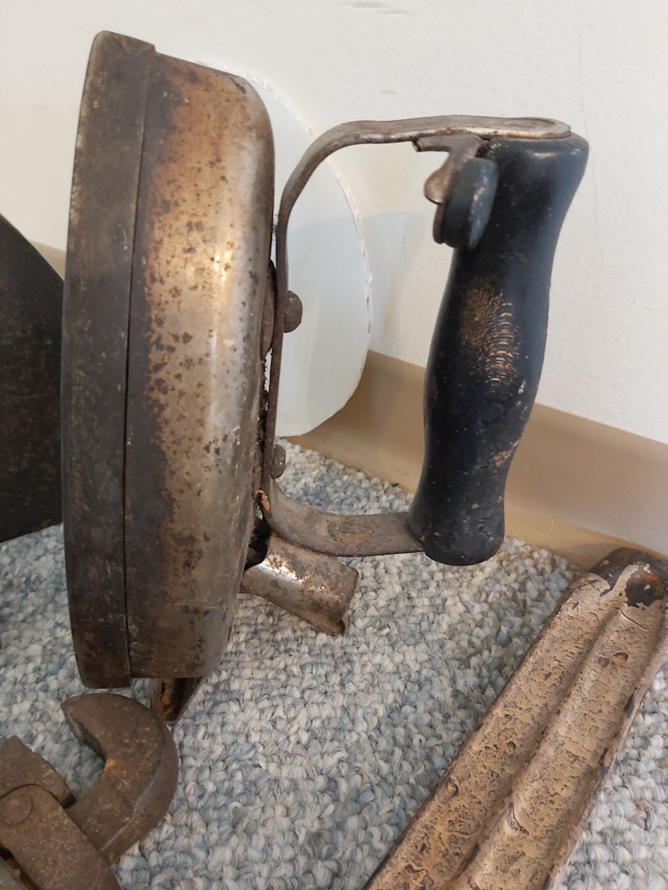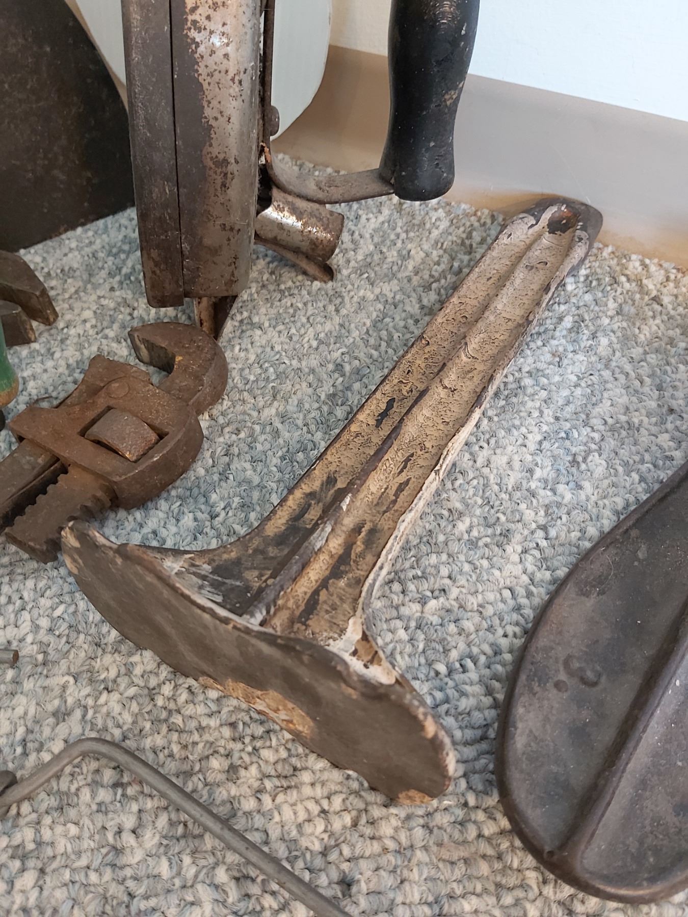 Antique irons, wrenches, rug beater, shoe making forms, and hand scale. Bring boxes.