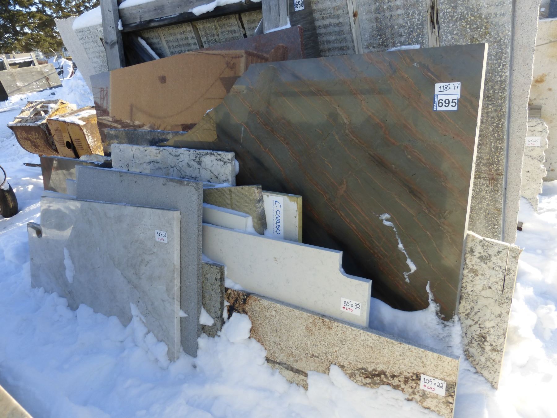Approx. 15- Slabs, Various sizes x 1 1/4" thick, Imperial red, Sapphire blue, Persia pearl Granite, 1 1/4" thick, Copper dunes Quartz and other various colors of Granite and Quartz
