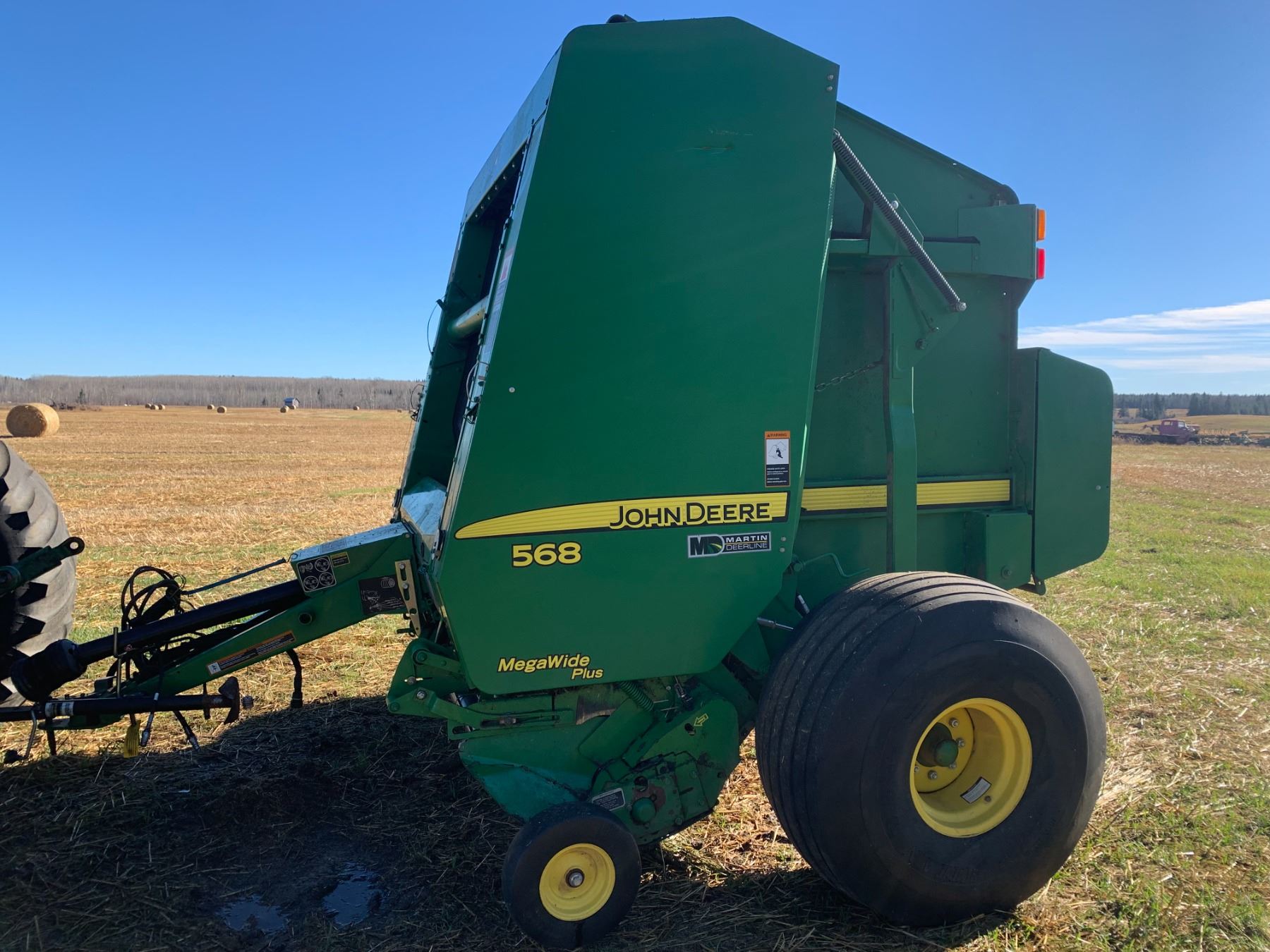 Approx. 2012 JD 568 Round Baler, Mega wide plus, Twine & Net Wrap, 1000 PTO, 3,730 bales, #1E00568XPCC387550, shedded, original owner