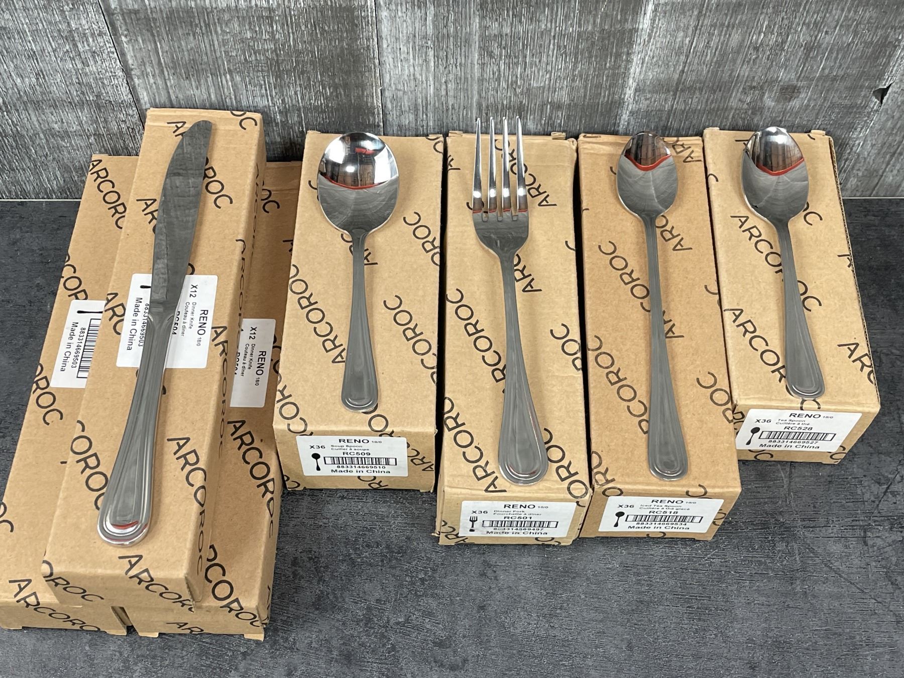 [New In Boxes,] Dinner Forks (RC501 x 36 - 1 box) Dinner Knives (RC504 x 36 - 3 boxes) Bouillon Spoons (RC509 x 36 - 1 box) Ice Tea Spoons (RC518 x 36 - 1 box) Tea Spoons (RC528 x 36 - 1 box)